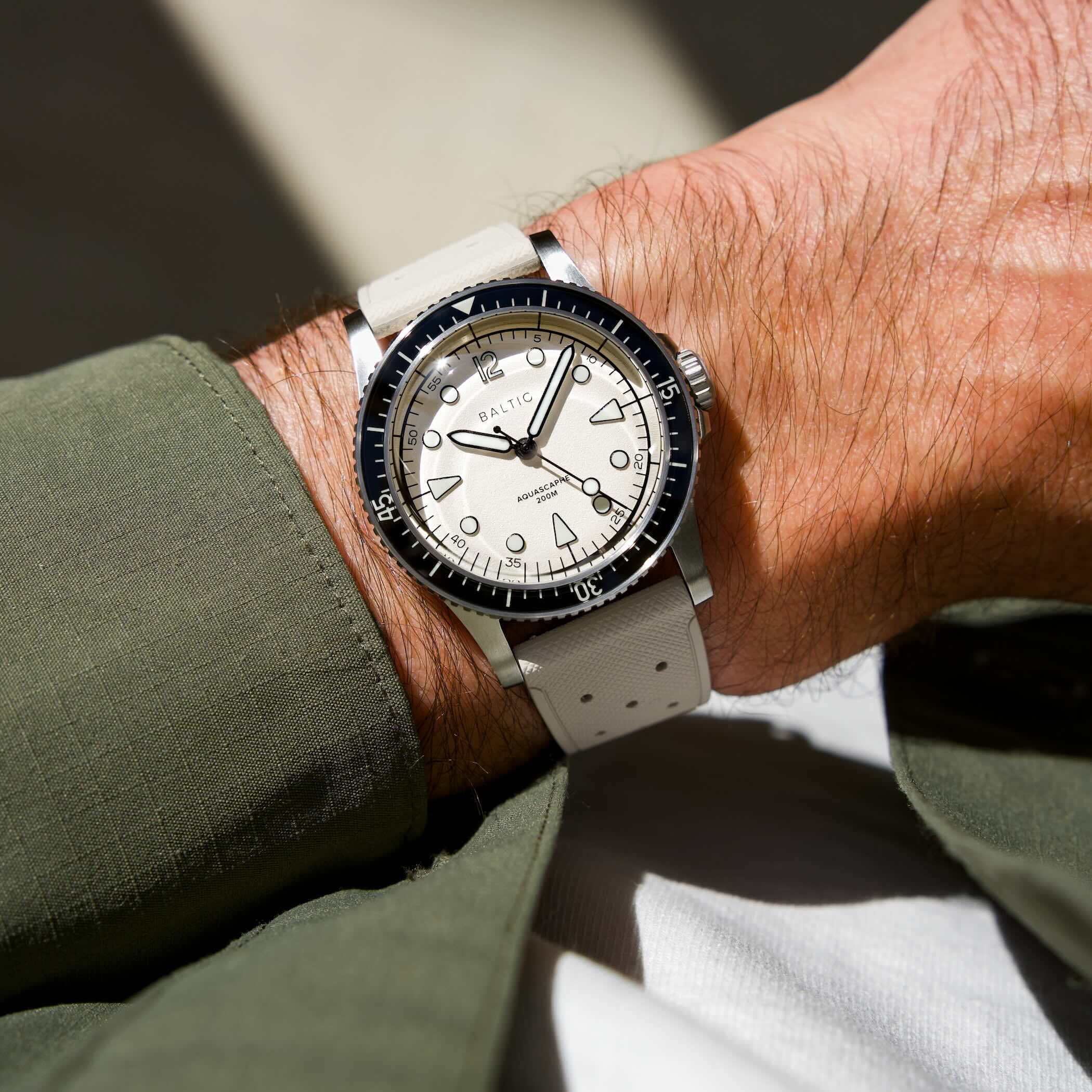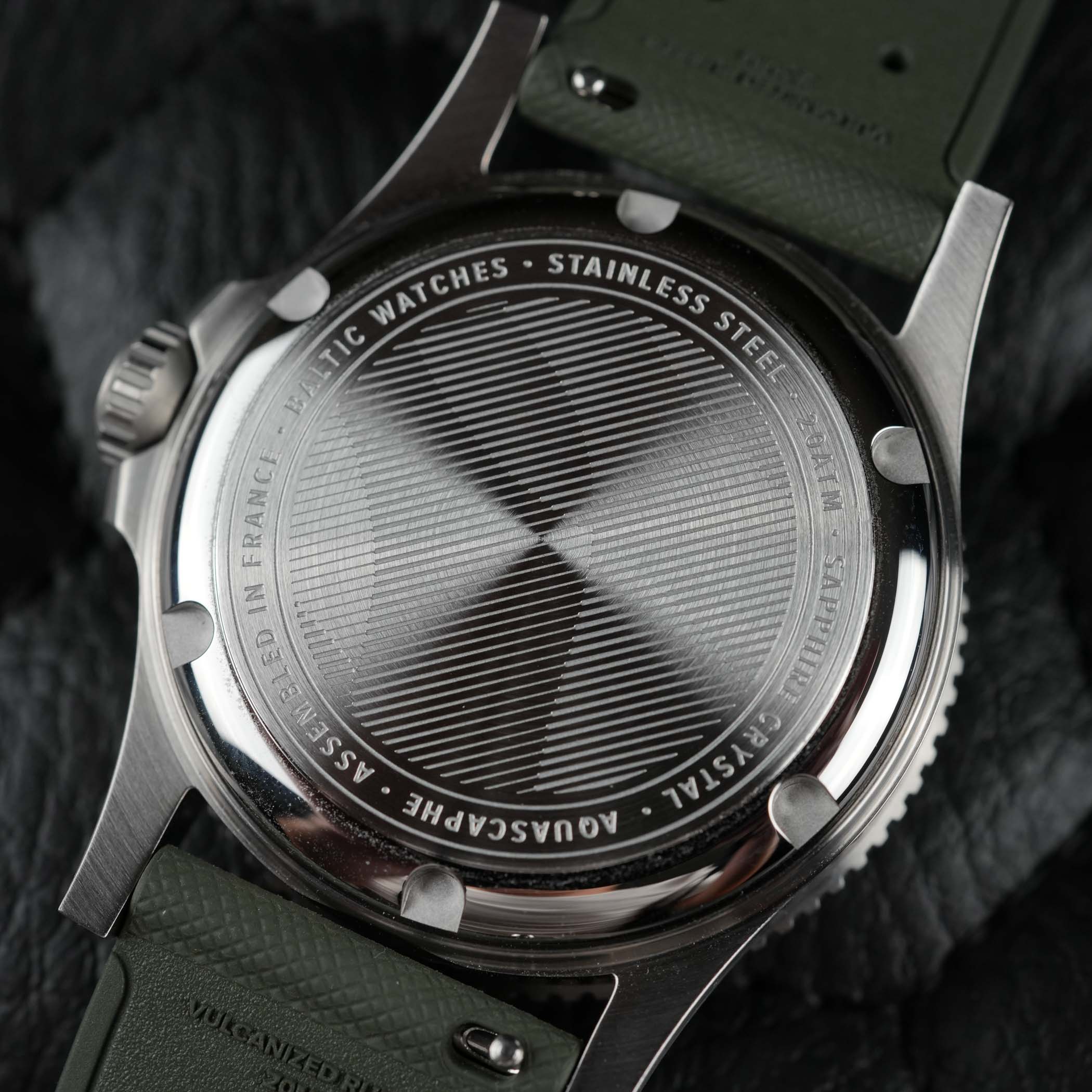 Last, Baltic introduces new FKM rubber straps. Not only has the overall quality been drastically improved compared to the old tropic-style rubber straps (softer and more supple), but they also now have a saffiano leather pattern that’s both original and cool looking. As an alternative, you can still opt for a steel beads of rice or a steel flat link bracelet. All are equipped with quick-release spring bars.