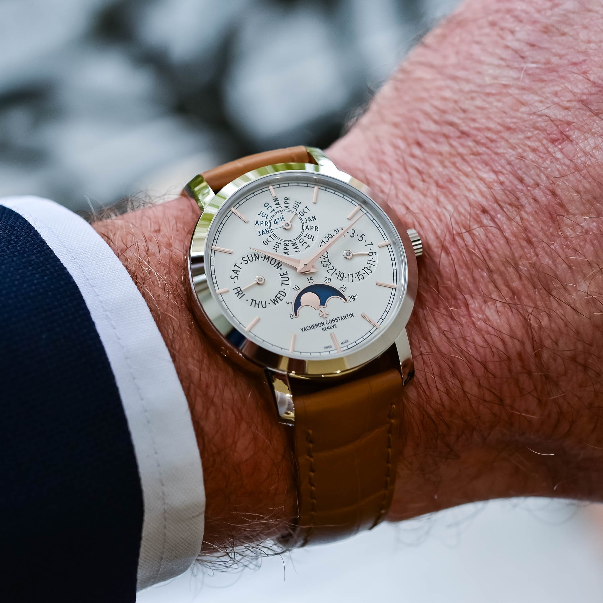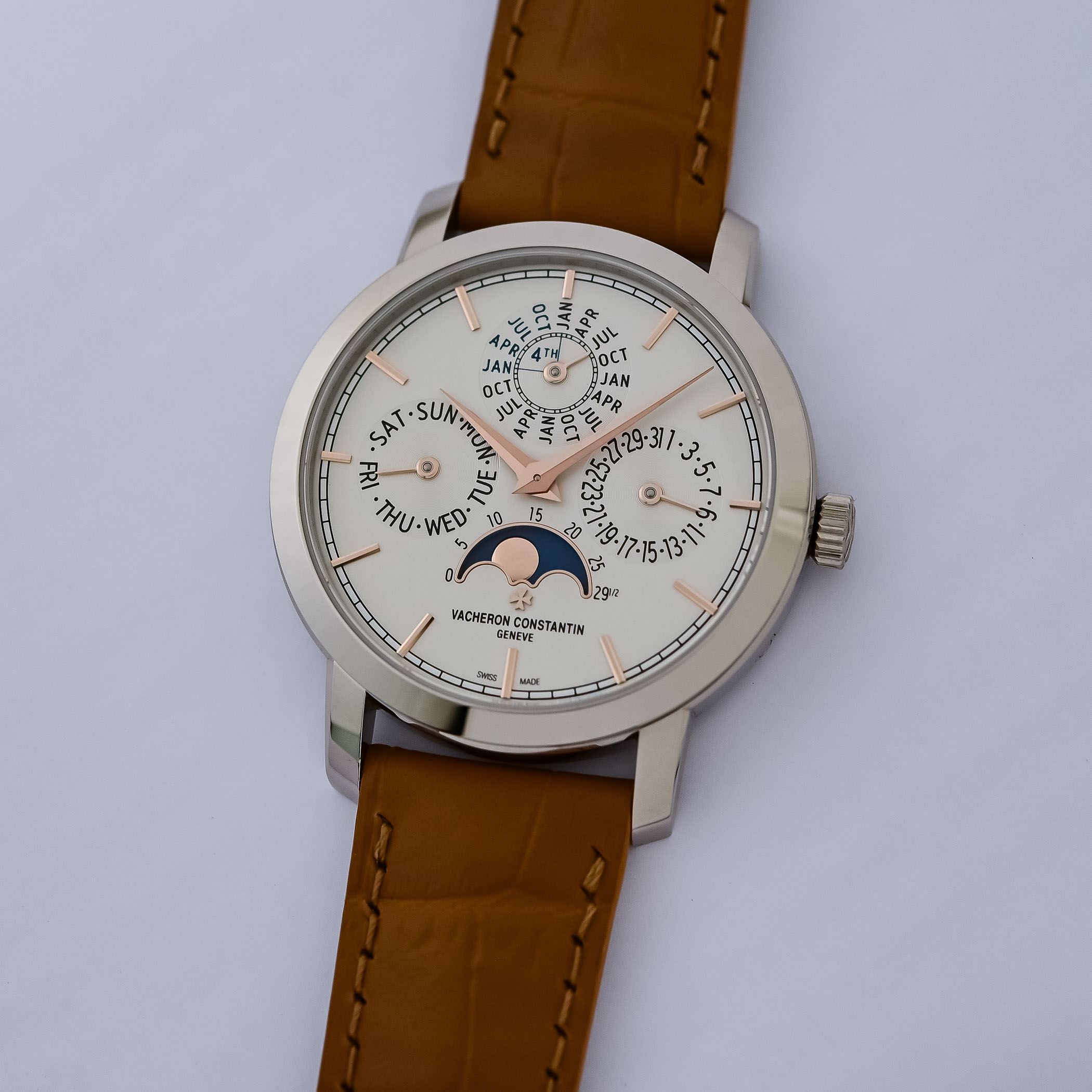Unlike some brands engaged in a battle to produce the leanest calibres and take home trophies, Vacheron’s approach to ultra-thin watchmaking is about striking a balance between technology, aesthetics and robustness. Visible on the caseback, Vacheron’s in-house automatic calibre 1120 QP has 276 components and a thickness of just 4.05mm. The movement oscillates at 19,800vph/2.75Hz and delivers a 40-hour power reserve for the hours, minutes, perpetual calendar (date, day, month, leap year) and ages and phases of the moon. Certified by the Hallmark of Geneva, the movement features Côtes de Genève on the bridges and on the openworked rotor, with the brand’s Maltese Cross emblem, and a 22k gold outer segment.
