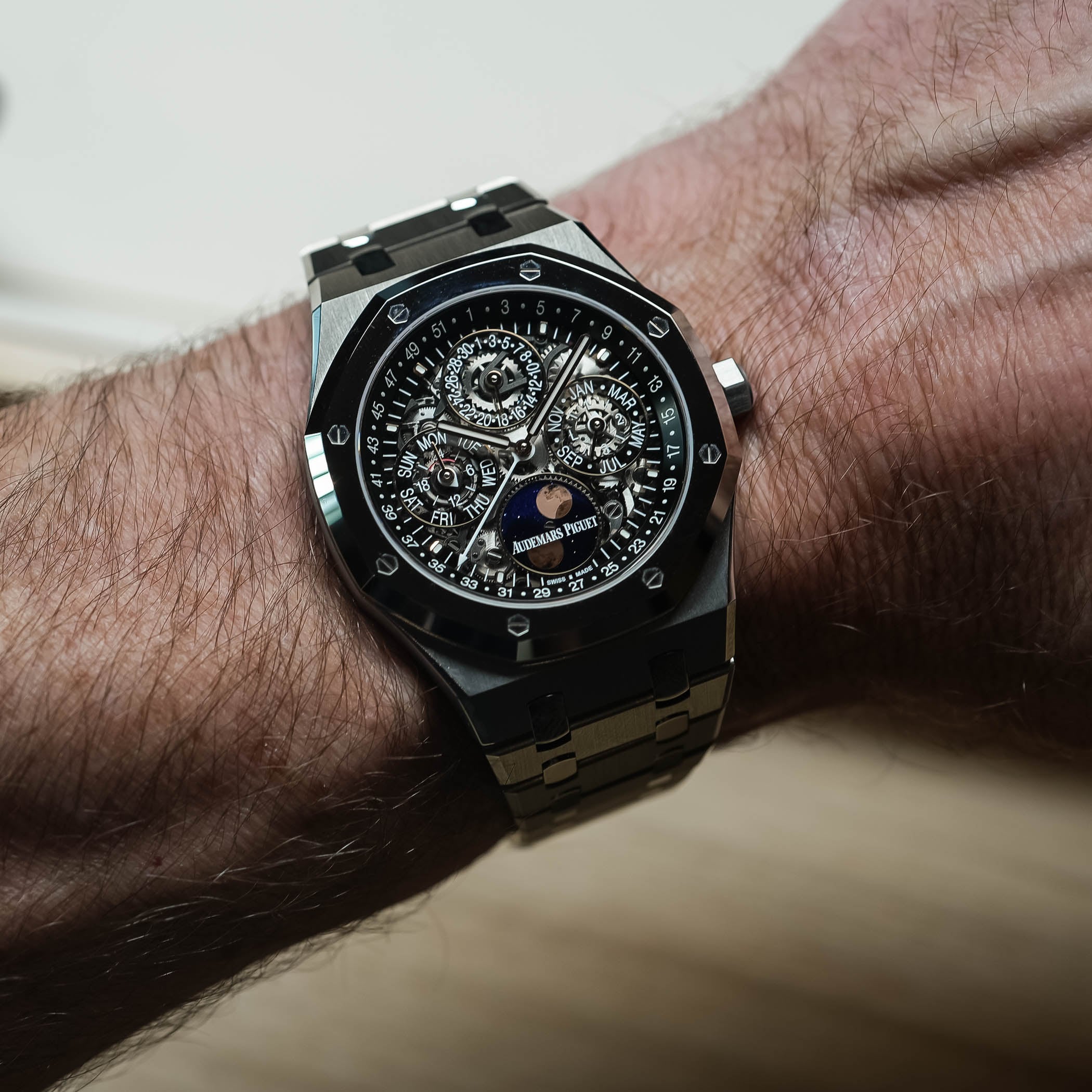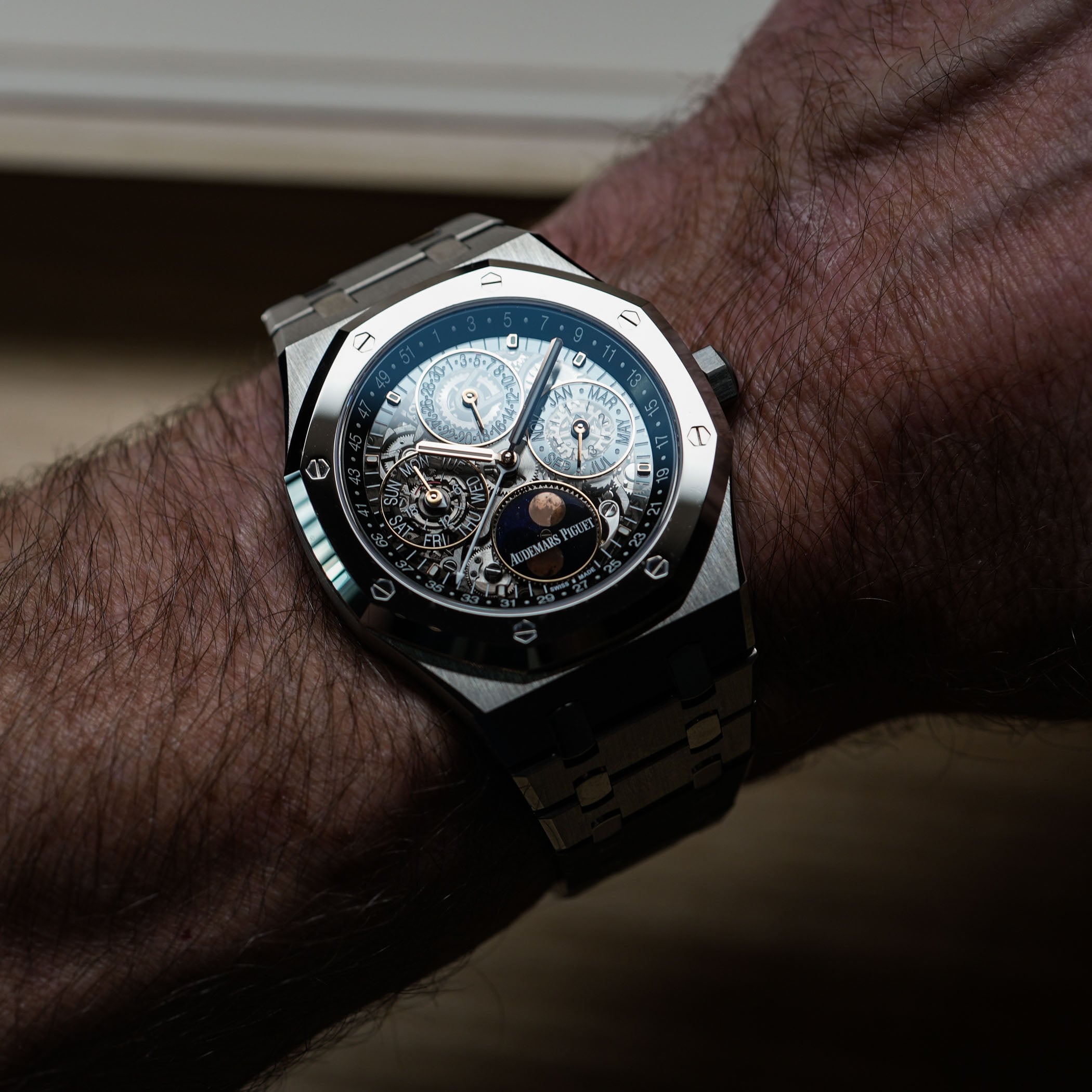 The layout follows a logical European order: day at 9 o’clock with an integrated 24-hour indicator, date at 12, month and leap year at 3, and the moon phase at 6. The week numbers are printed on the inclined inner flange, which is a clever use of space. In practice, apart from the hour and minutes, indicated by the pink gold Royal Oak hands filled with luminous material, the current week number is easiest to pick as it is white on a black flange and indicated by the centrally mounted hand. For the rest of the QP indications, the small pink gold hands do seem a bit mixed in, but a slight twist of the wrist makes the light hit their surfaces at the right angle, and there you have it: all are readable at a glance. This said, overall, the dial feels calmer, still complex, but not visually anxious.