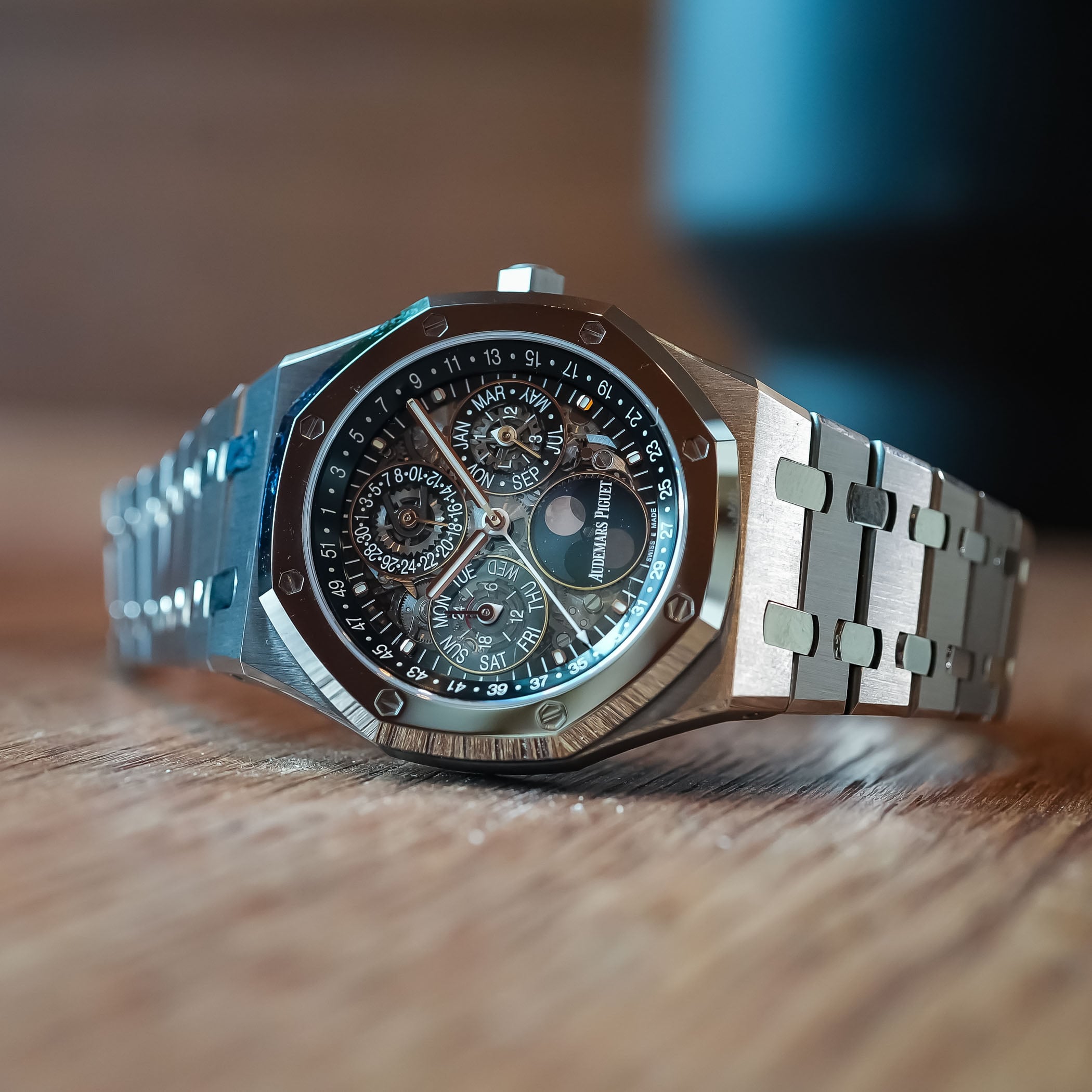 In theatre, experimental shows often walk a fine line between spectacle and confusion; the same happens with openworked/skeletonised perpetual calendars. Here, AP gets the balance essentially right. The sapphire dial exposes Calibre 7139 while retaining a surprisingly good level of legibility. There´s visually pleasant depth; the smoked-on-the-edge subdials for the calendar indications float above the movement without dissolving into it.