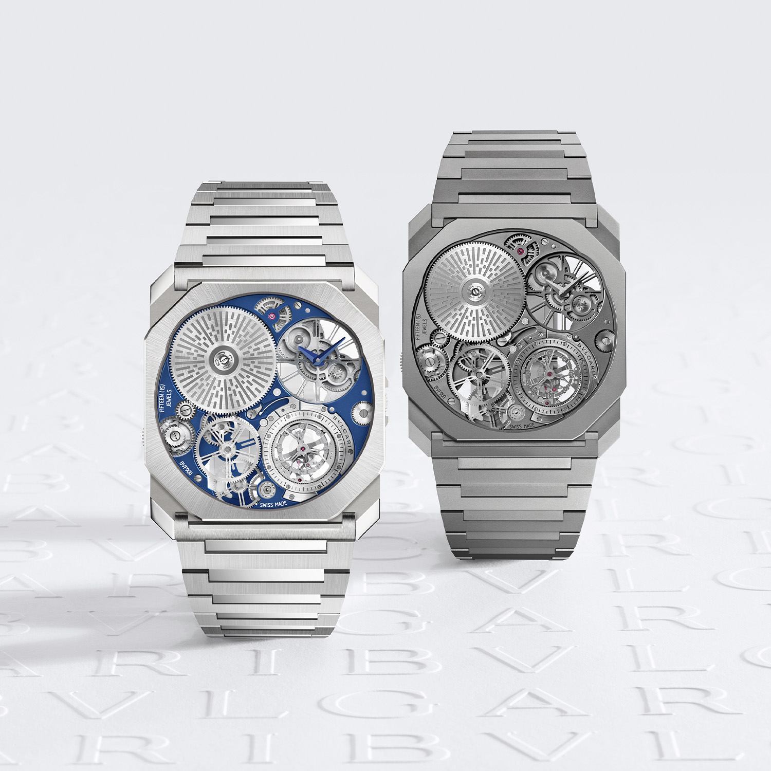 Dial-side, the Octo Finissimo Ultra Tourbillon Platinum brings subtle updates. Blue PVD accents appear on the skeletonised time display and mainplate, bringing contrast to the technical layout. The exposed ratchet wheel, in sandblasted steel with circular satin finish and geometric engraving, reinforces the mechanical aesthetic. As before, the display is reduced to essentials, with hours and minutes positioned off-centre and the flying tourbillon integrated directly into the main structure, at 5 o’clock.