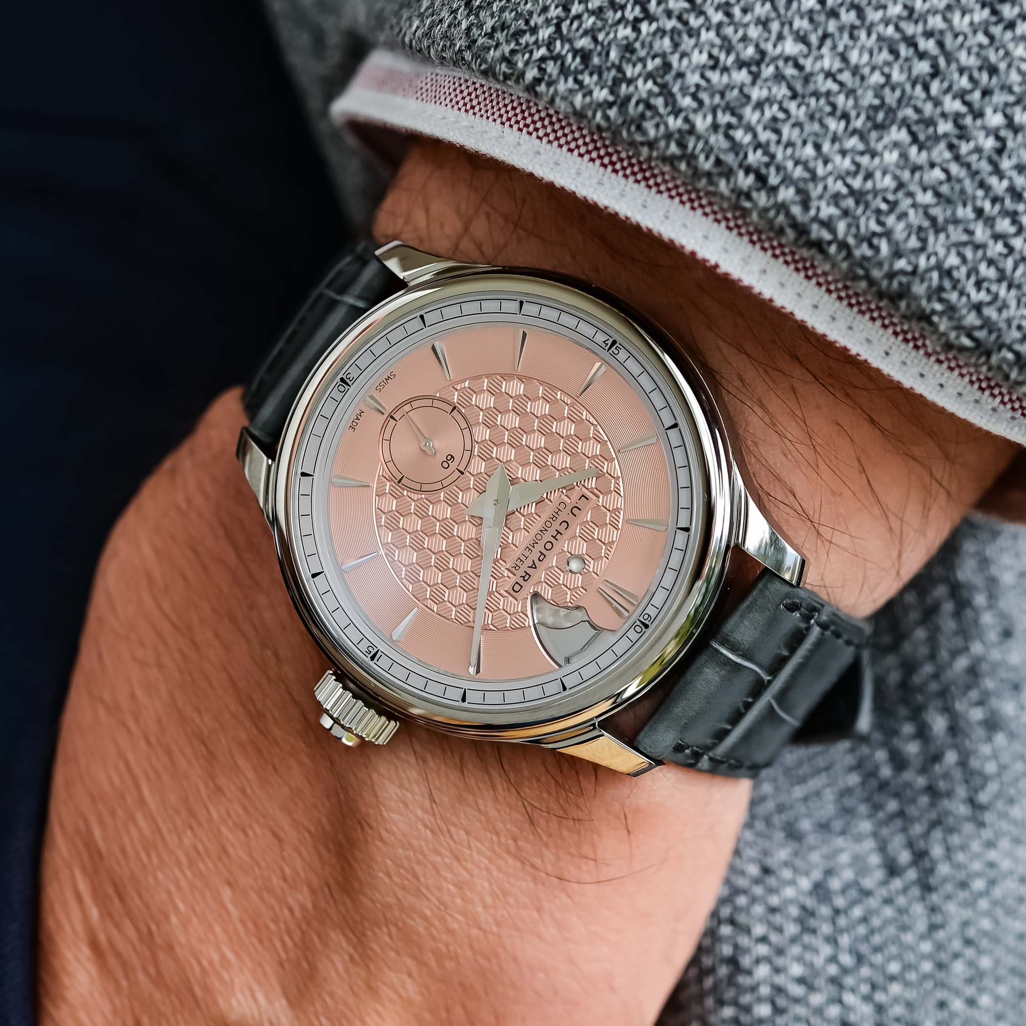 Using an 18k ethical rose gold base, the new salmon-coloured dial is decorated with a hand-guilloché honeycomb pattern in the centre, honouring founder Louis-Ulysse Chopard’s adoption of the beehive and bees as symbols engraved on movements and cases through the 1920s. The guilloché medallion is surrounded by a snailed chapter ring with applied rhodium-plated chevron hour indices and a distinctive cut-out area at 12:30 revealing the mirror-polished hammer and a small circular perforation at noon indicating the chiming status (white for active, ruthenium for silent). The Dauphine hands, also rhodium-plated, glide over the hour markers and snailed small seconds counter at 6 o’clock. The peripheral railway-style minutes track engraved on the sapphire crystal features 5-minute chevron-shaped markers.