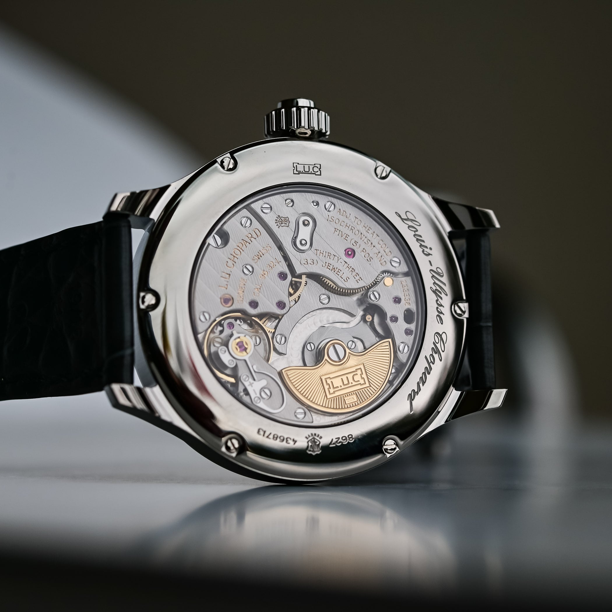 The exhibition caseback reveals some of the 275 hand-finished components of the COSC chronometer-certified L.U.C 96.32-L movement (calibre 96 base), including the 22k gold micro-rotor, the swan-neck regulator, and the bridges decorated with Côtes de Genève. Equipped with Chopard’s Twin Technology, the twin stacked barrels deliver a 65-hour power reserve. The movement and watch are also distinguished by the Poinçon de Genève hallmark.