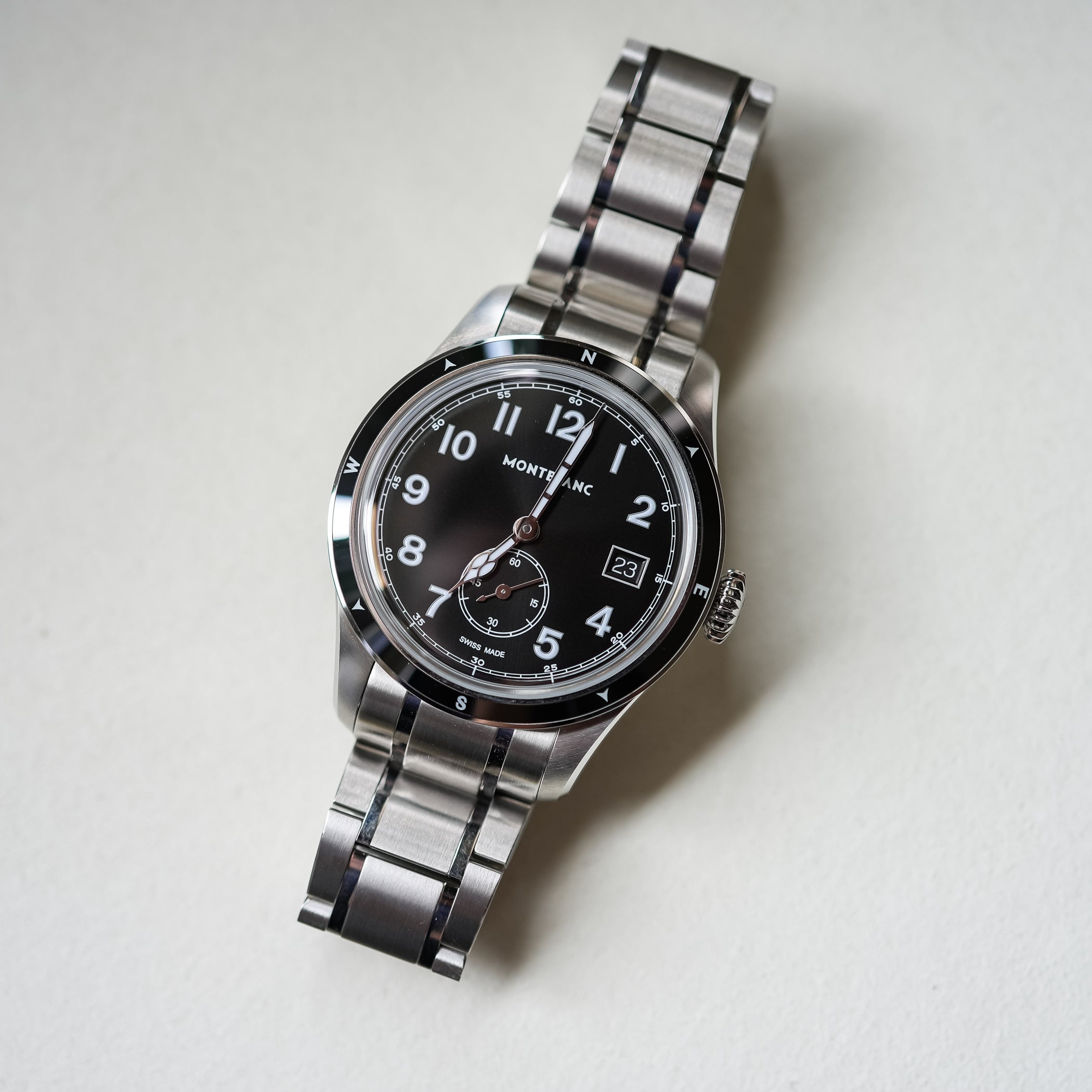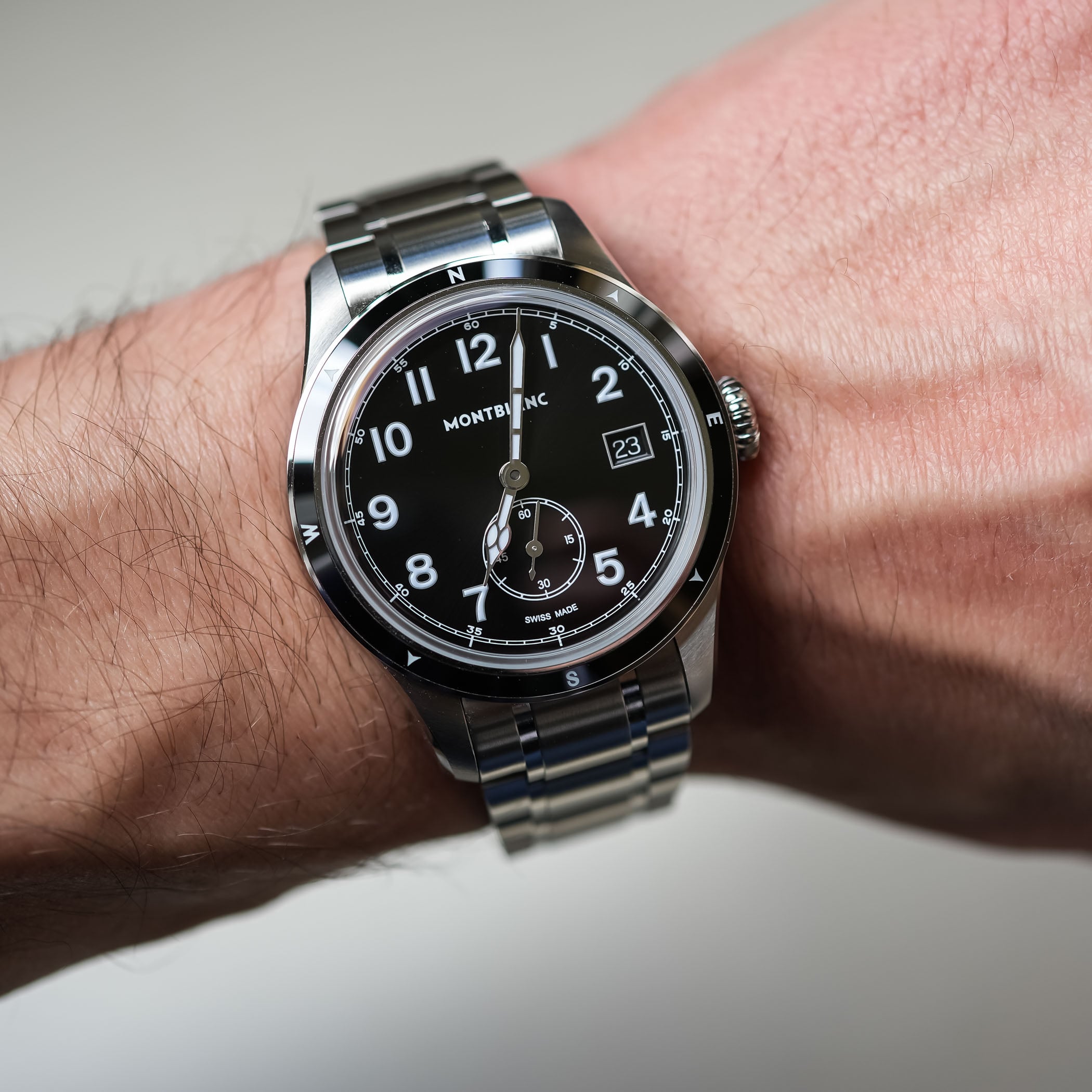 Quick Facts – 38mm x 11.7mm – stainless steel case, satin-brushed and polished – fixed bezel with black ceramic insert and cardinal compass points – sapphire crystal front and back – 100m water resistance – black lacquered dial with white luminescent Super-LumiNova hands – small seconds at 6 o’clock – calibre MB 24.16 – automatic – 28,800vph (4Hz) – 38-hour power reserve – 0 Oxygen construction – stainless-steel bracelet and additional black and blue saffiano calf leather strap – EUR 4,000