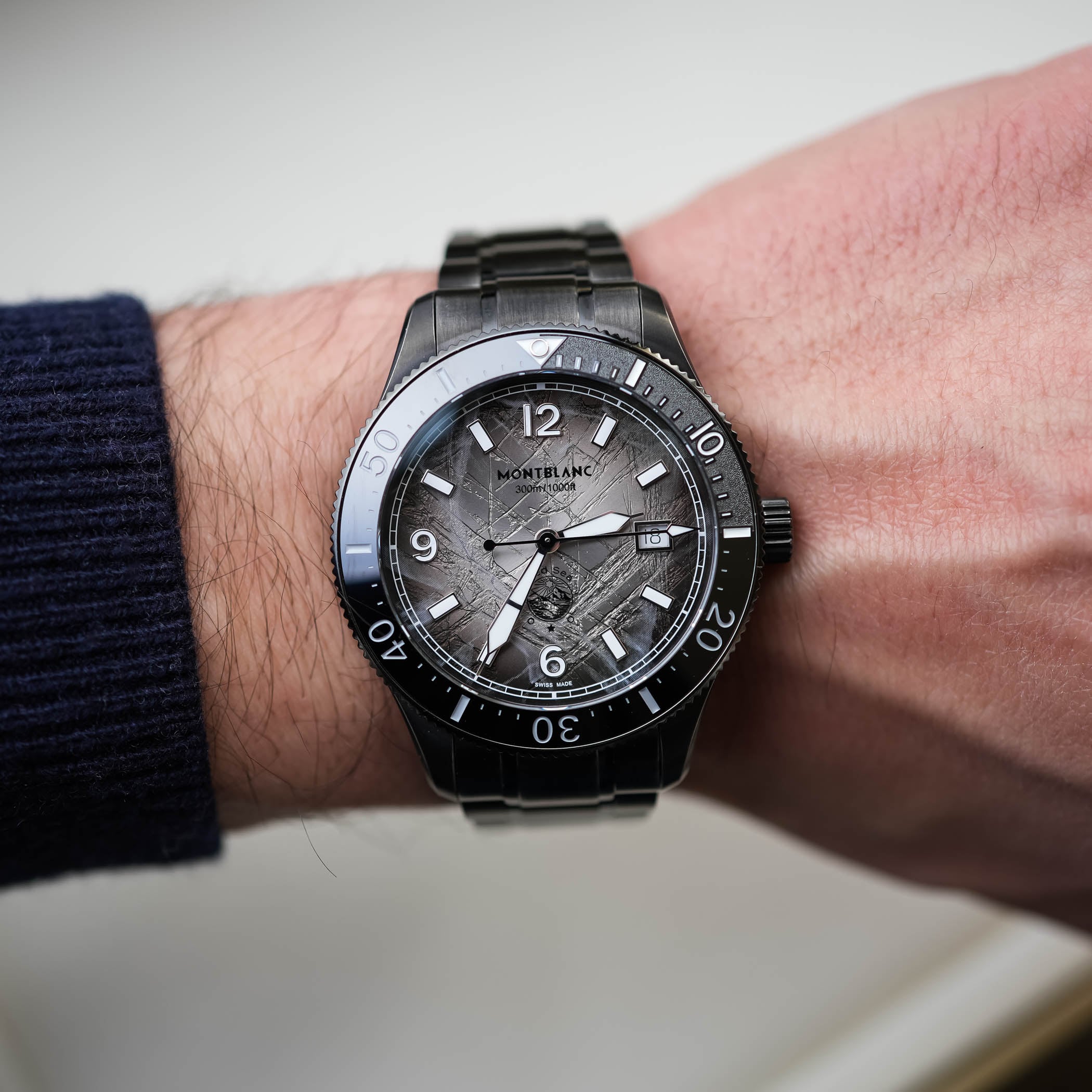 Quick Facts – 41mm x 12.9mm – stainless steel case, polished and satin finished – unidirectional rotating bezel with black ceramic insert – sapphire crystal – screw-down crown – 300m water resistance – grey sfumato glacier dial – Super-LumiNova – calibre MB 24.17/SW200 – automatic – 28,800vph (4Hz) – 38-hour power reserve – 0 Oxygen construction – distressed steel bracelet and double-folding clasp with fine adjustment system – EUR 5,300