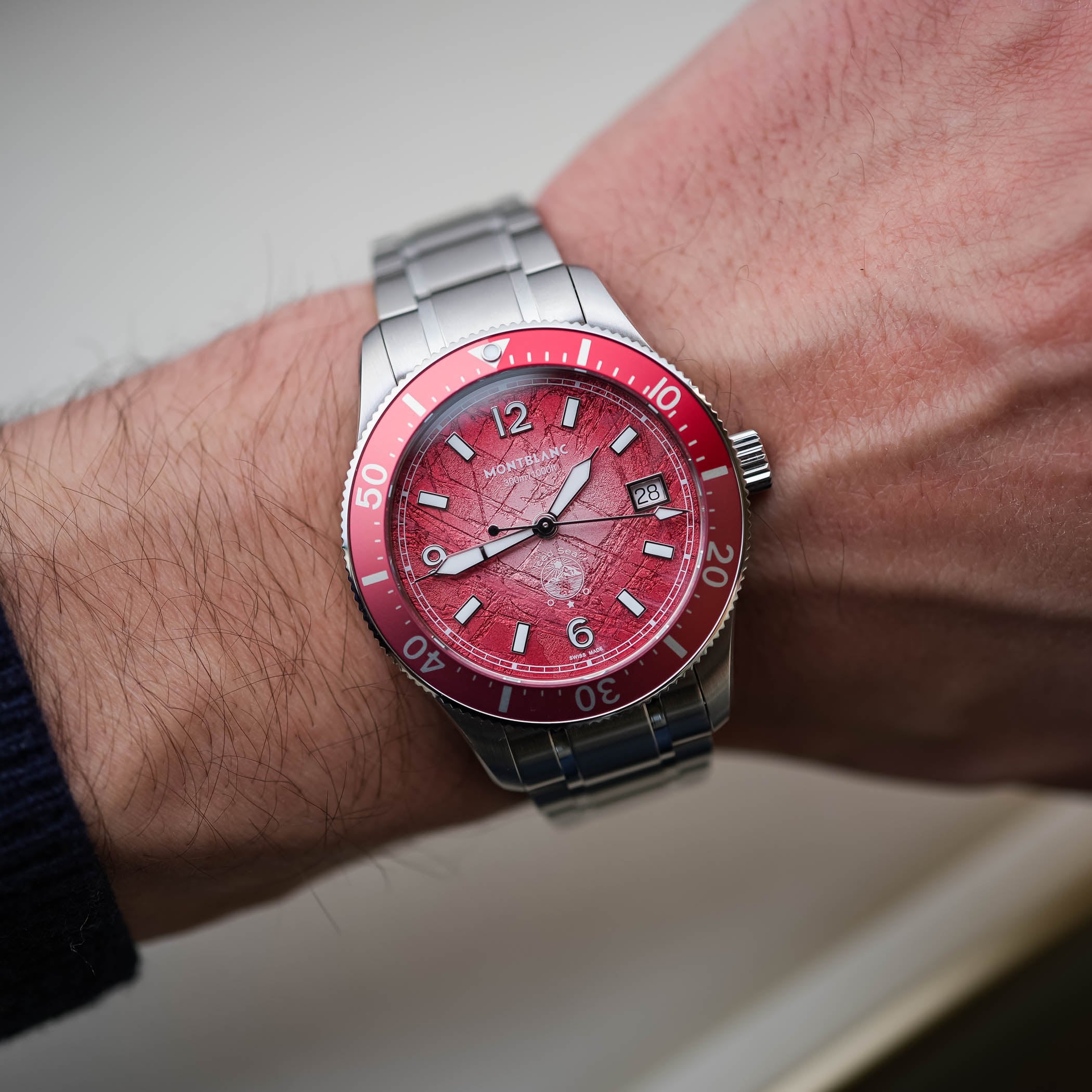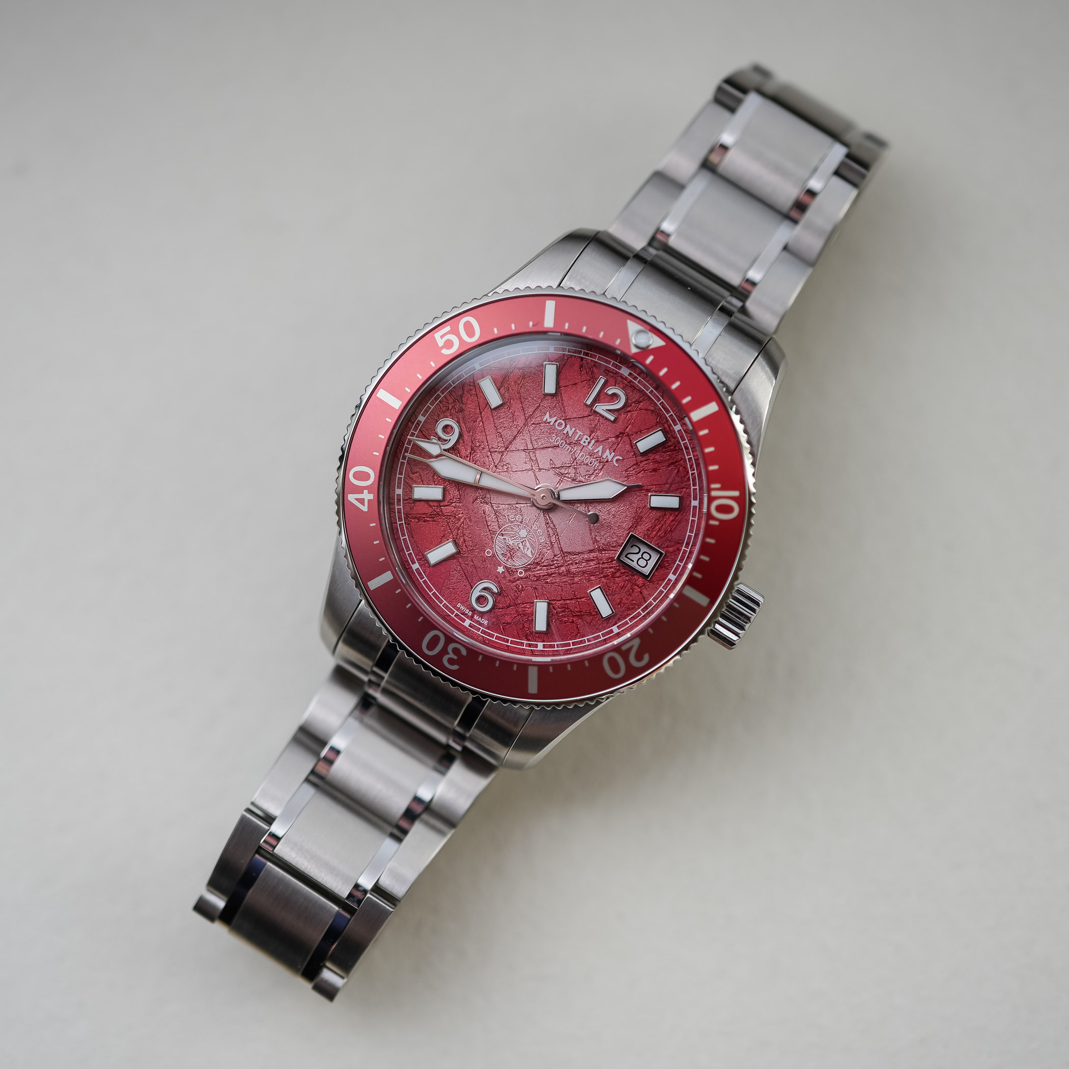 Quick Facts – 38mm x 12.3mm – stainless steel case, polished and satin finished – unidirectional rotating bezel with bi-colour aluminium insert – sapphire crystal – screw-down crown – 300m water resistance – coral glacier dial – Super-LumiNova – calibre MB 24.17/SW200 – automatic – 28,800vph – 38-hour power reserve – 0 Oxygen construction – interchangeable coral red rubber strap or stainless steel bracelet – stainless steel double-folding clasp with fine adjustment system – limited edition of 300 pieces – EUR 4,500