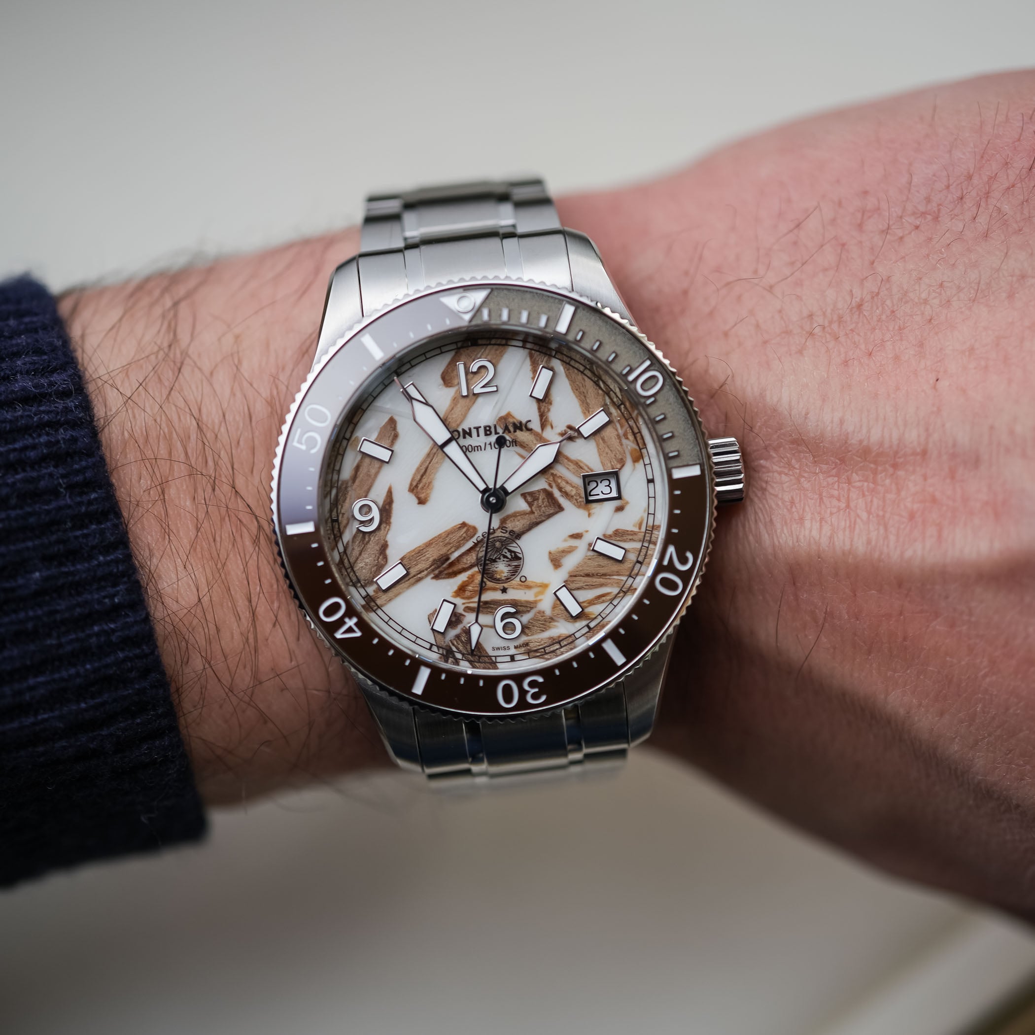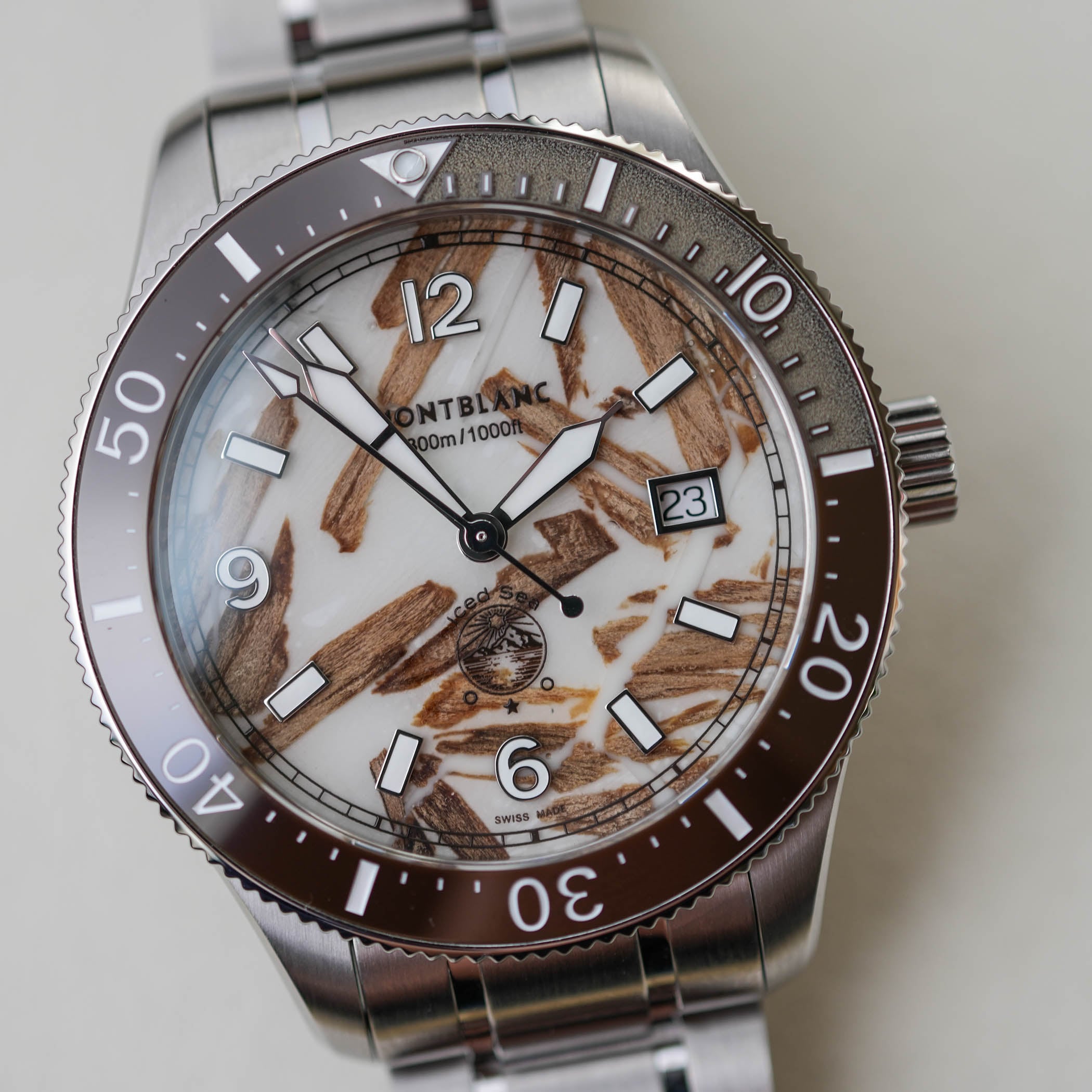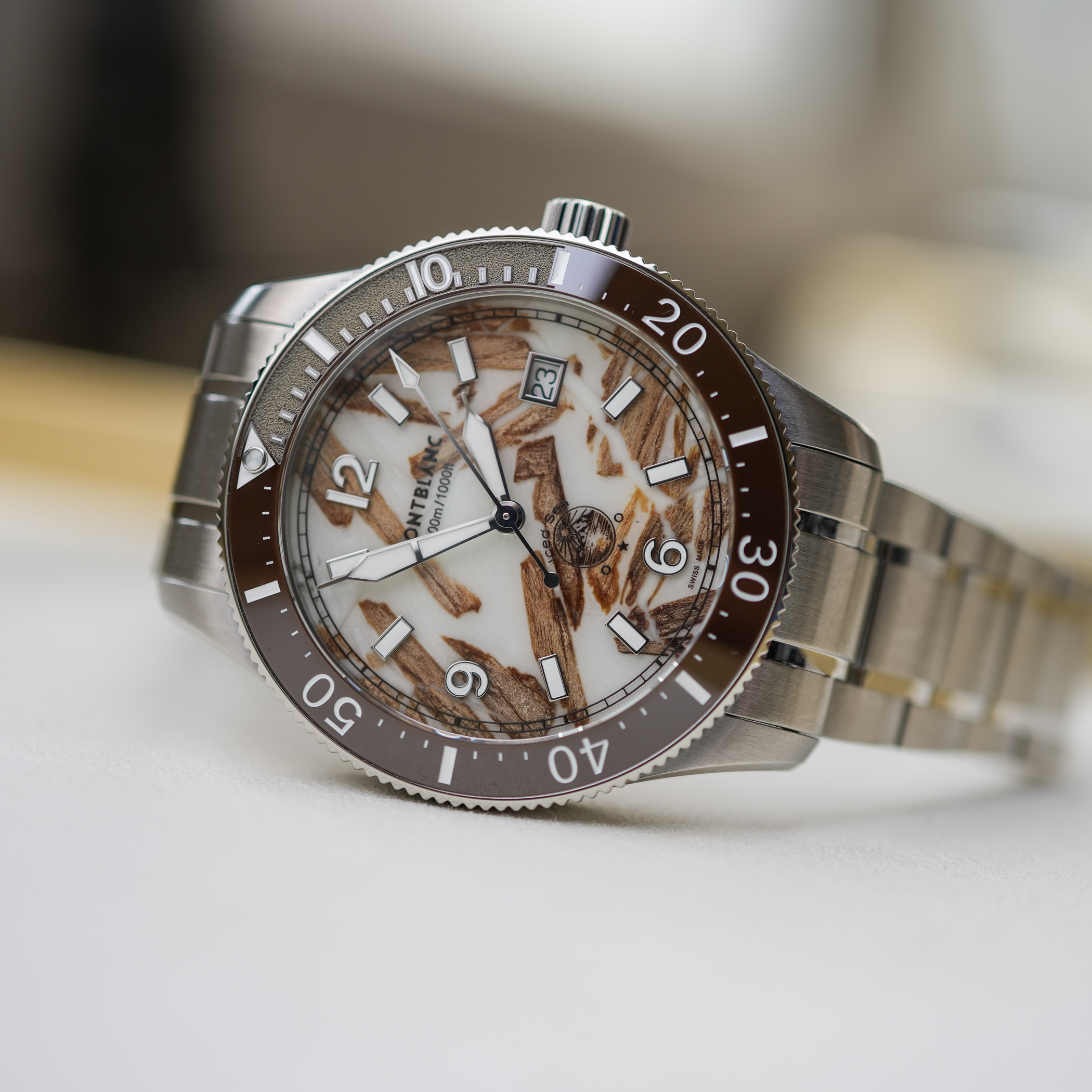 Quick Facts – 41mm x 12.9mm – stainless steel case, polished and satin finished – unidirectional rotating bezel with brown ceramic insert – sapphire crystal – screw-down crown – 300m water resistance – dial made from subfossil wood set in resin – Super-LumiNova – calibre Calibre MB 24.17/SW200 – automatic – 28,800vph – 38-hour power reserve – 0 Oxygen construction – interchangeable stainless steel bracelet and double-folding clasp with fine adjustment system– limited edition of 700 pieces – EUR 5,900