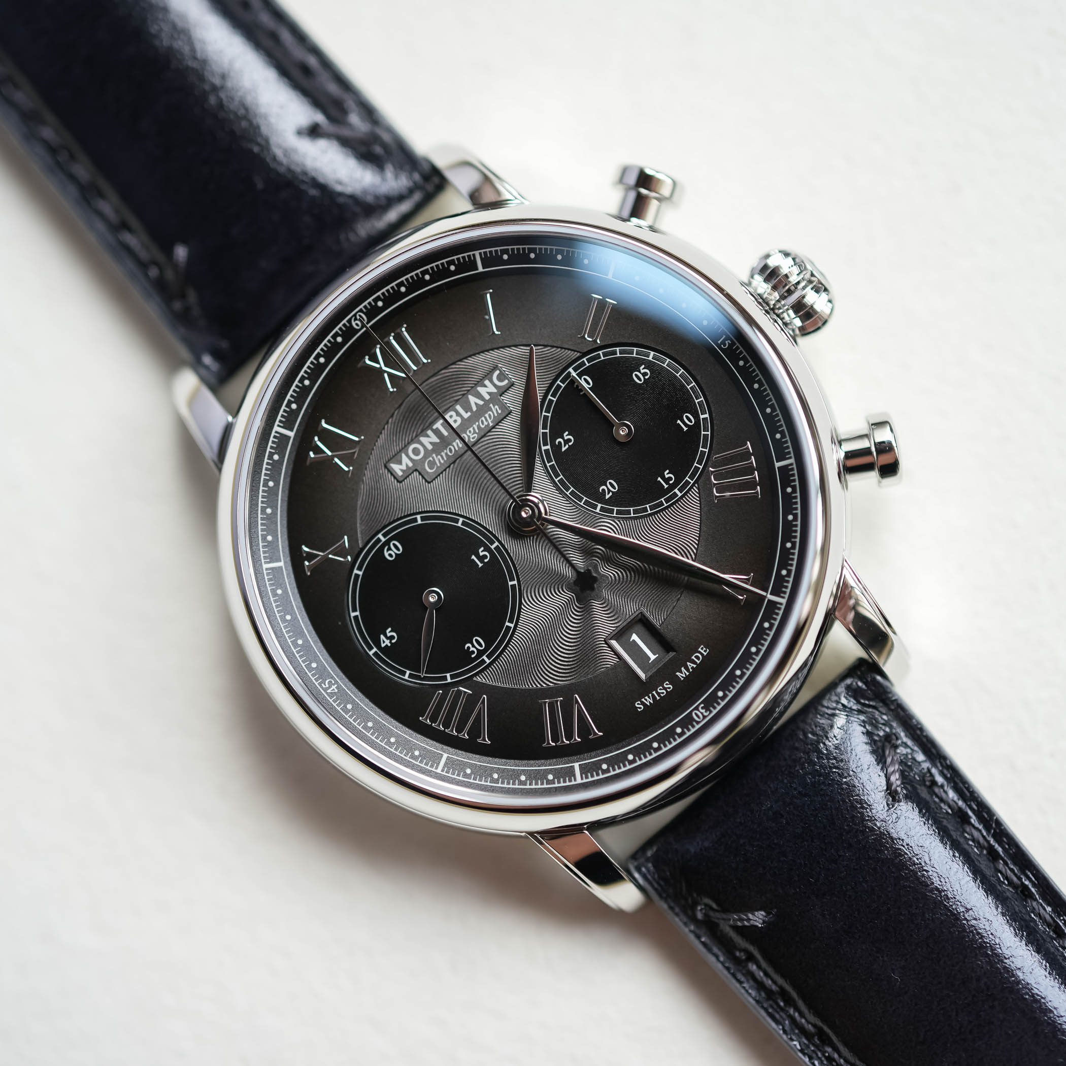 Quick Facts – 42mm x 14.29mm – stainless steel case, polished – sapphire crystal front and back – 50m water resistance – anthracite sfumato dial with exploding star guilloché – bi-compax chronograph layout – calibre MB 25.13 – automatic chronograph – 28,800vph – 48-hour power reserve – anthracite calf leather strap with vertical sfumato effect and steel pin buckle – EUR 5,700