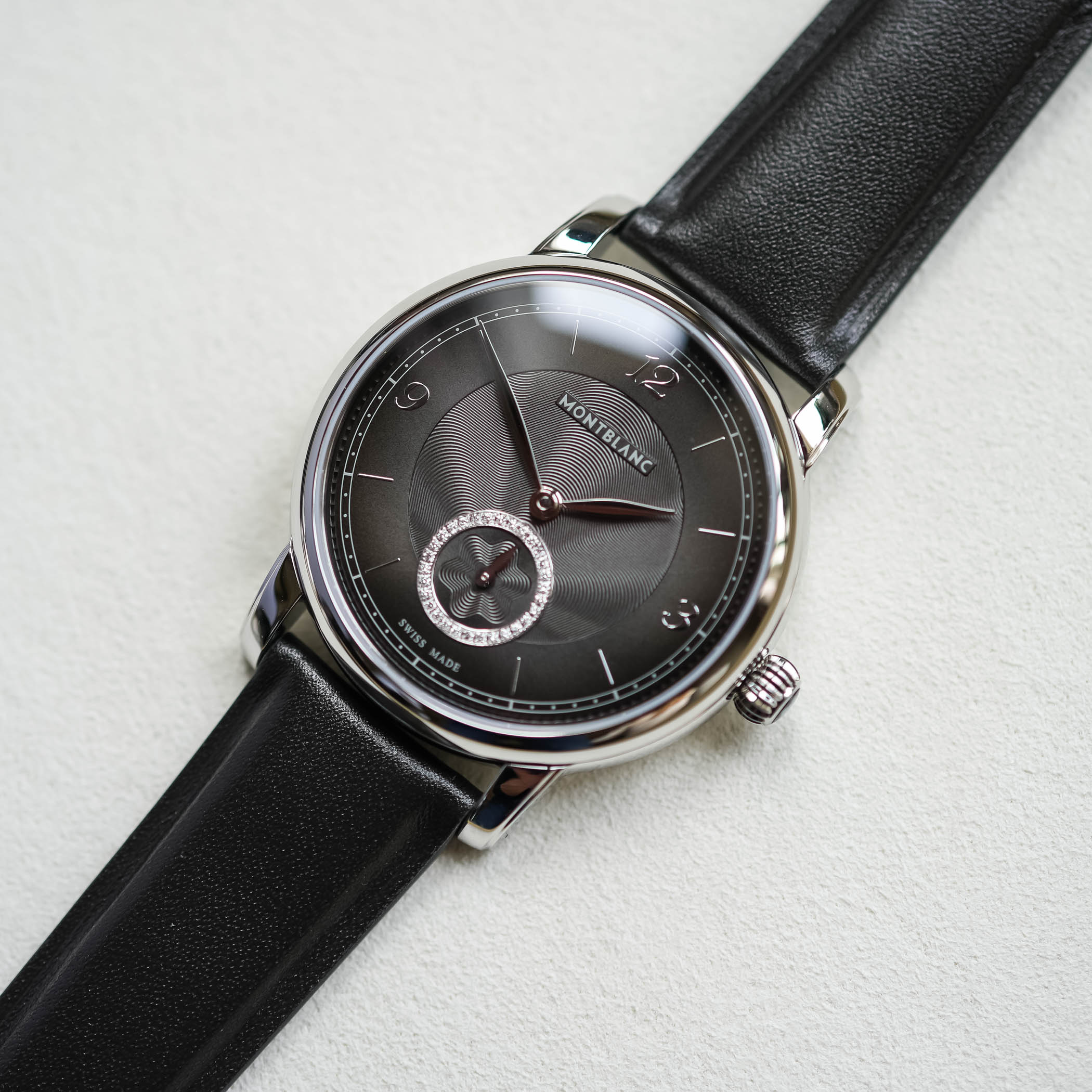The Star Legacy Small Second keeps things clean, but there is a bit more going on once you notice the details. At 6 o’clock, the small seconds sits inside a sub-dial framed by 30 diamonds, adding a decorative touch without taking away the dial’s clarity. The anthracite sfumato dial shows the exploding star guilloché pattern across the surface, coupled with Arabic numerals and leaf hands. You also see a stainless steel crown, topped with a mother-of-pearl Montblanc emblem. A polished 36mm steel case with stepped lugs rounds things off, worn on a black calf leather strap.