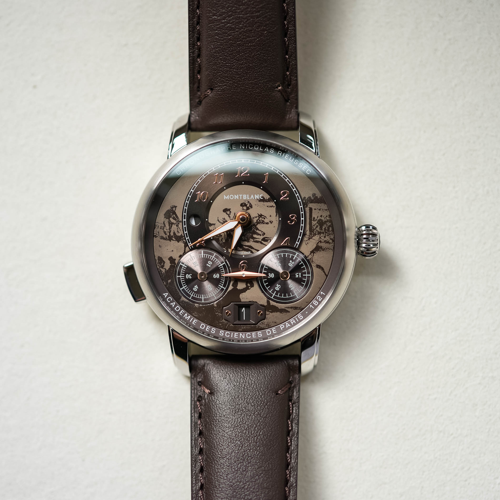 Based on Nicolas Rieussec’s 1821 inking chronograph, the Star Legacy Nicolas Rieussec Chronograph Limited Edition 821 keeps Montblanc’s rotating-disc display, paired with dual time, date, and a monopusher system. The 43mm steel case features stepped lugs, a satin-finished bezel, and an onion crown, and has a noticeable presence on the wrist without feeling too large. Its brown dial features a horse racing motif with a beige sfumato finish, giving it a softer appearance, and the chronograph counters are positioned at 8 and 4 o’clock. The watch comes on a brown leather strap with a Paris map pattern on the lining.