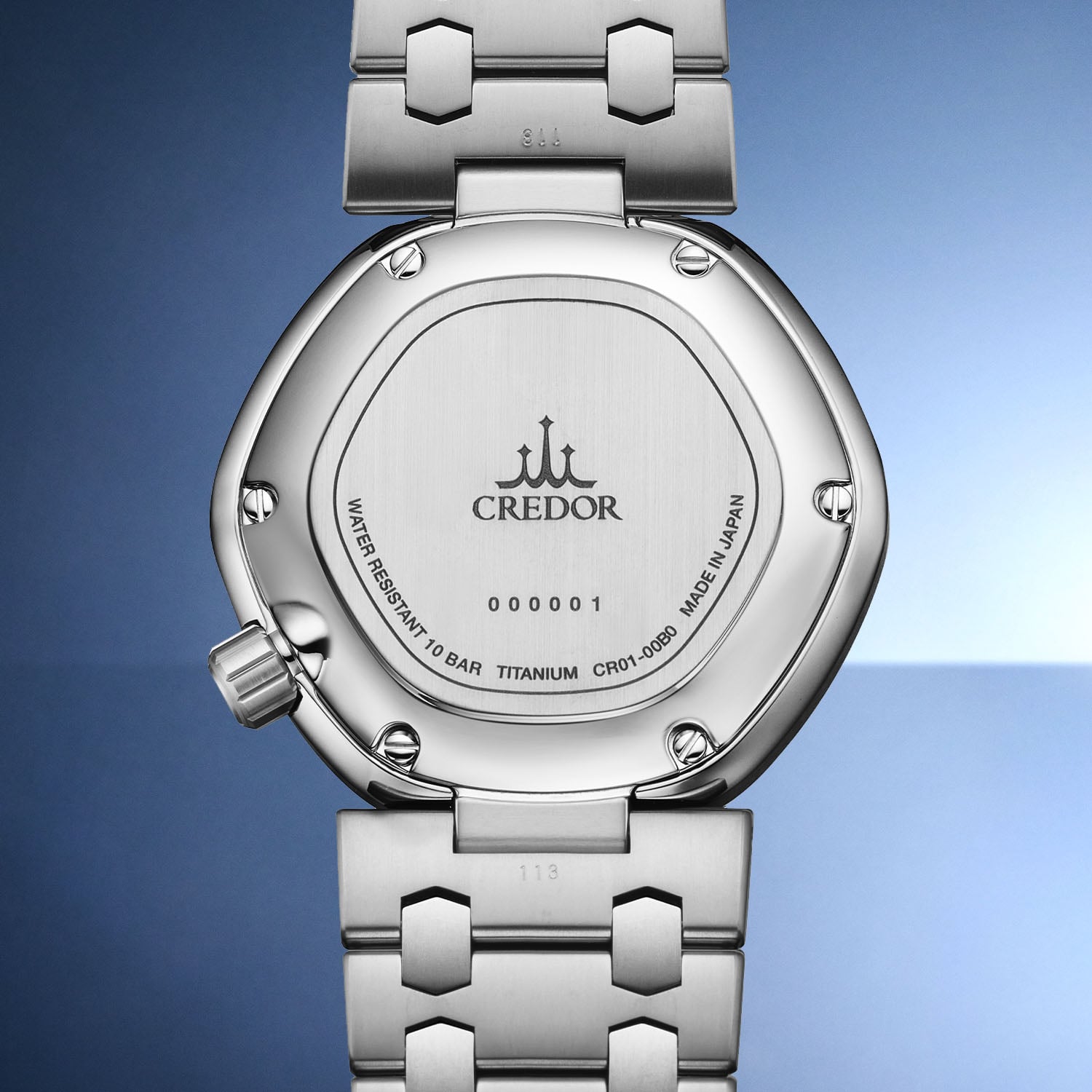 Inside the titanium case is the Credor-exclusive automatic calibre CR01, built on the slim Seiko 6L35 architecture. It features 26 jewels, operates at a frequency of 28,800 vibrations/hour, and delivers a 45-hour power reserve. The integrated high-intensity titanium bracelet mirrors the watch’s design. It starts nearly as wide as the case before tapering slightly toward the three-fold clasp with a push-button release. Its hexagonal mid-links reinforce the watch’s geometric theme.