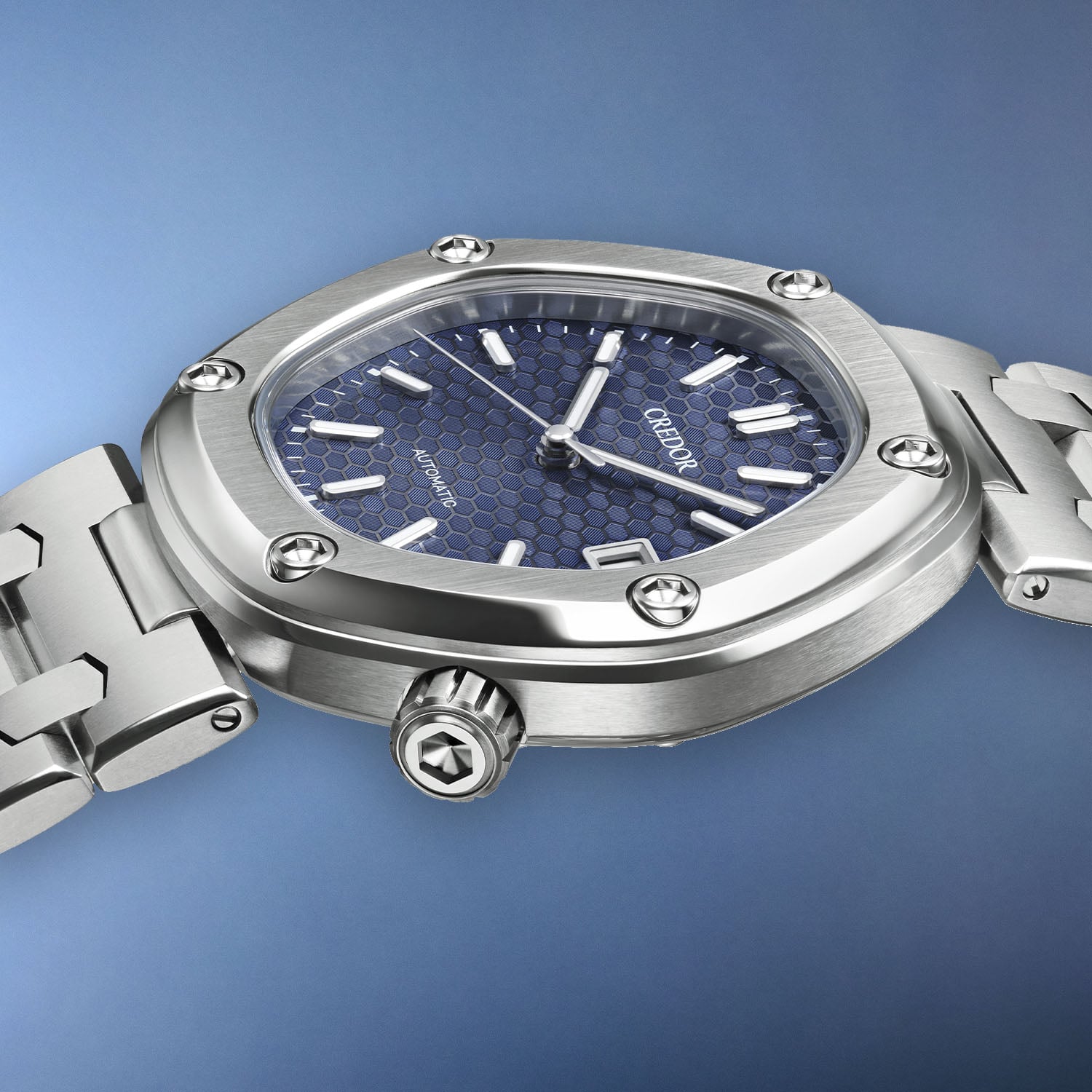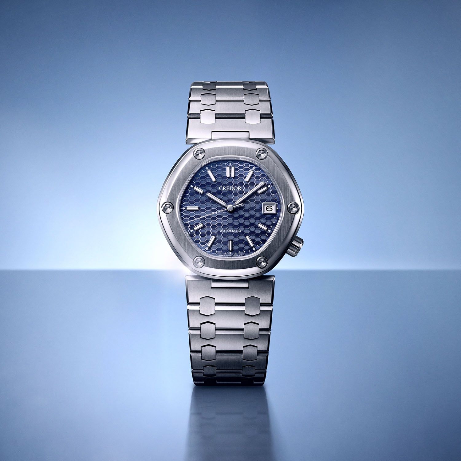 Credor's take on the luxury sports watch, once designed by Genta, back in an elegant blue version.