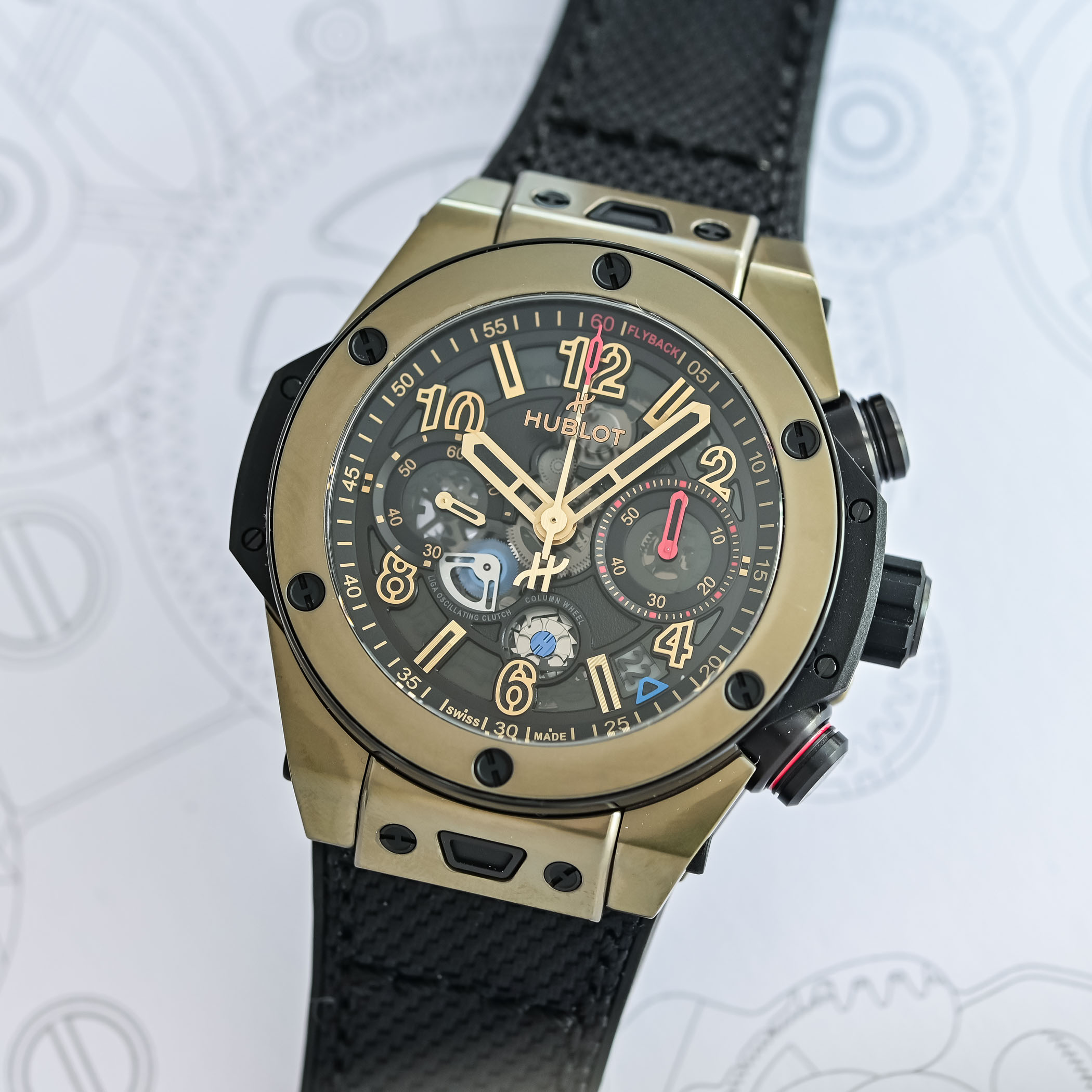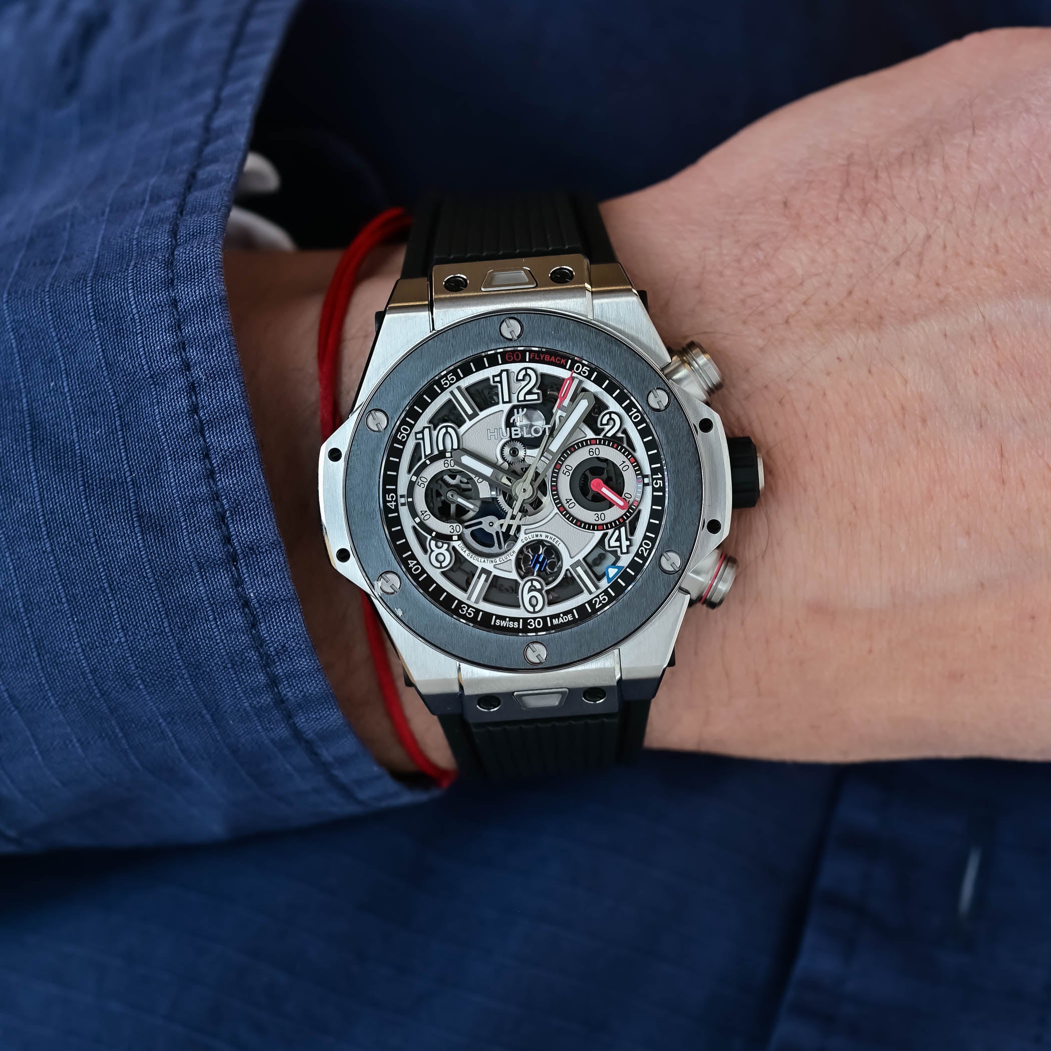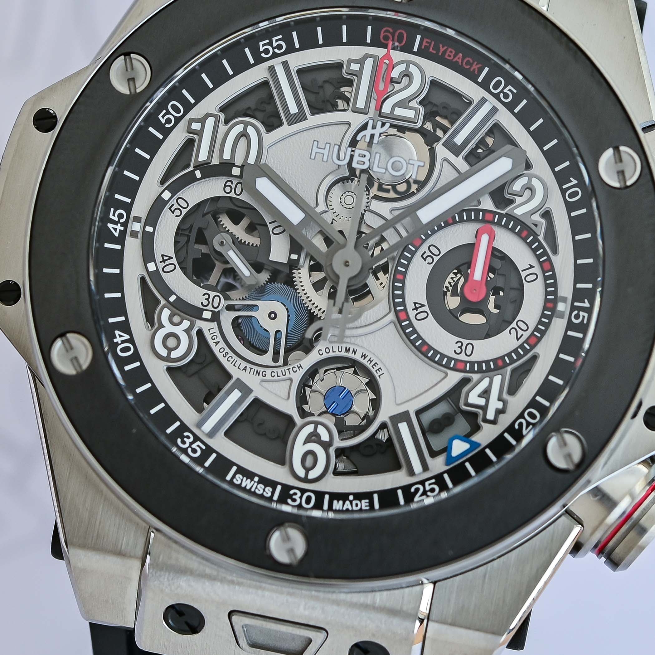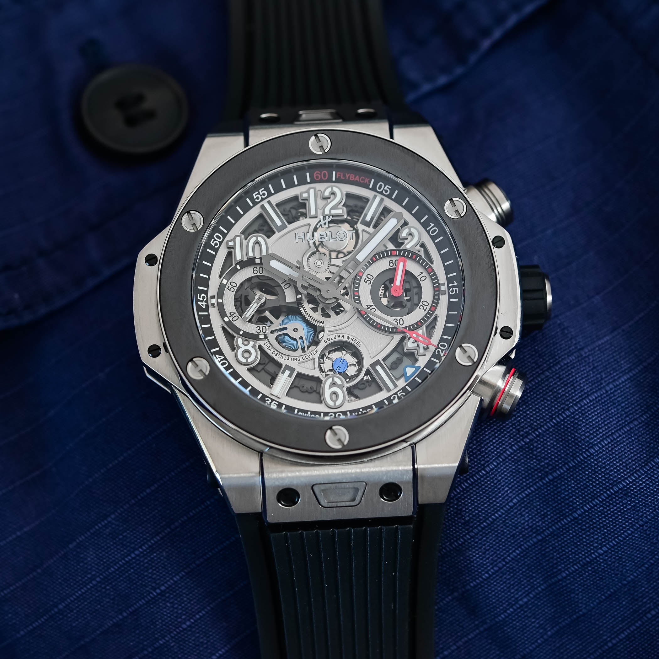 Exposed on the dial and caseback, the flyback chronograph stands out with features like the front-facing column wheel and dual horizontal clutch. Earlier this year, Hublot fitted the Big Bang with the Unico movement, meaning that all Big Bangs are now powered by the in-house calibre.