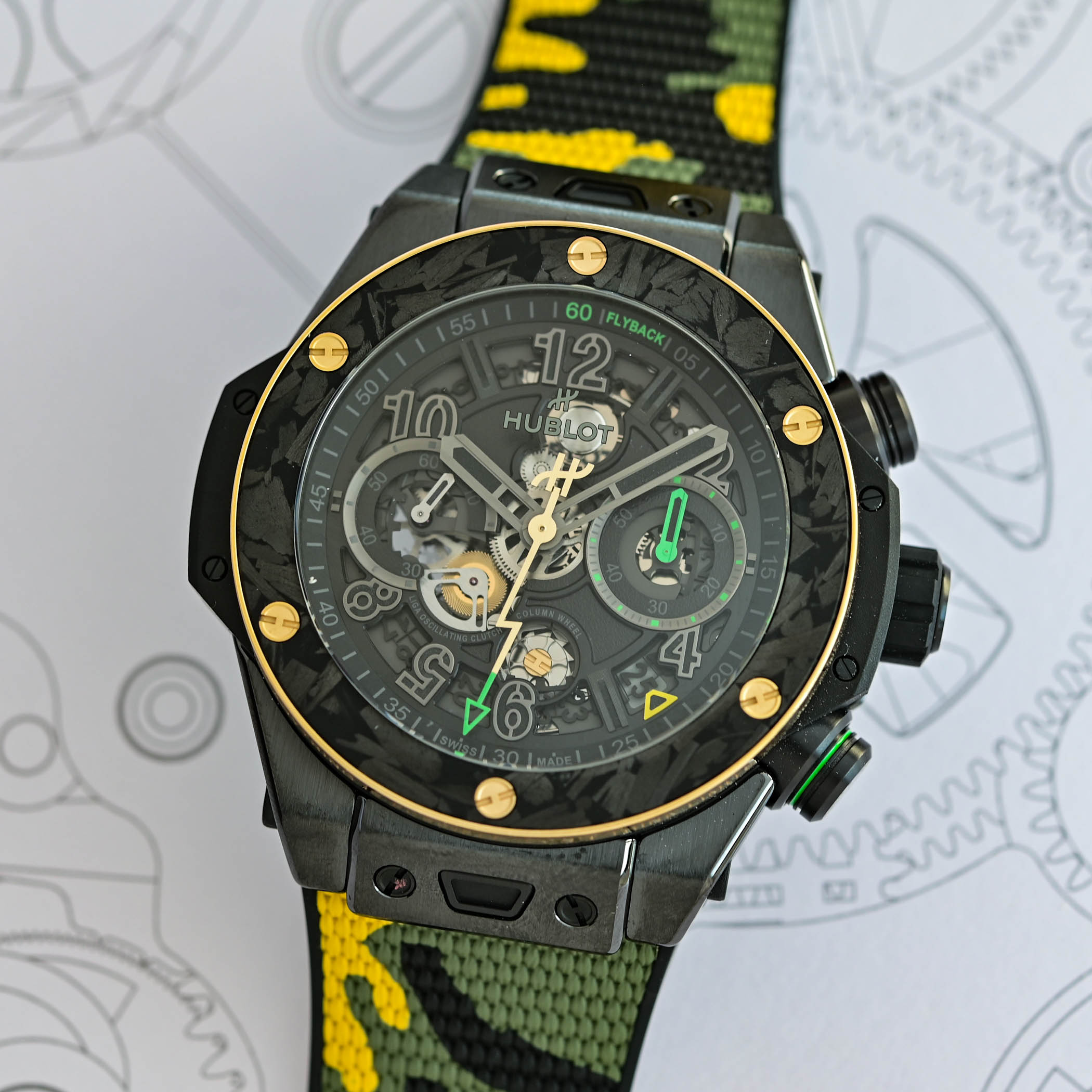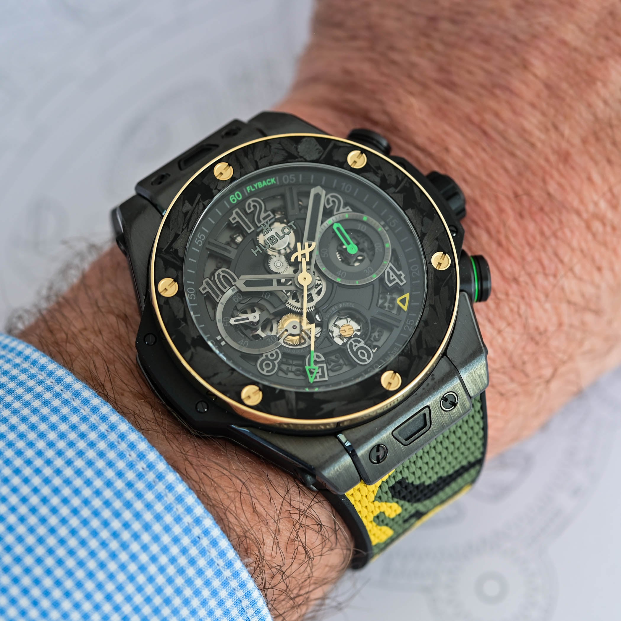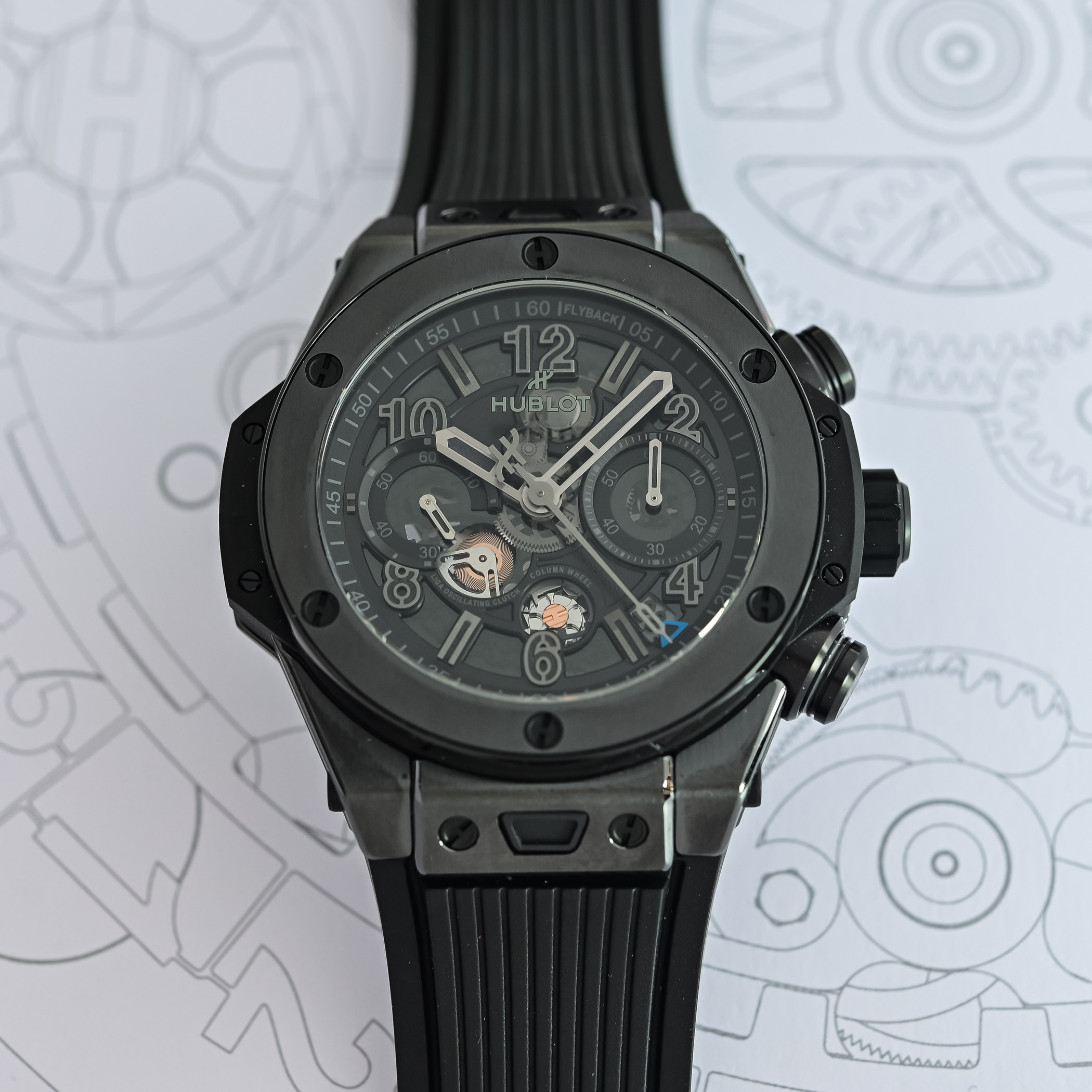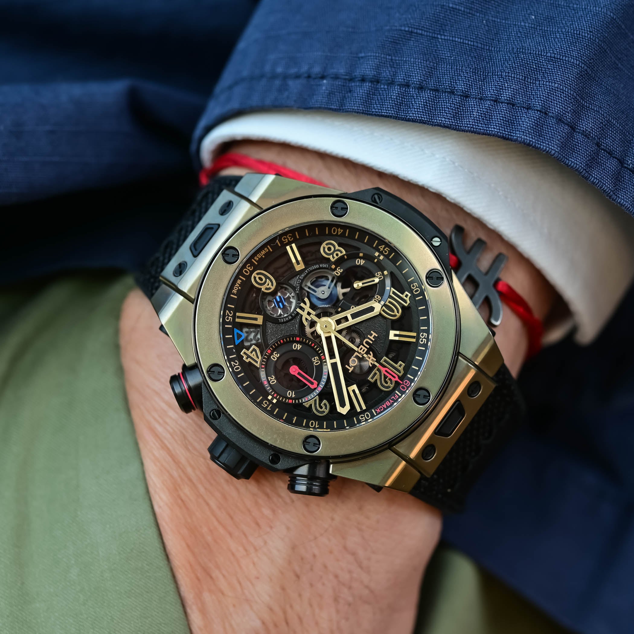 Exposed on the dial and caseback, the flyback chronograph stands out with features like the front-facing column wheel and dual horizontal clutch. Earlier this year, Hublot fitted the Big Bang with the Unico movement, meaning that all Big Bangs are now powered by the in-house calibre.