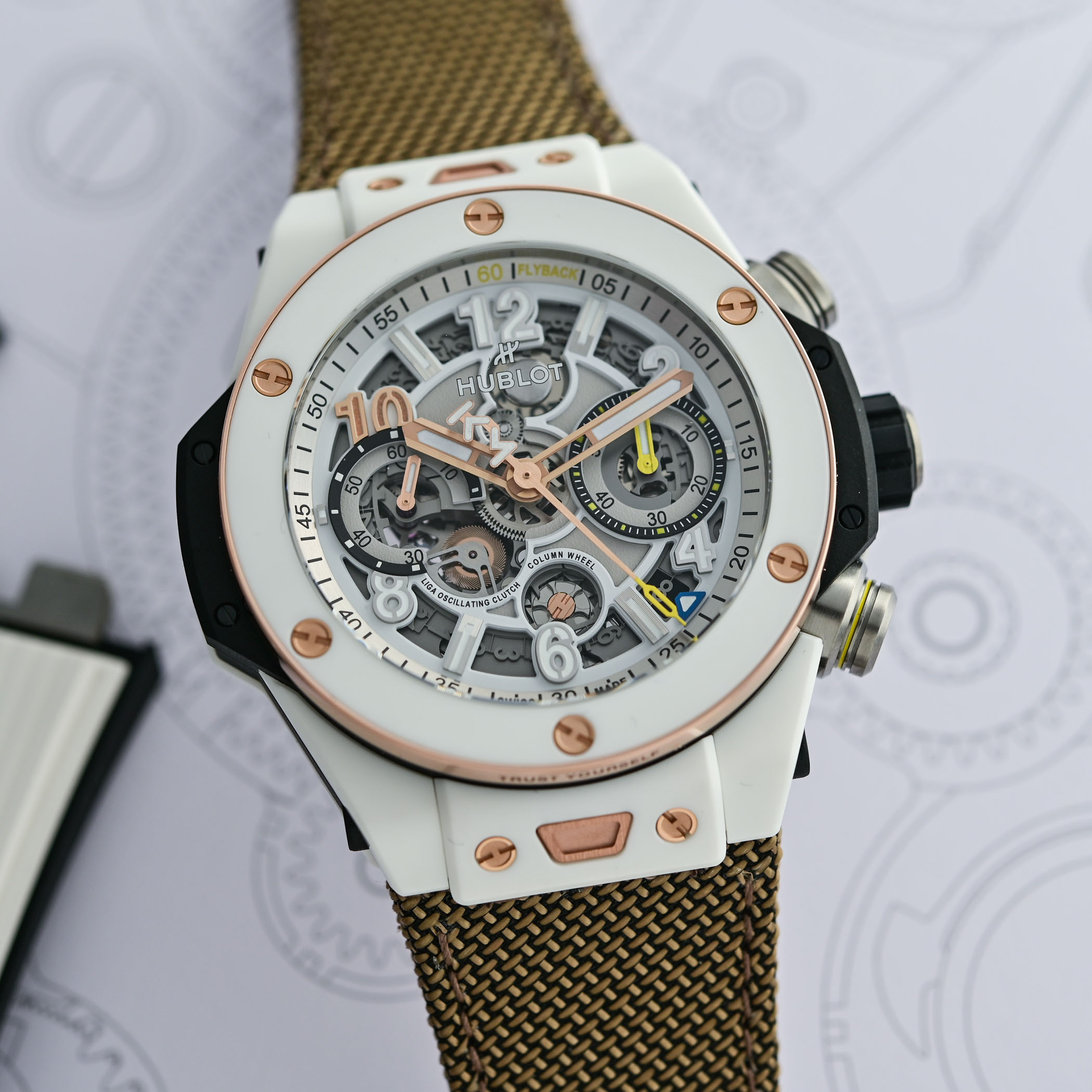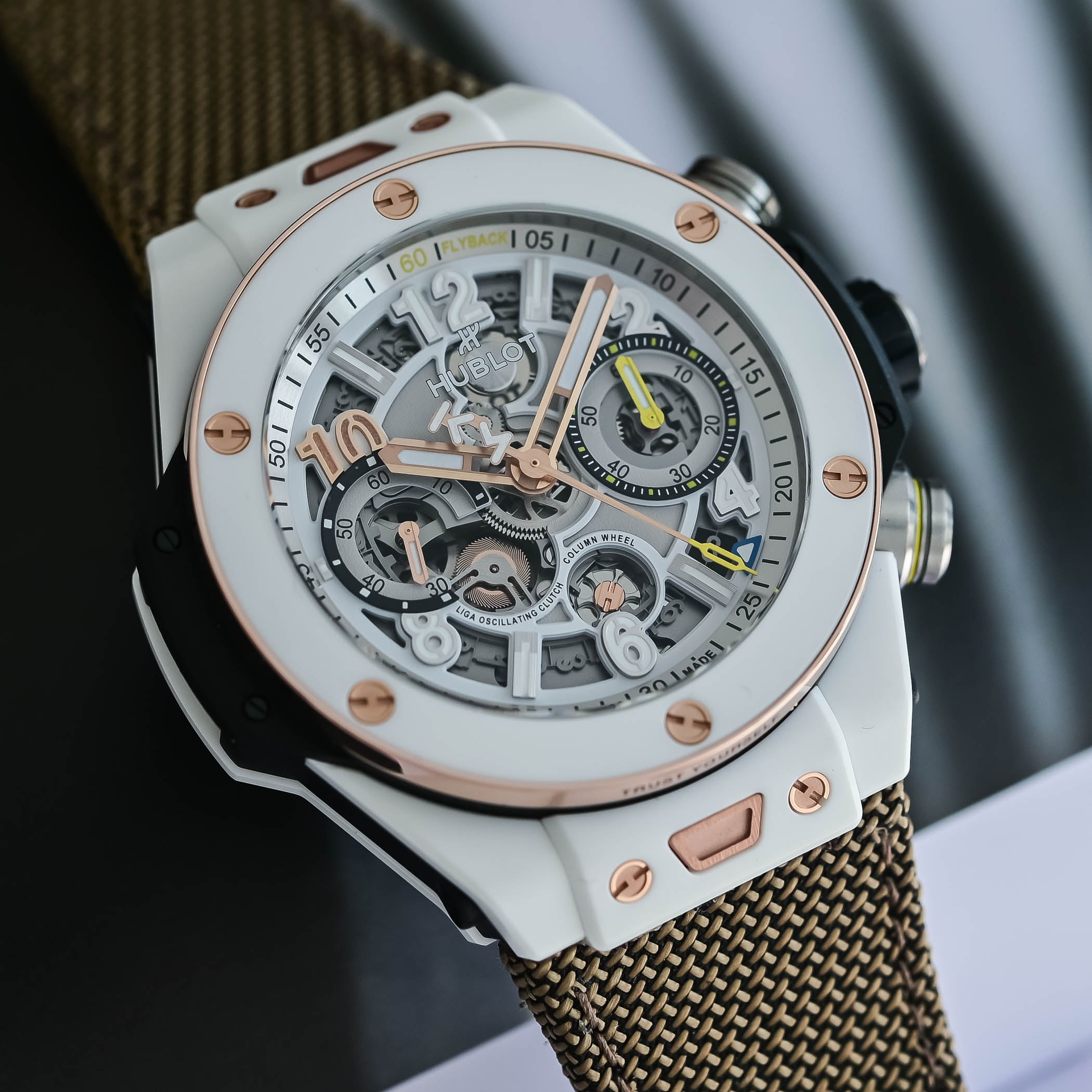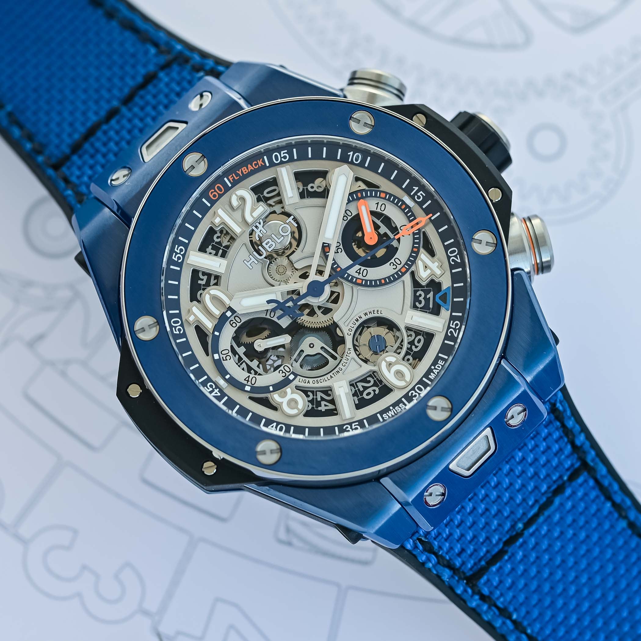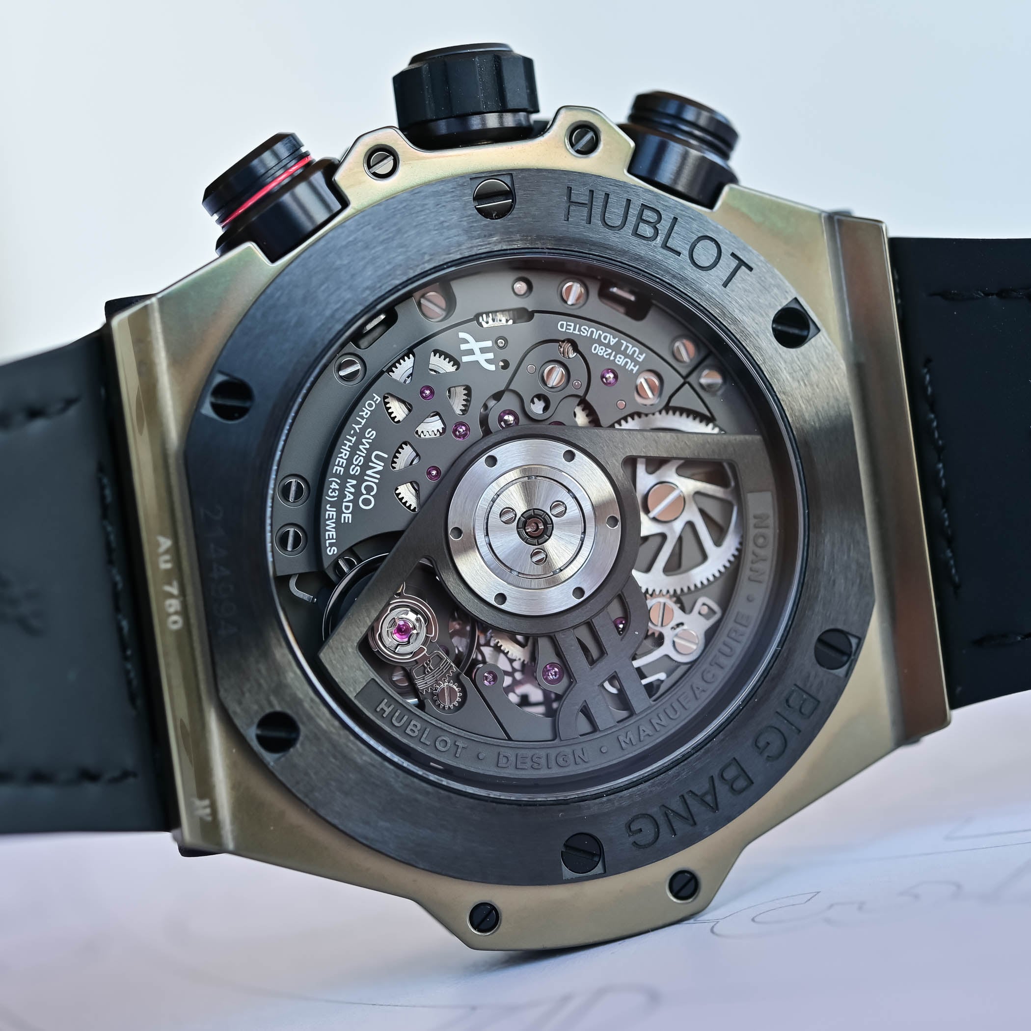 Exposed on the dial and caseback, the flyback chronograph stands out with features like the front-facing column wheel and dual horizontal clutch. Earlier this year, Hublot fitted the Big Bang with the Unico movement, meaning that all Big Bangs are now powered by the in-house calibre.