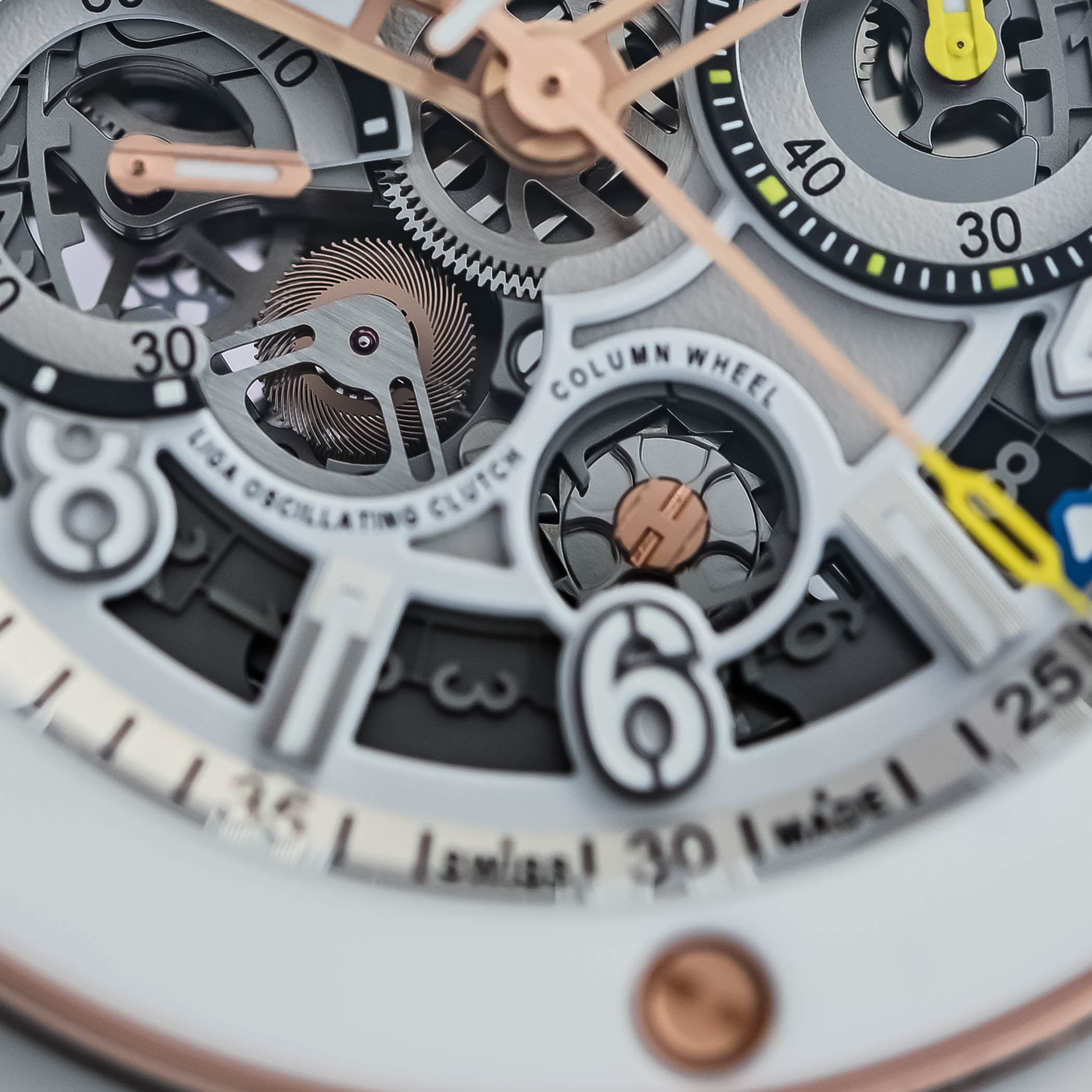 In a nutshell, the redesigned dial is less exposed but pushes certain movement features further into the limelight. Highlighting the column wheel and oscillating pinion in different colours, these are now framed with the inscriptions “Column Wheel” and “Liga Oscillating Clutch”. While the incorporation of a plate at the centre of the dial hides some components, it helps the dial look less busy and, consequently, more legible. Another Reloaded feature is the repositioning of the date, originally housed inside the 60-minute chronograph counter at 3 o’clock, now located at 4:30 and indicated by a coloured Super-LumiNova arrow.