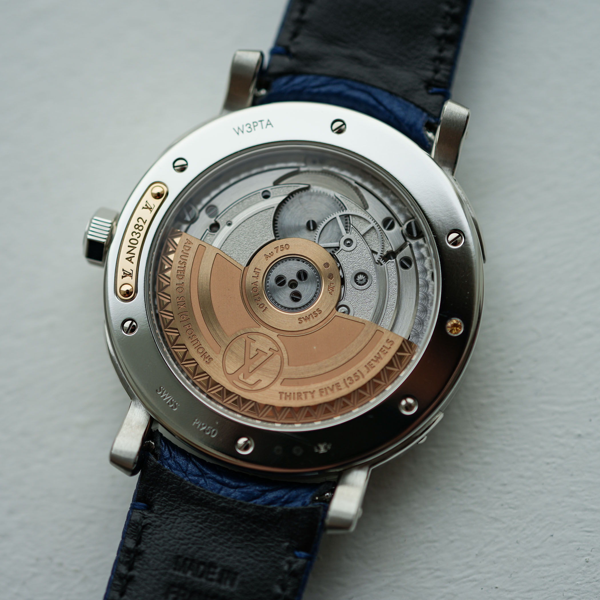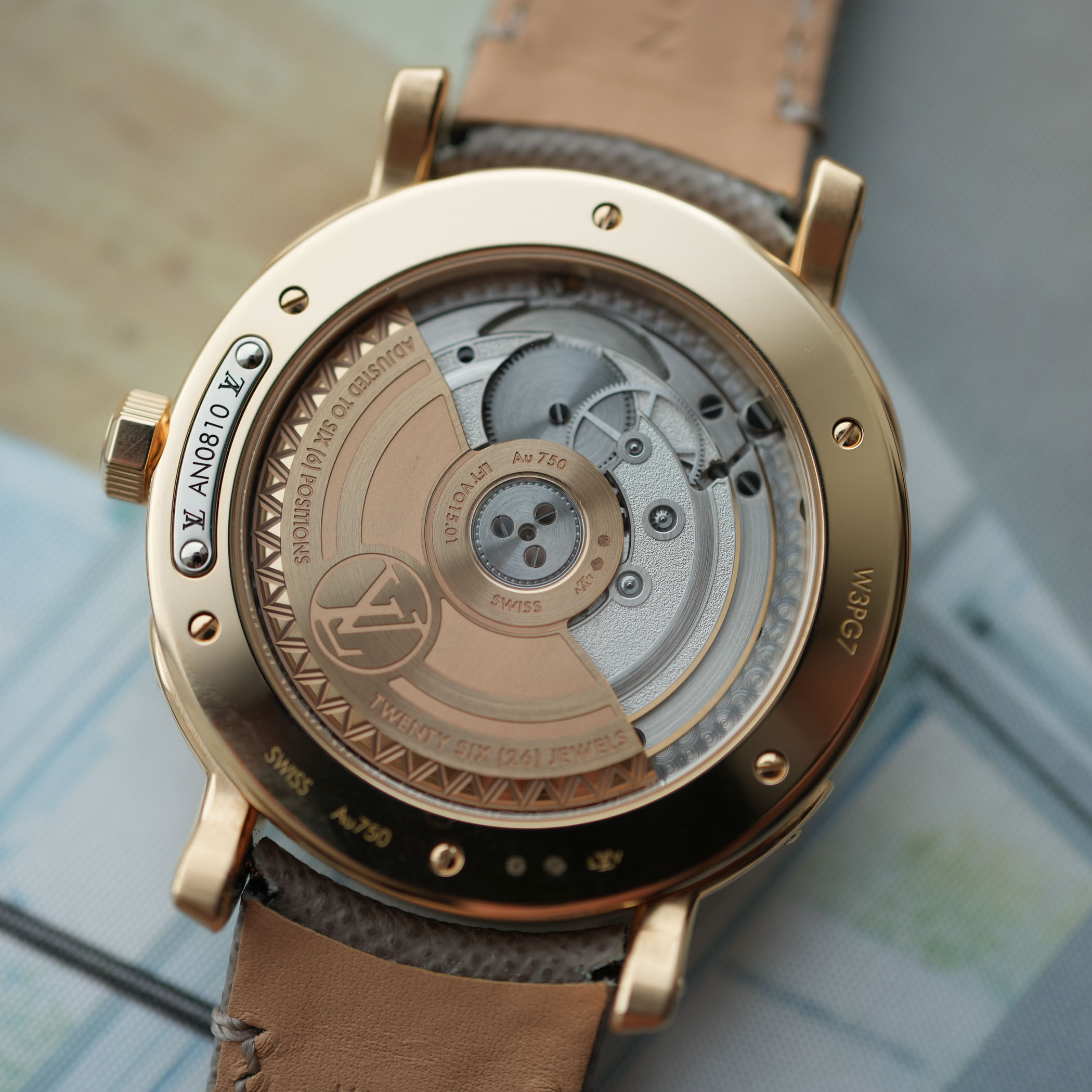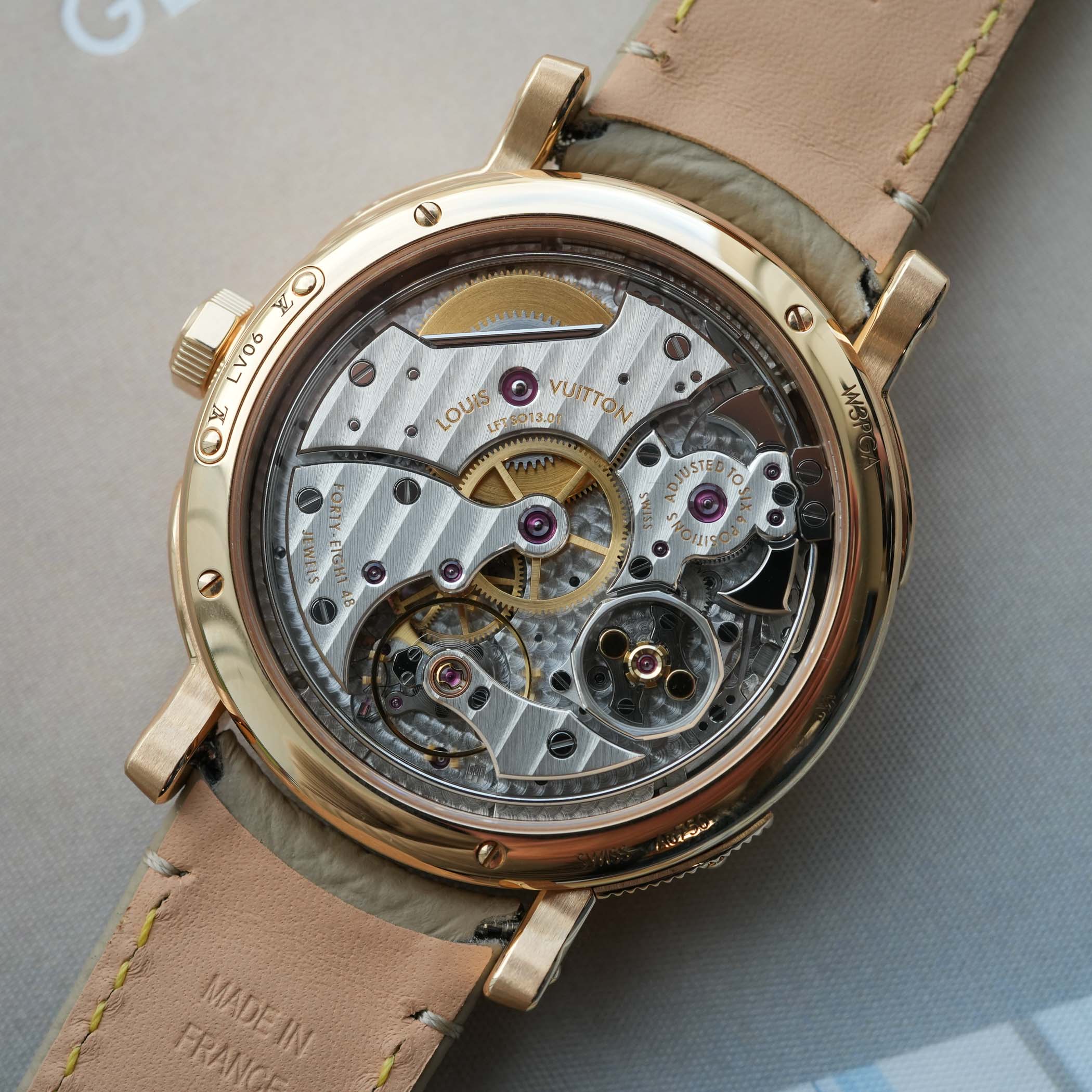 Powering this new display is a new movement, the calibre LFT VO 12.01. Conceived and manufactured in-house at La Fabrique du Temps Louis Vuitton, this automatic movement relies on the same overall concept as the smaller movement introduced last year in the Convergence and the Spin Time models. This quite large movement, running at a 4Hz frequency, is nicely decorated with a rose gold rotor and Vuitton’s classic finishes: sandblasted bridges, polished bevels and colourless jewels.