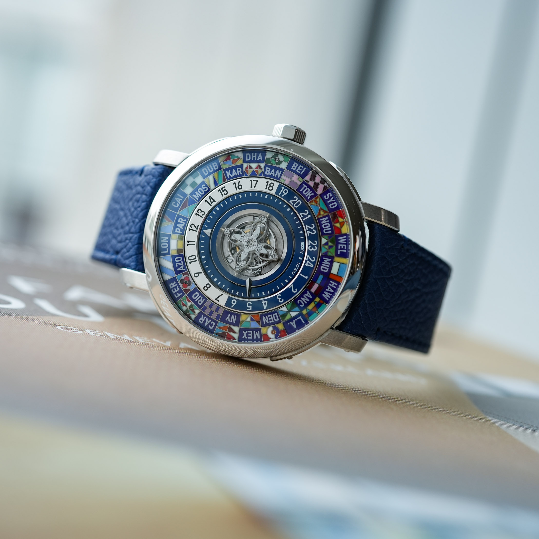 The same inspiration was visible on the dials, but then again, in a time-only version. There were discreet references to the trunks, mostly the applied makers and the minute track with gold studs. But then again, I kind of missed the design and display of the older models, specifically the world timer watches and their dials full of miniature flags.