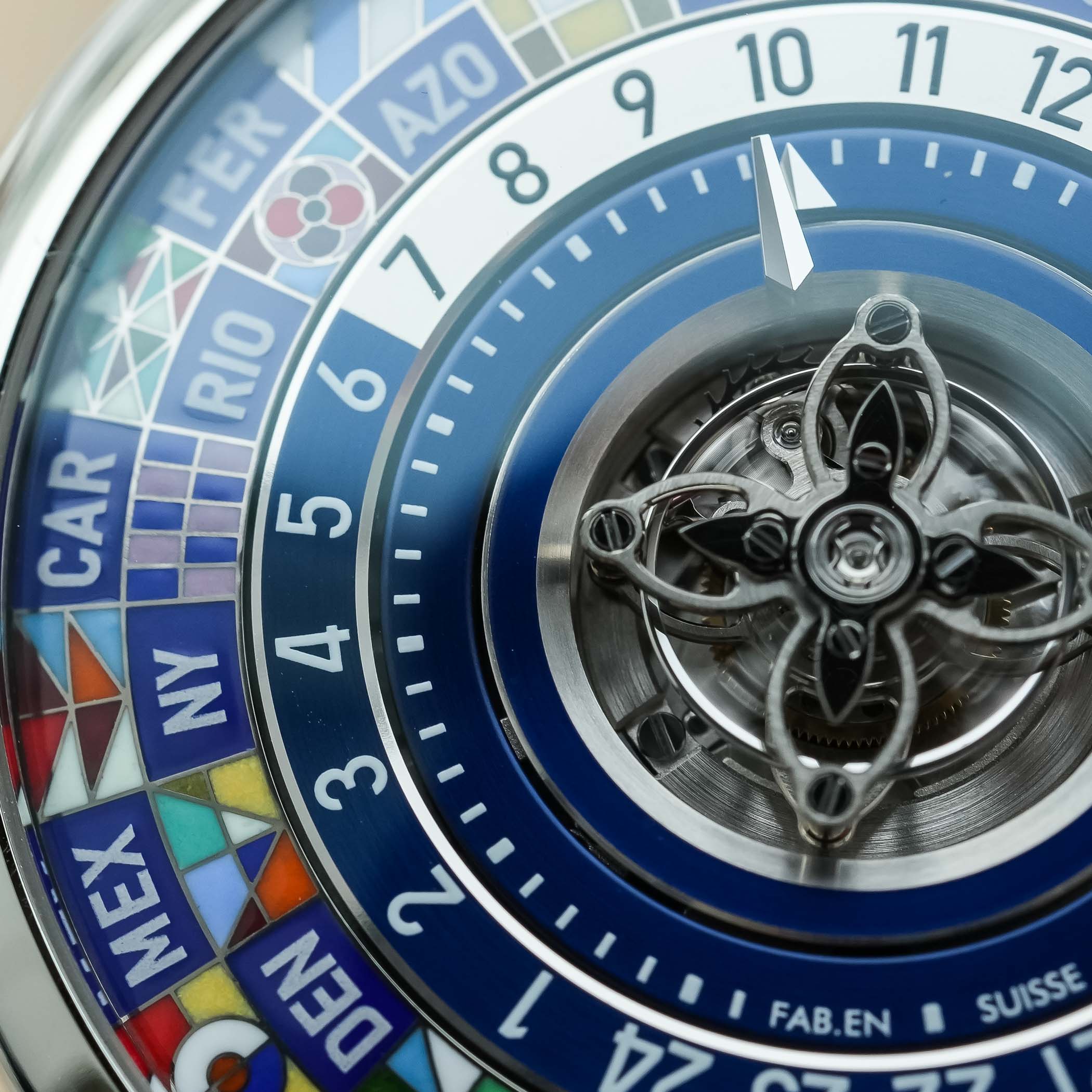 Now, as you can see, having a tourbillon in the centre of the dial also requires rethinking the display. In addition to the Monogram flower tourbillon and the city disc, the display consists again of a more legible jumping hour disc and the minutes are indicated by small indexes at the periphery of the tourbillon. Here, the base of the movement is the same as above, meaning an in-house automatic calibre running also at 4Hz.