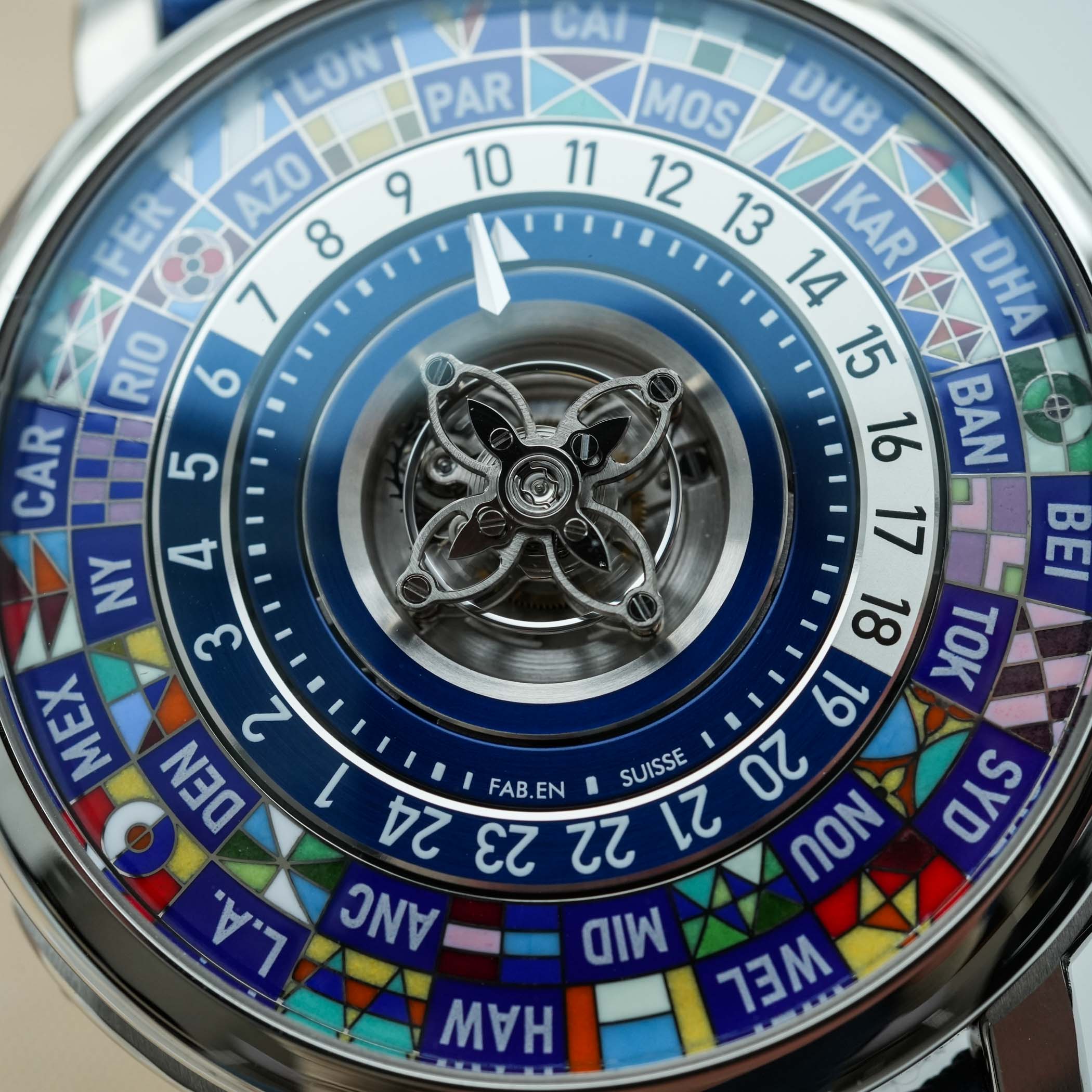 Quick facts: 40mm x 10.3mm platinum case – sapphire crystal on both sides – 50m water-resistant – handcrafted dial with miniature painting (35 colours) – LFT VO12.01 calibre, in-house automatic, 4Hz, 62h power reserve – blue calf leather strap, platinum pin buckle – ref. W3PTA1