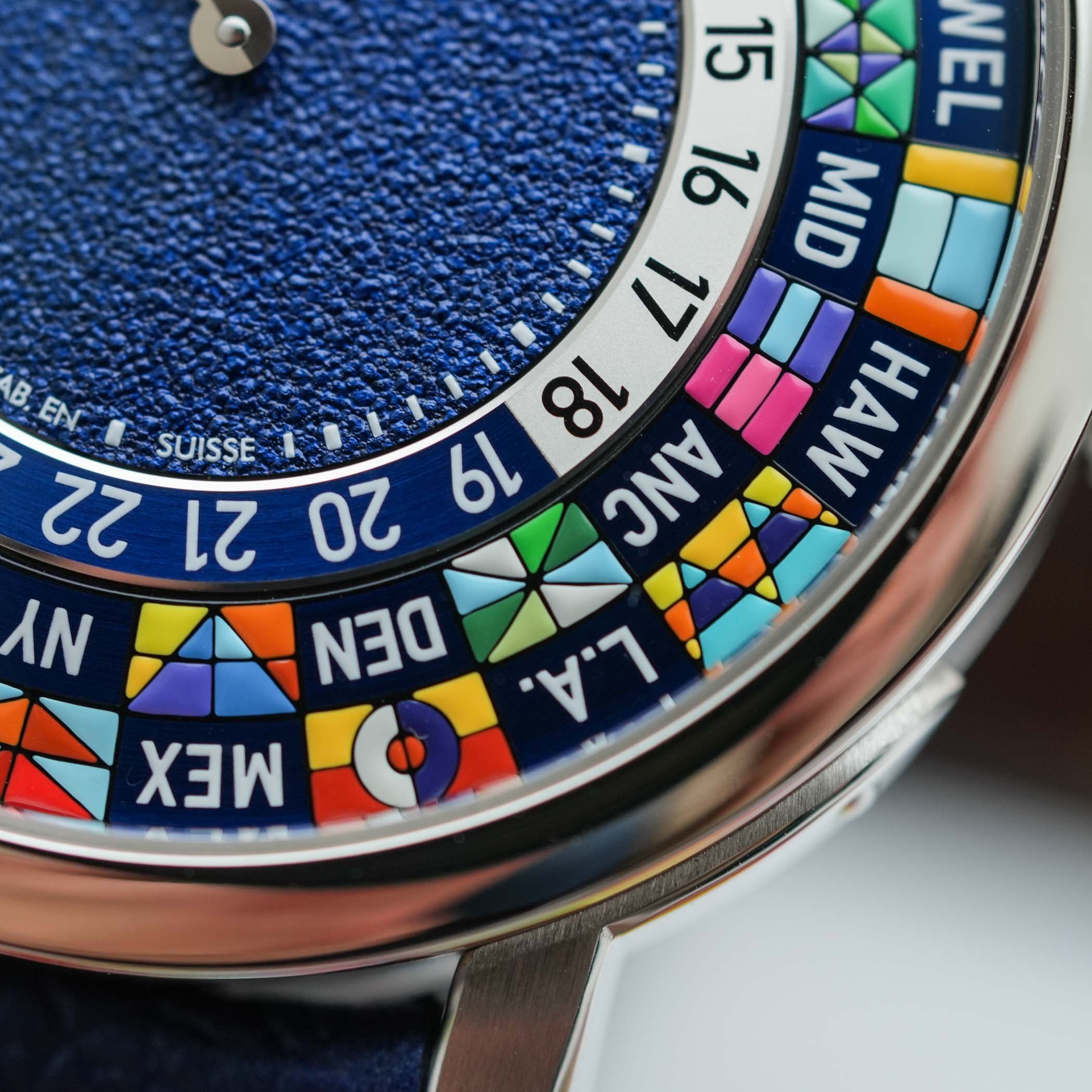 But of course, what matters here is the dial… And yes, the miniature-painted flags are back! Used to create the city ring of the worldtime function, and paired with a sleek grained blue central dial, the ring is again a tribute to travel and to LV trunks. There are 24 flags, representing the 24 main cities around the globe. And their design is not just a coincidence, as they all refer to elements of the trunks. These flags are made by hand, by Louis Vuitton’s atelier, La Fabrique des Arts, by a team of just two artisans. And they do something quite spectacular, as 35 colours are applied one by one using a tiny brush. Between applications, the dial is carefully dried in an oven to set each colour. As a result, it takes an entire week to complete each dial. And the result is a dial full of colours, super detailed and with a very beautiful 3D effect.