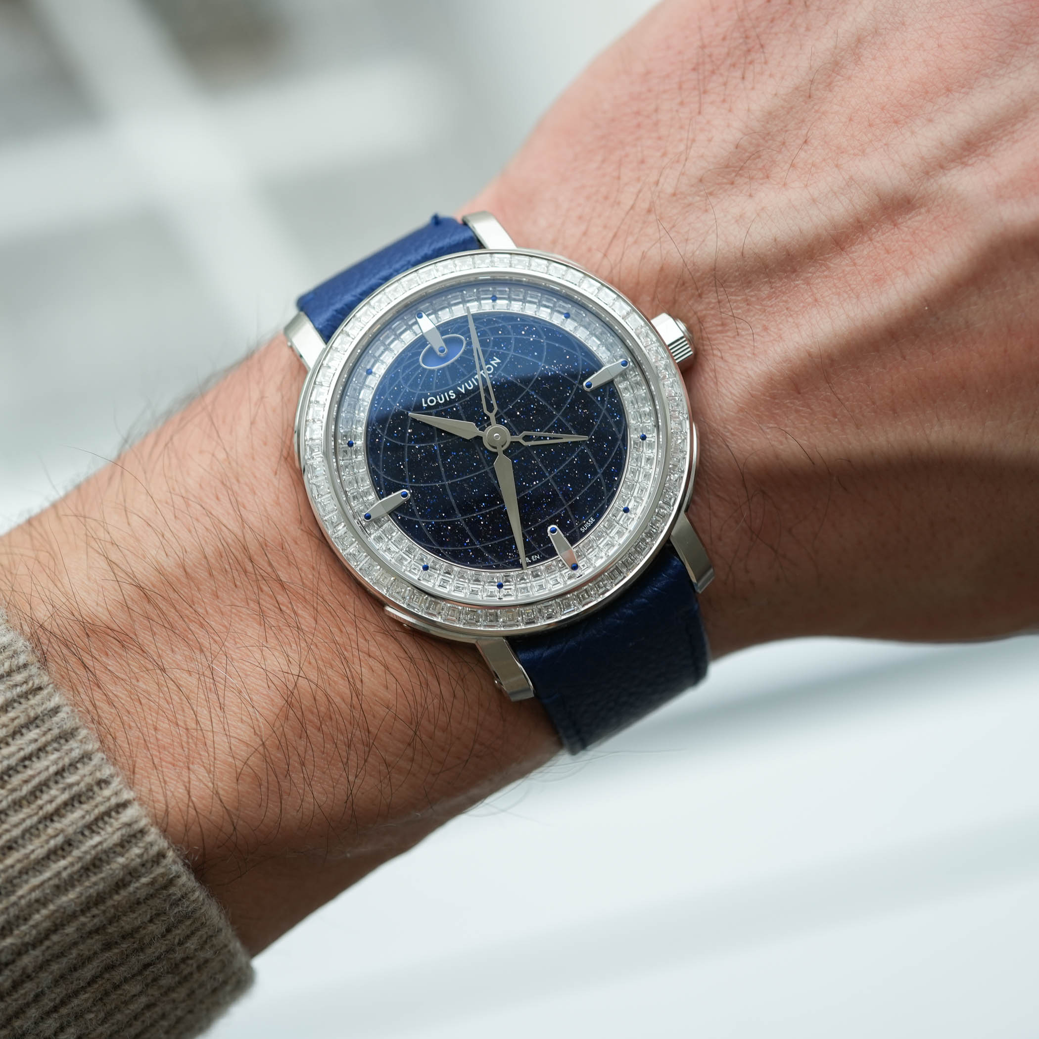 The new Louis Vuitton Escale Worldtime is worn on a blue leather strap with a platinum pin buckle. On the wrist, it’s really a beautiful object with great personality, but also a comfortable watch, and a practical travelling companion too. It retails for EUR 95,000.