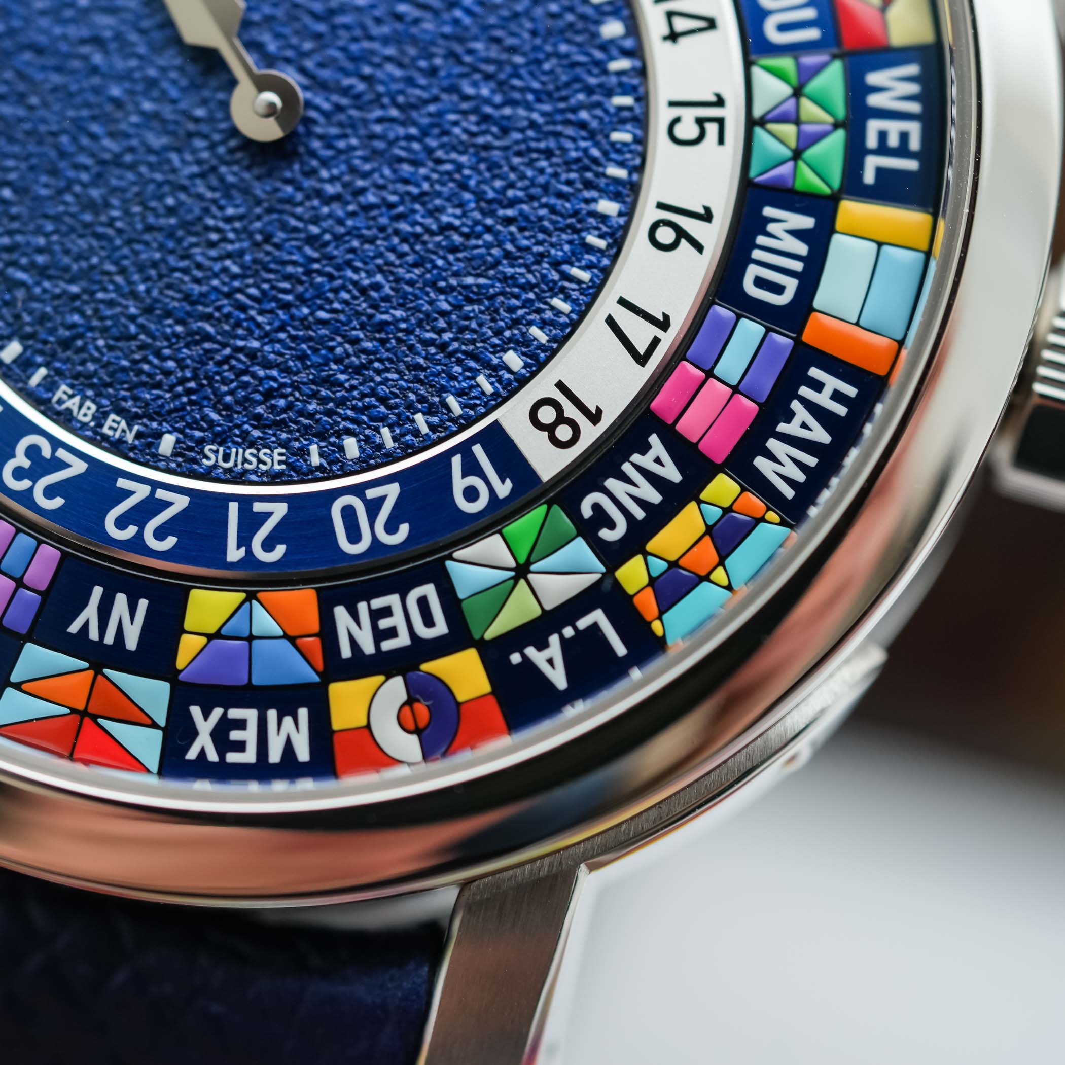 At the centre sits a grained blue dial, restrained enough to temper the intensity of the flag ring, yet rich enough to avoid appearing flat. The biggest evolution is functional. The original 2014 Escale Worldtime was visually bold but not particularly intuitive. Its rotating discs and triangular pointer required “acclimatisation”, and legibility definitely was not its strongest suit.