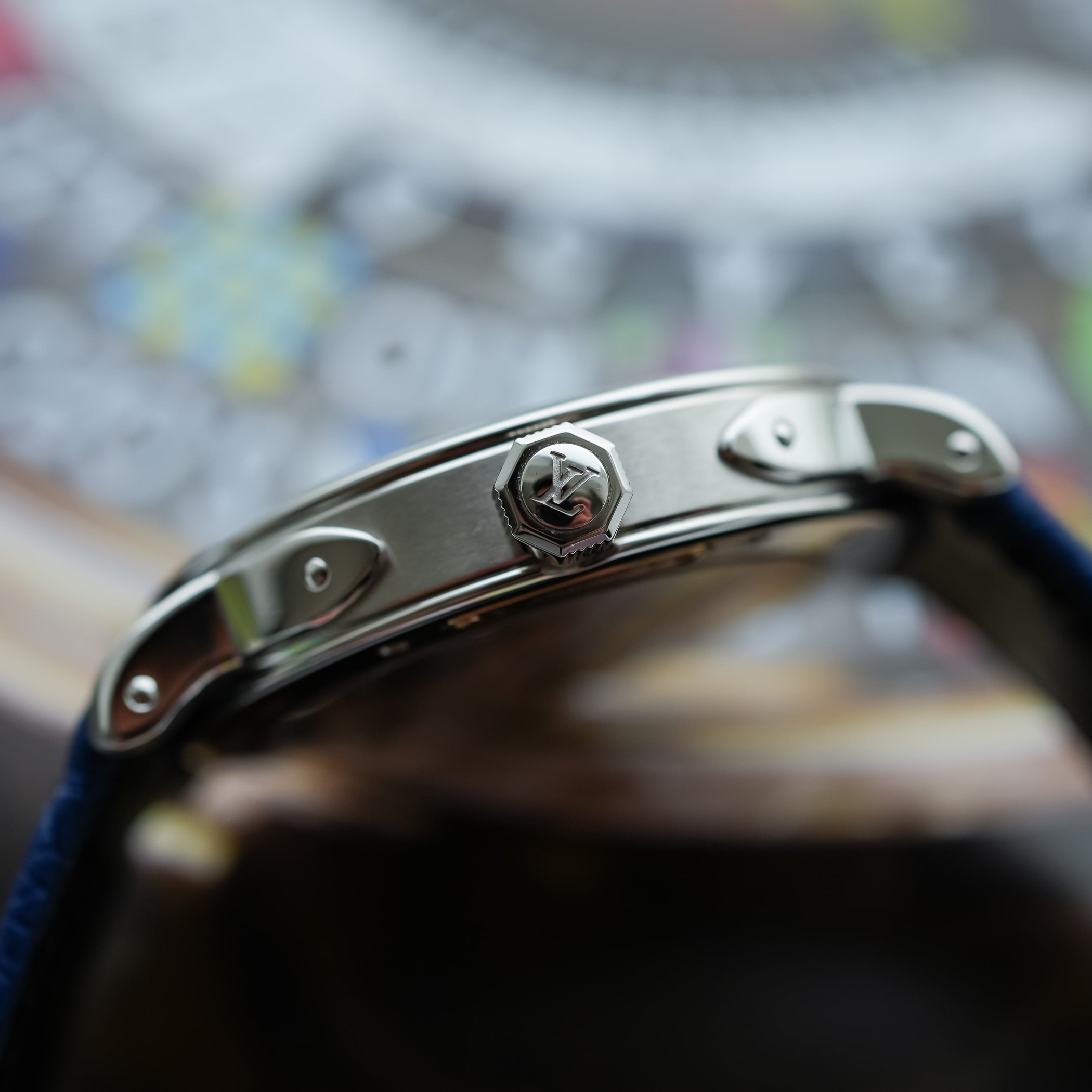 The Escale’s signature lugs (recognise the brass brackets and corners of Louis Vuitton trunks) remain the defining element. They sit on a brushed caseband, creating a nice, deliberate contrast. Up close, their execution is excellent: sharply defined, mirror-polished, with internal bevels to catch the light in different ways. The octagonal crown, another Escale hallmark, is crisp and tactile. The caseback reveals the movement, and a discreet detail: a saffron-coloured sapphire, Louis Vuitton’s signature for platinum cases, set opposite the numbered plaque. Water-resistance is 50m.