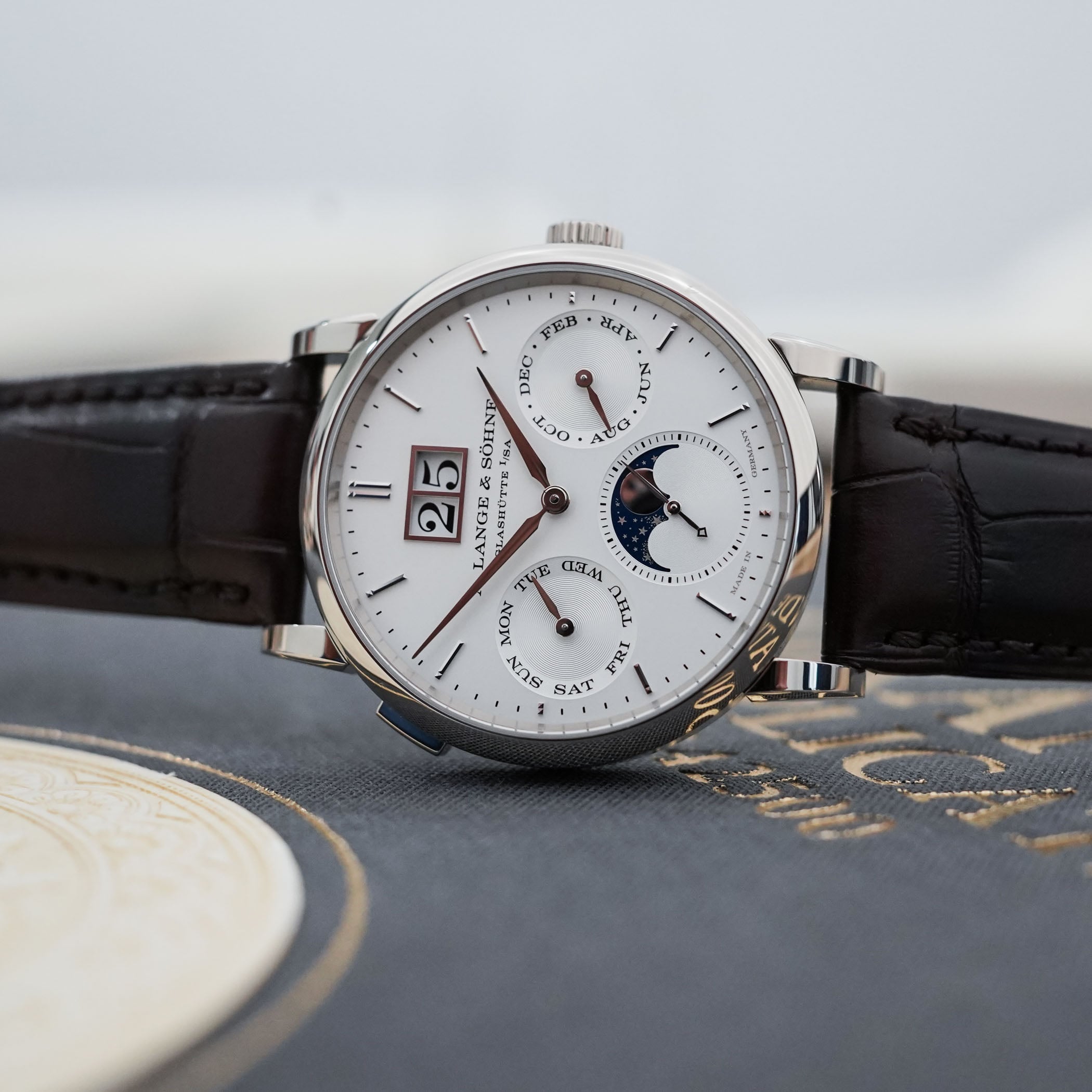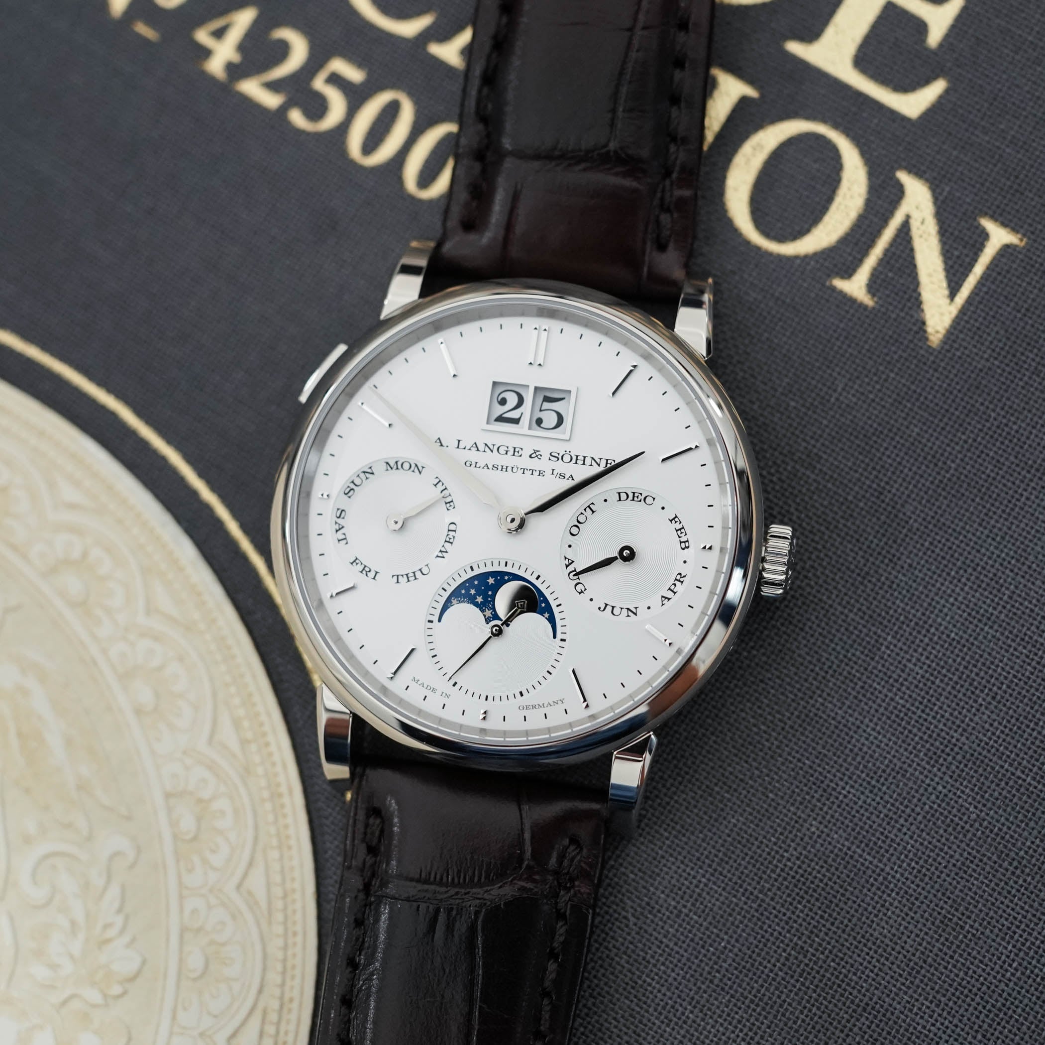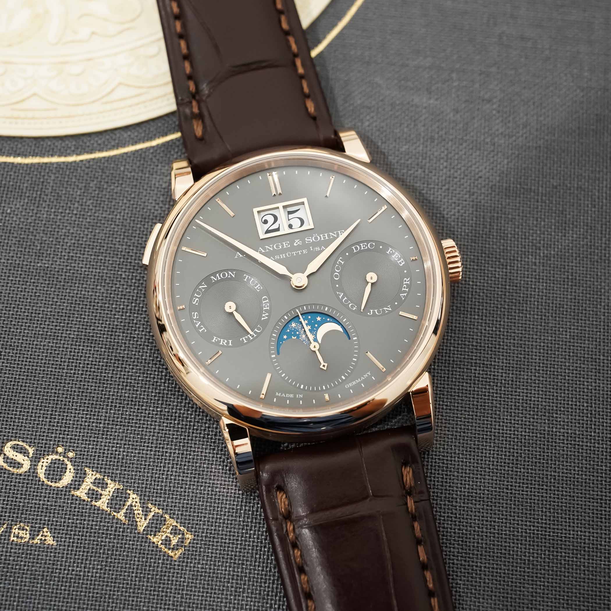 The moon phase display in the running seconds counter at 6 o’clock needs only one correction every 122.6 years and features a blue-coated gold lunar disc with 428 stars to evoke the Milky Way. As a child of A. Lange & Söhne’s pragmatic, user-friendly approach to watchmaking, all the calendar indications and the moon phase display can be advanced collectively with the rapid-correction pusher on the case at 10 o’clock, or adjusted with individual correctors.