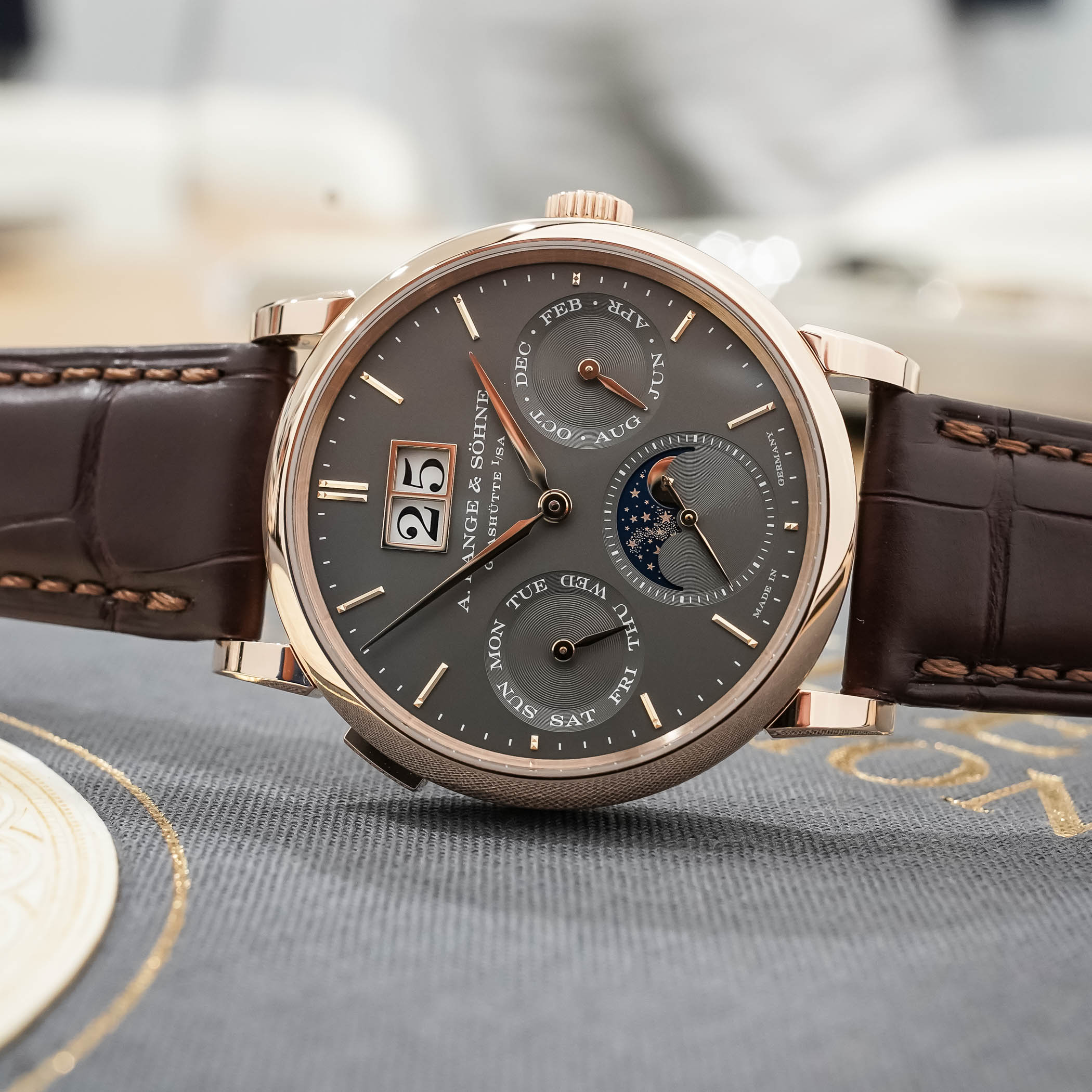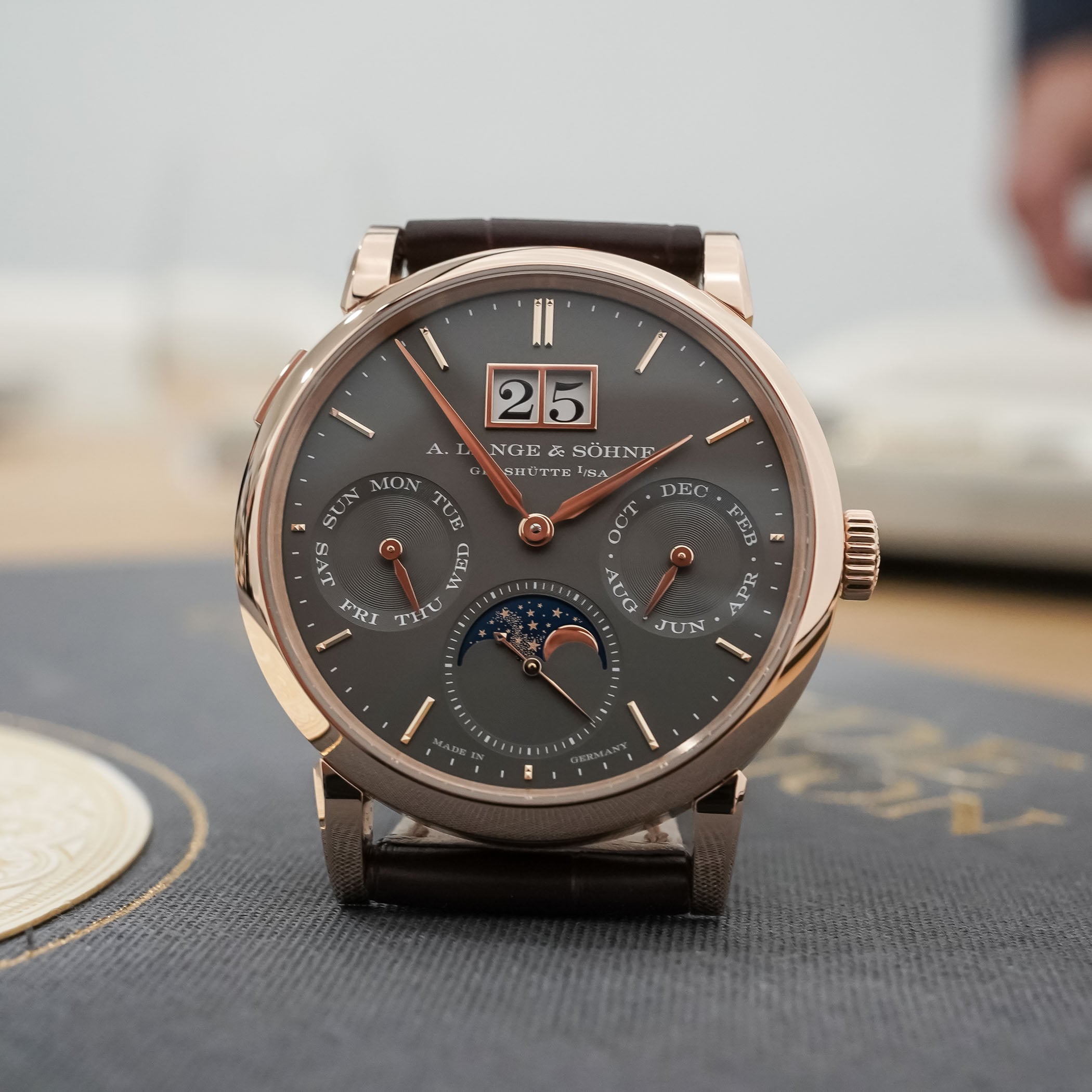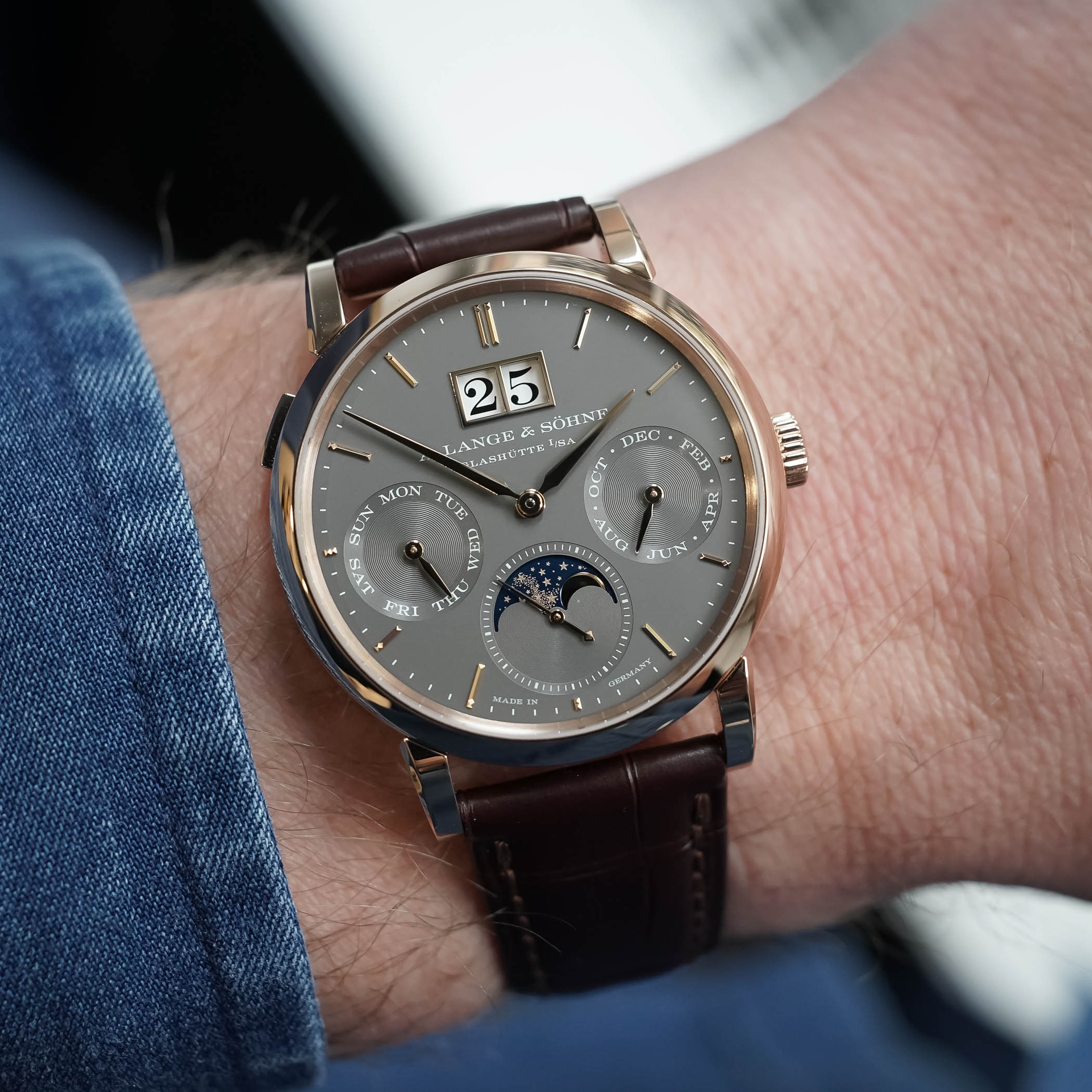 The moon phase display in the running seconds counter at 6 o’clock needs only one correction every 122.6 years and features a blue-coated gold lunar disc with 428 stars to evoke the Milky Way. As a child of A. Lange & Söhne’s pragmatic, user-friendly approach to watchmaking, all the calendar indications and the moon phase display can be advanced collectively with the rapid-correction pusher on the case at 10 o’clock, or adjusted with individual correctors.