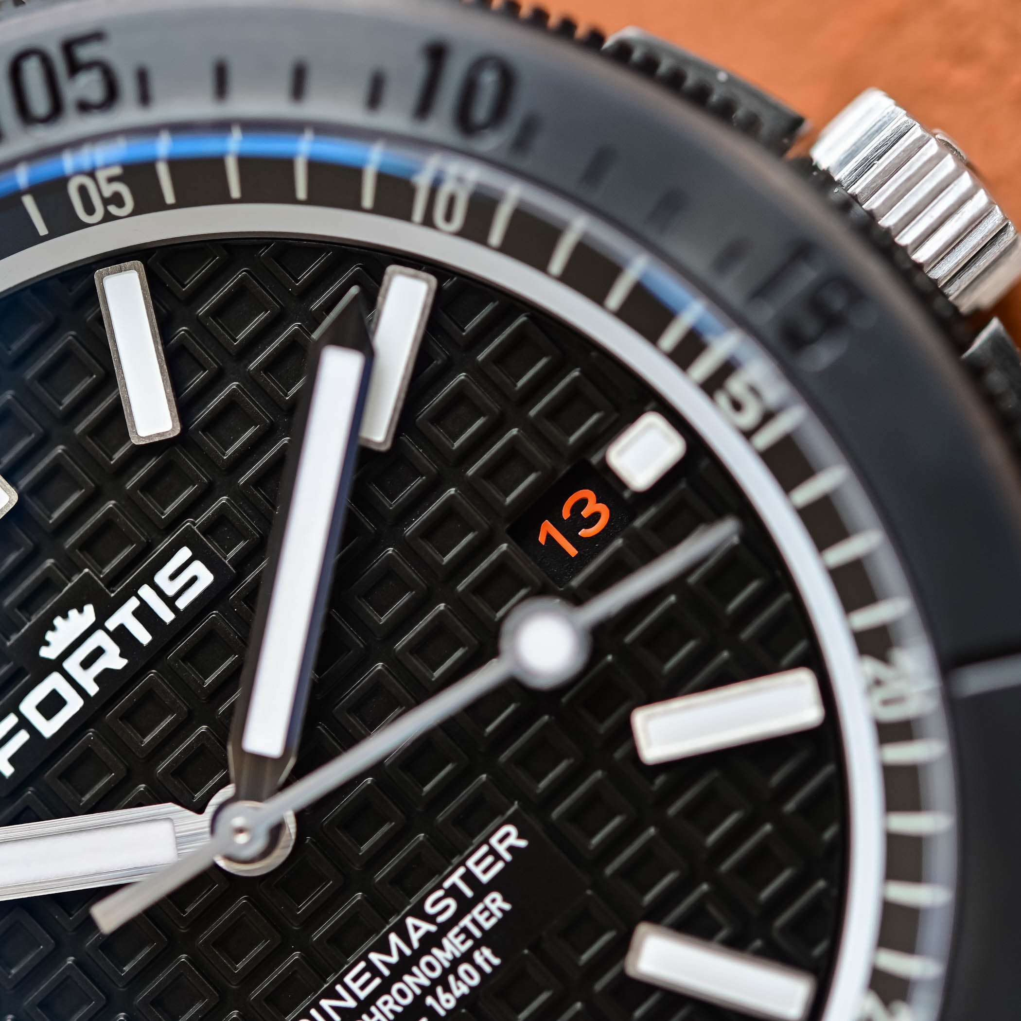 What doesn’t change is the overall construction and look of the case, which is still that of a rugged, focused sports watch with strong diving credentials. Measuring 44mm in diameter, the case of the M-44 is nevertheless quite compact on the wrist with a L2L of 48mm. These watches are water-resistant to a solid 500m and feature, as often with Fortis, several distinctive features for protection. In addition to the classic screw-down crown at 3 o’clock, the M-44 features an additional crown at 10 o’clock, a pretty straightforward locking system to lock the bezel into place. It works together with a bidirectional bezel. The main novelty for this year is the colour scheme, as the Marinemaster M-44 now gets a black Dianoir DLC-coating, a first for this collection.