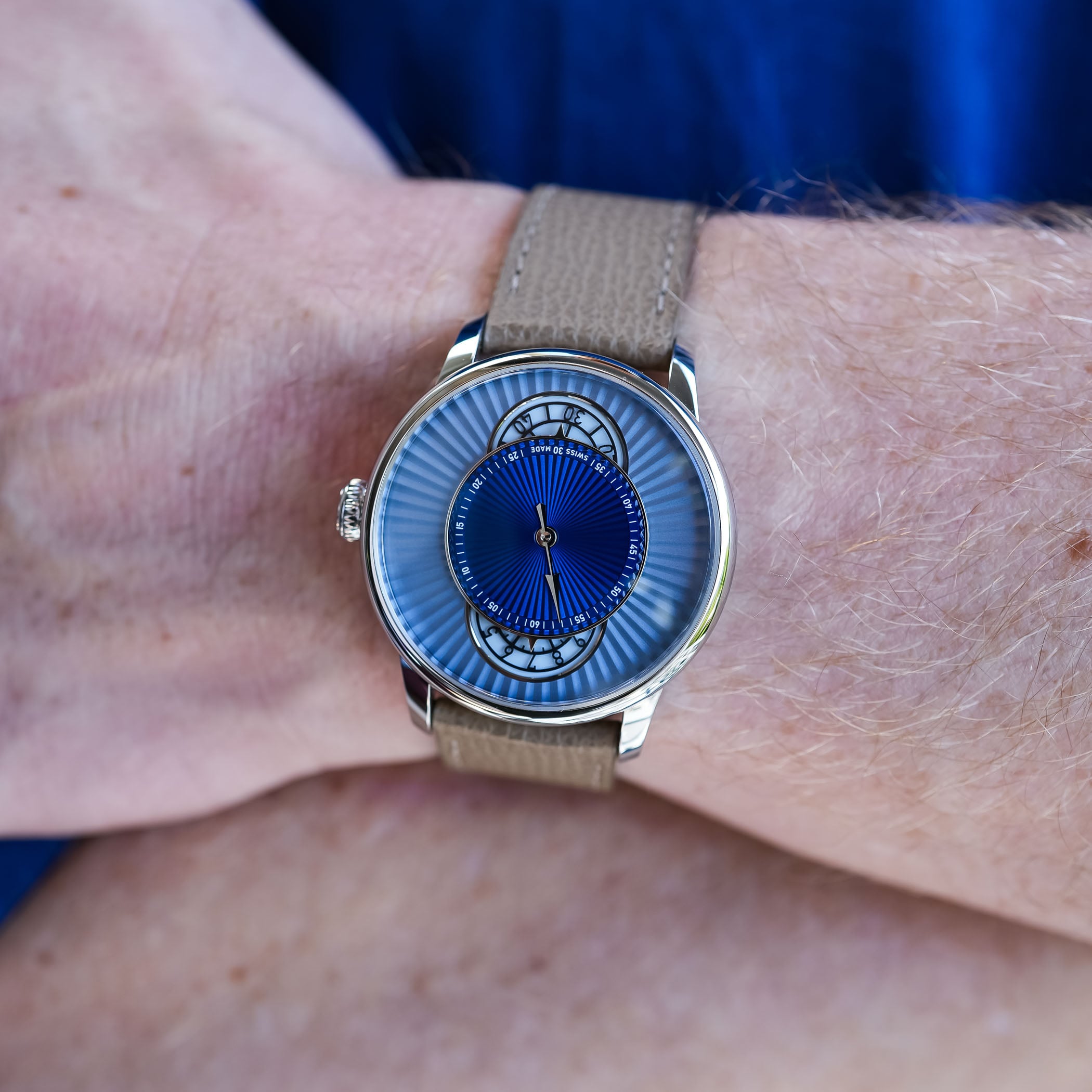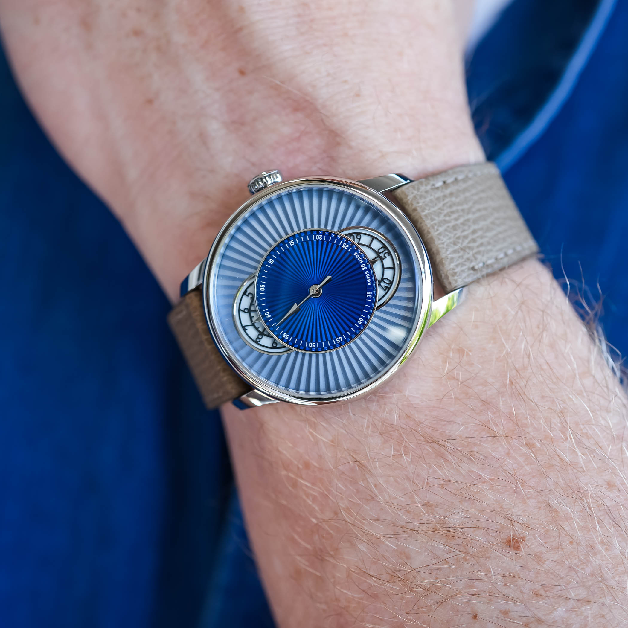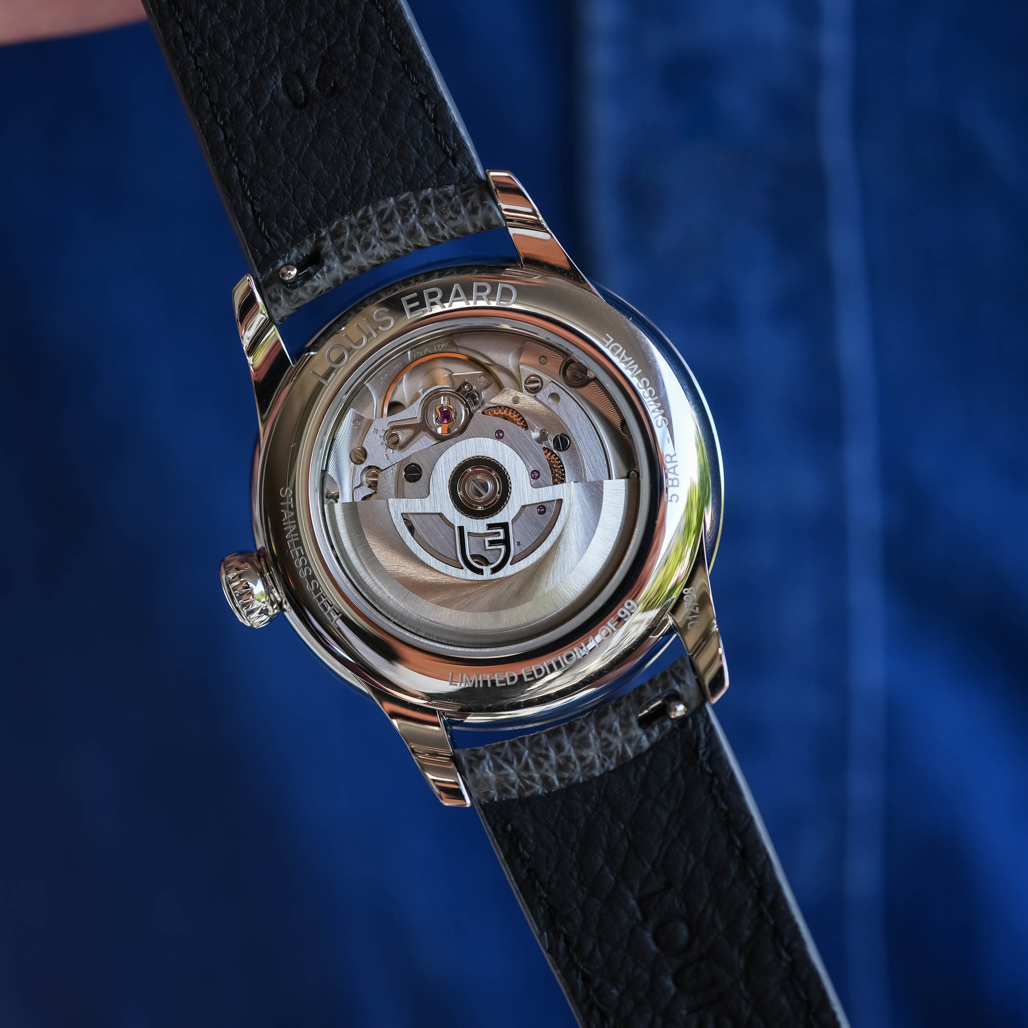 Louis Erard’s Regulator is the designated model for the latest transformation. Thanks to its three separate axes corresponding to the separate hours, minutes and seconds indications, the Regulator is one of the most frequently selected references for collaborations and artistic makeovers, including a recent collaboration with our friends at Worn & Wound with a blue flinqué enamel-inspired dial. Three years in the making, the blue Louis Erard Regulator for Worn & Wound is back, accompanied by a new grey proposal.