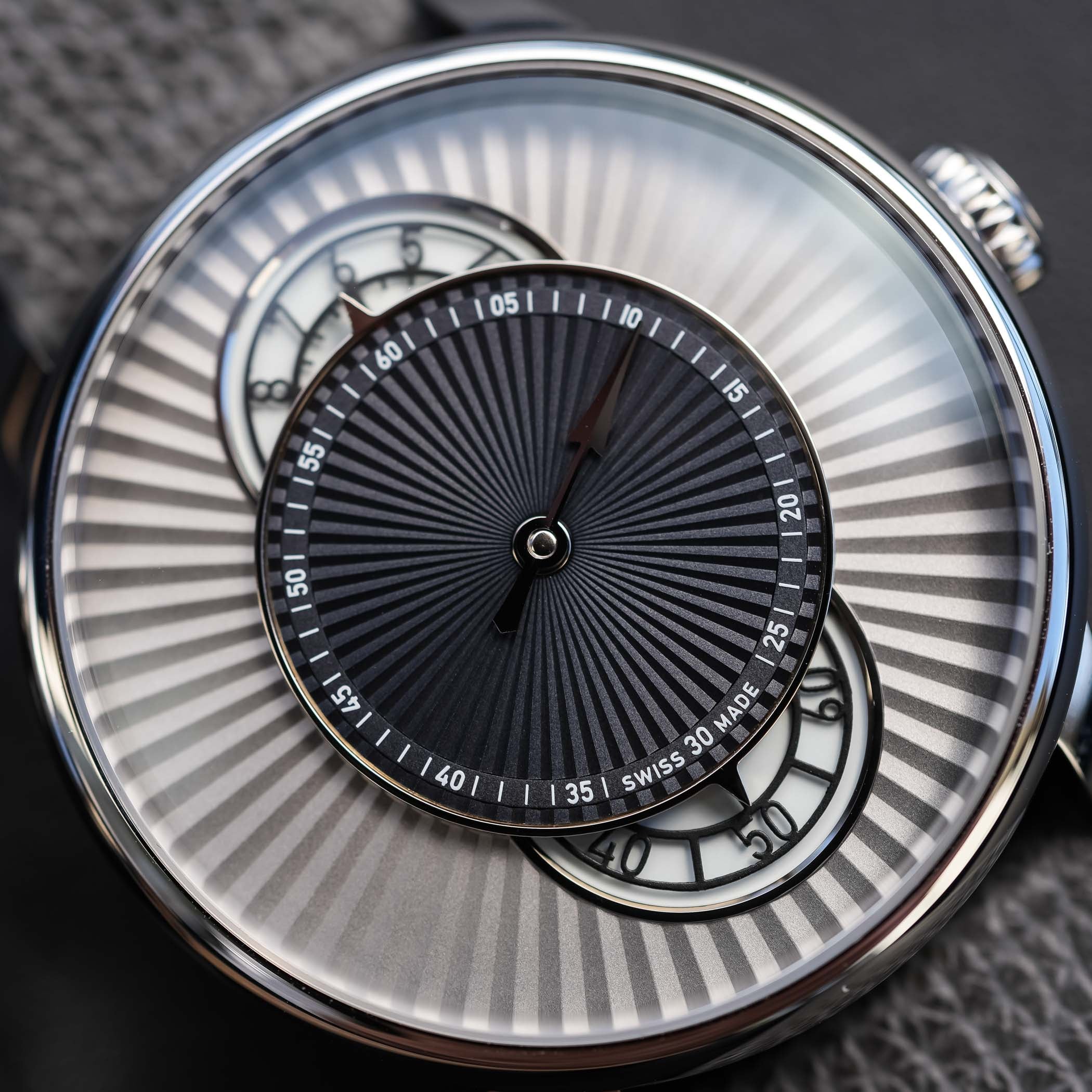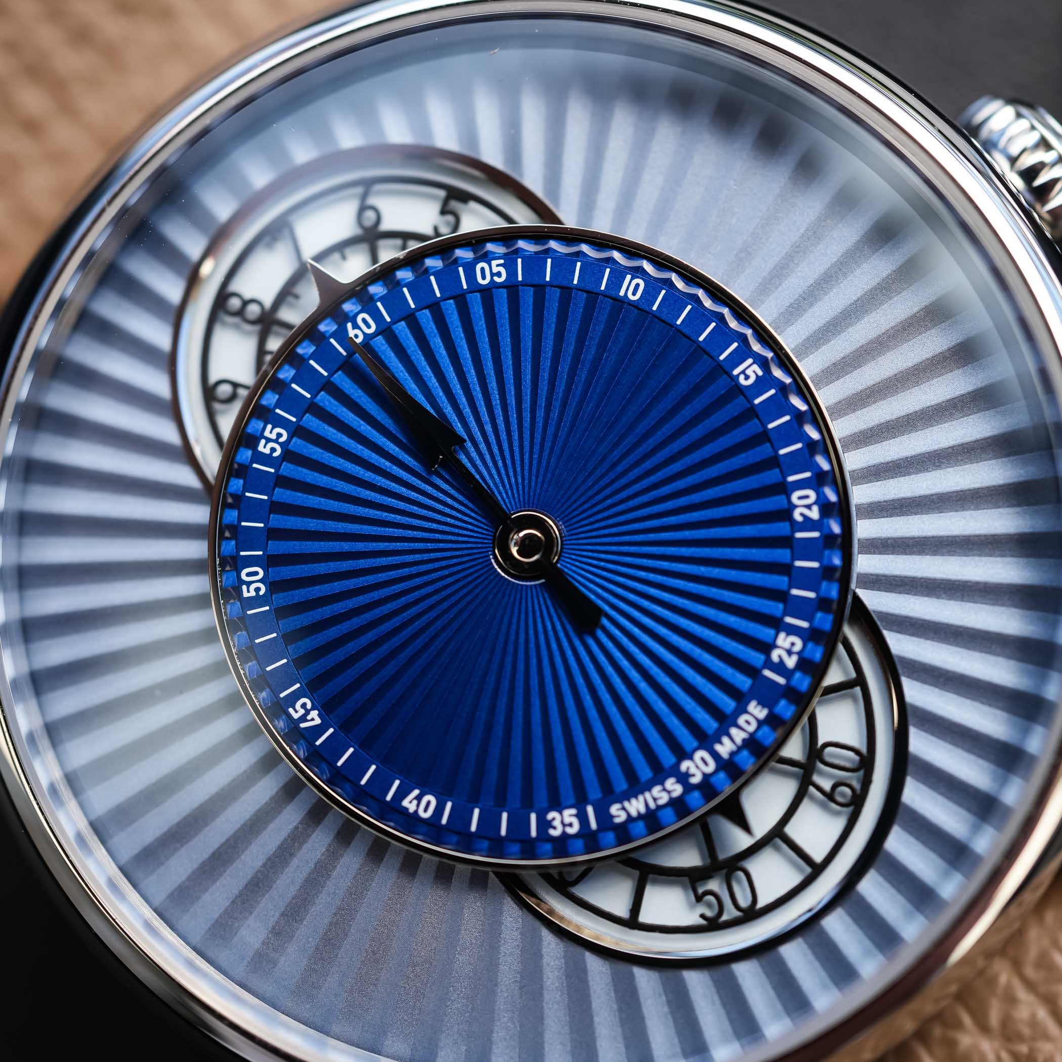 Reinterpreting the Regulator layout, the Esprit Flinqué comprises three distinct layers. The fluted base layer hosts two skeletonised sub-dials on a vertical axis with hours at noon and seconds at 6 o’clock. The first-ever skeletonised elements to appear on a Louis Erard watch, the sub-dials revolve underneath the larger top counter, indicating the minutes. Two pointers at either end of the frame surrounding the minutes disc indicate the hours and seconds, while the minutes rely on a signature Louis Erard fir-tree hand. The minutes are picked out in crisp white sans-serif numerals. There is no trace of branding on the dial; the only inscription is the Swiss Made straddling the 30-minute indicator.