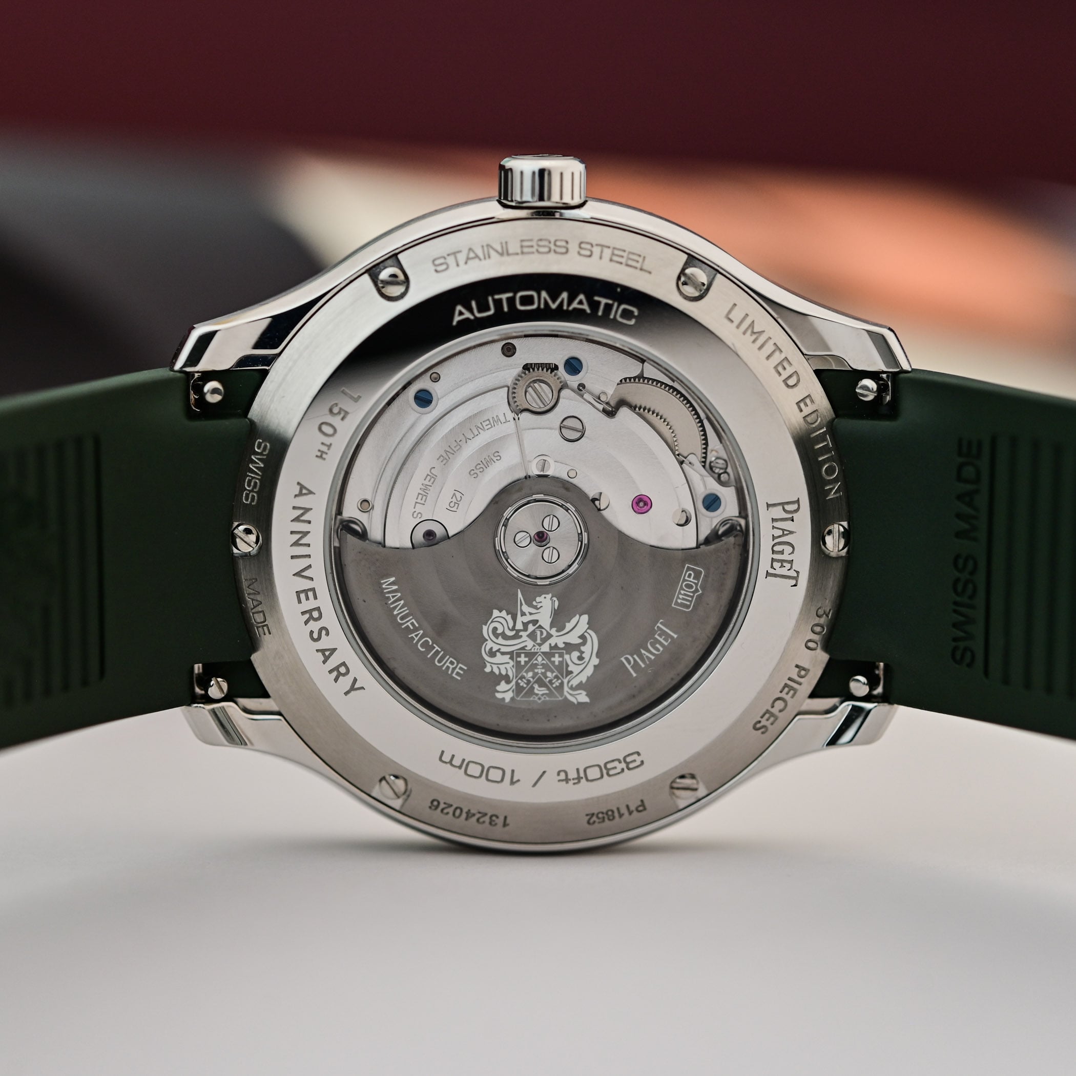 The largest 42mm x 9.4mm reference, with a water-resistance of 100 metres, comes in stainless steel and more luxurious 18k pink gold cases with silver or blue dials, with or without diamond-set bezels and indices. The movement inside the 42mm model is the automatic calibre 1110P, an evolution of Piaget’s automatic 800P. With a height of just 4mm, it operates at 28,800vph and has a power reserve of 50 hours. A stop-seconds mechanism allows you to set the time with precision.
