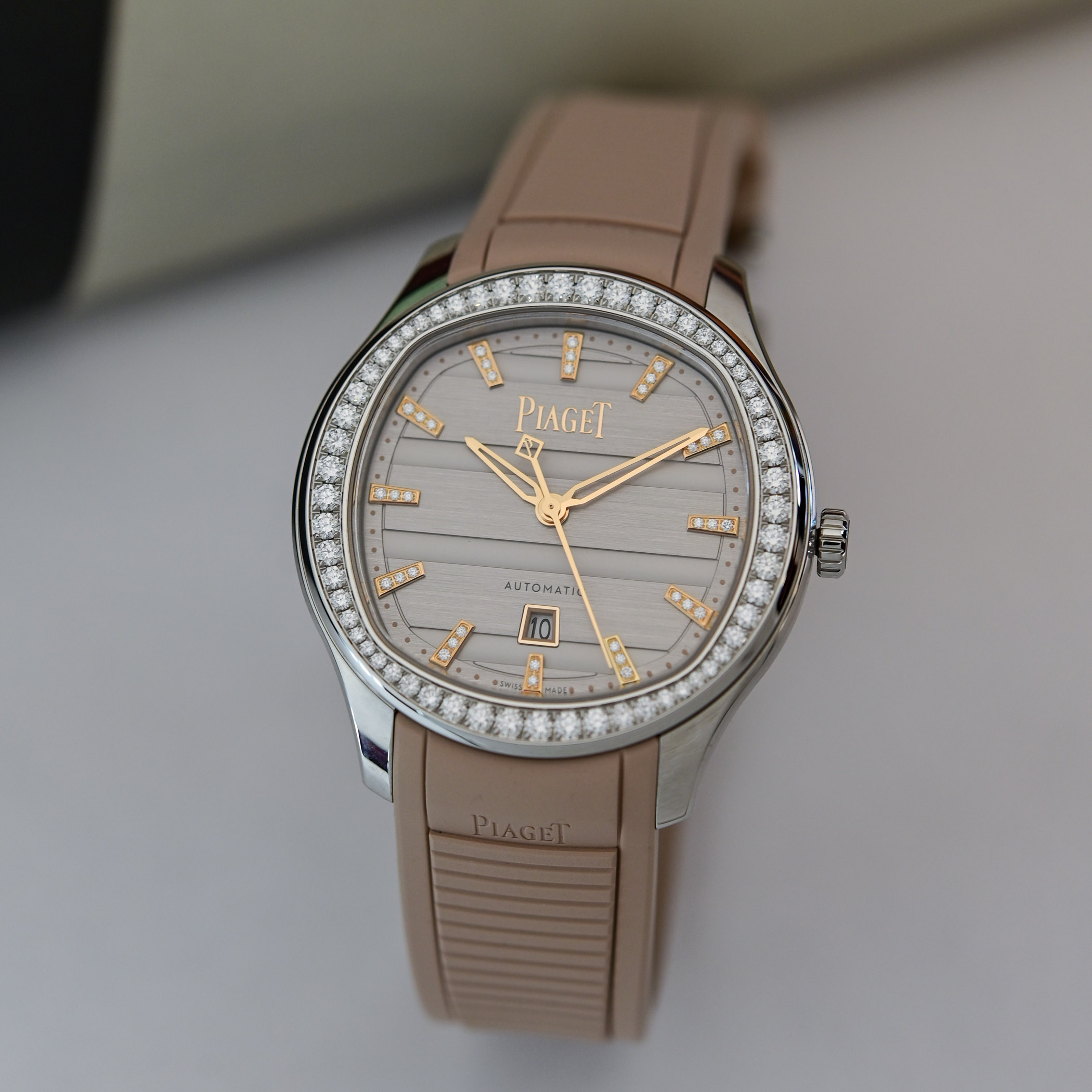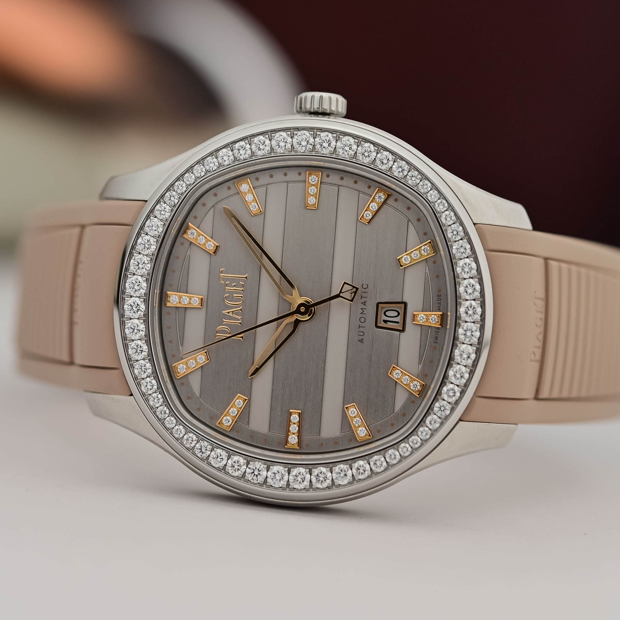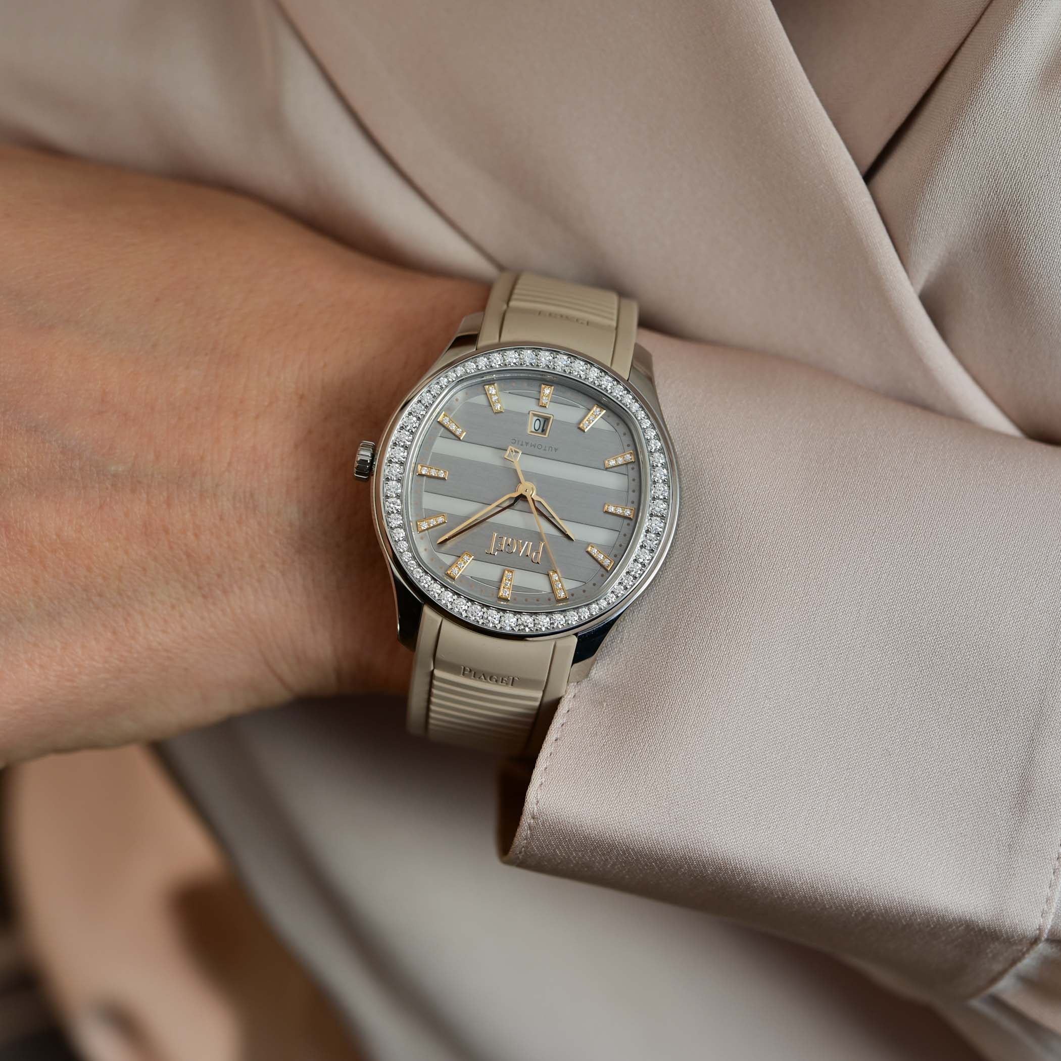The more compact 36mm x 8.8mm model, with 50m water-resistance, also comes in steel or 18k pink gold cases with silver or blue dials and a choice of diamond-set indices, diamond-set bezels, or both. Powering the 36mm model is Piaget’s in-house calibre 500P1. This automatic movement with a central rotor has an ultra-slim height of 3.6mm and delivers a power reserve of 40 hours.