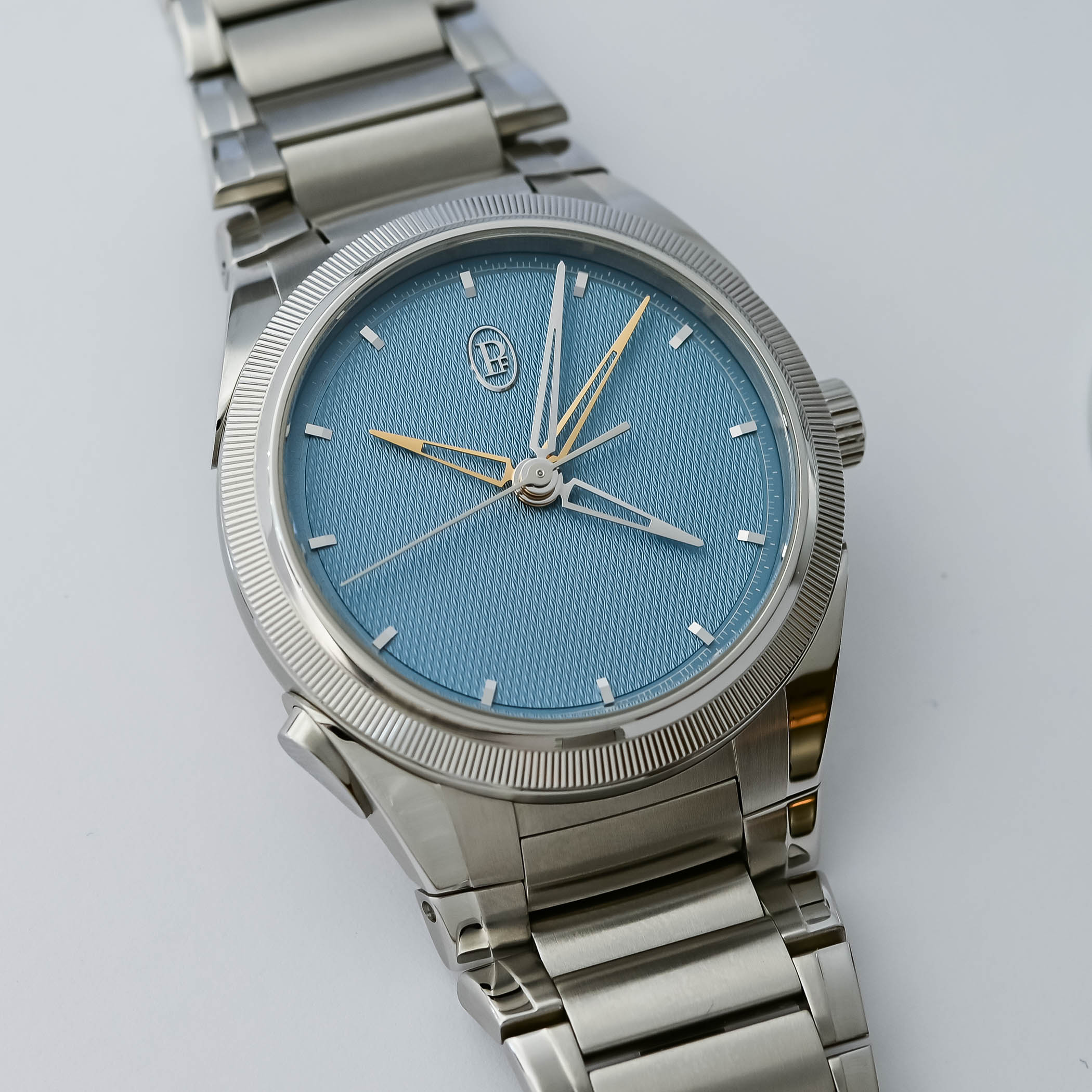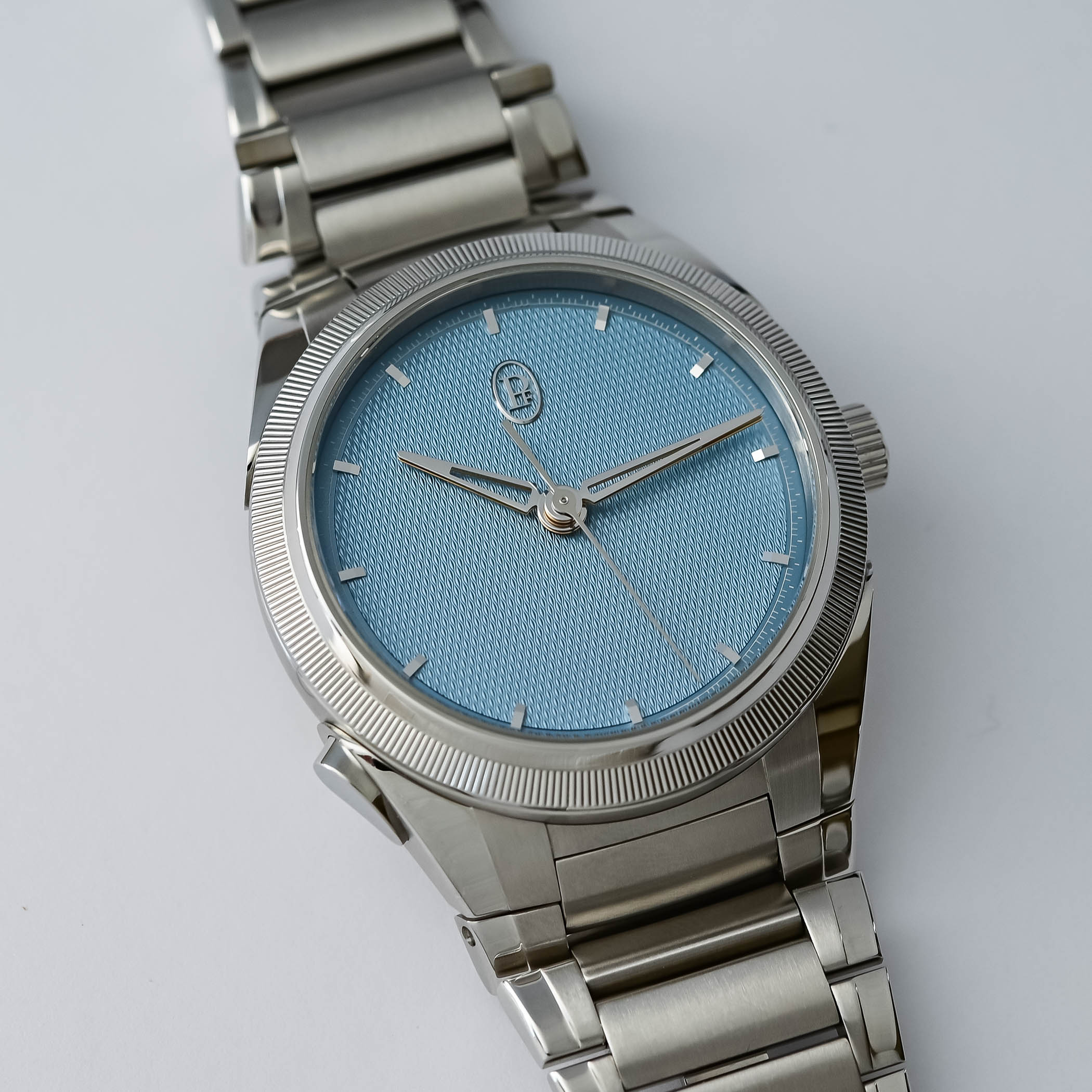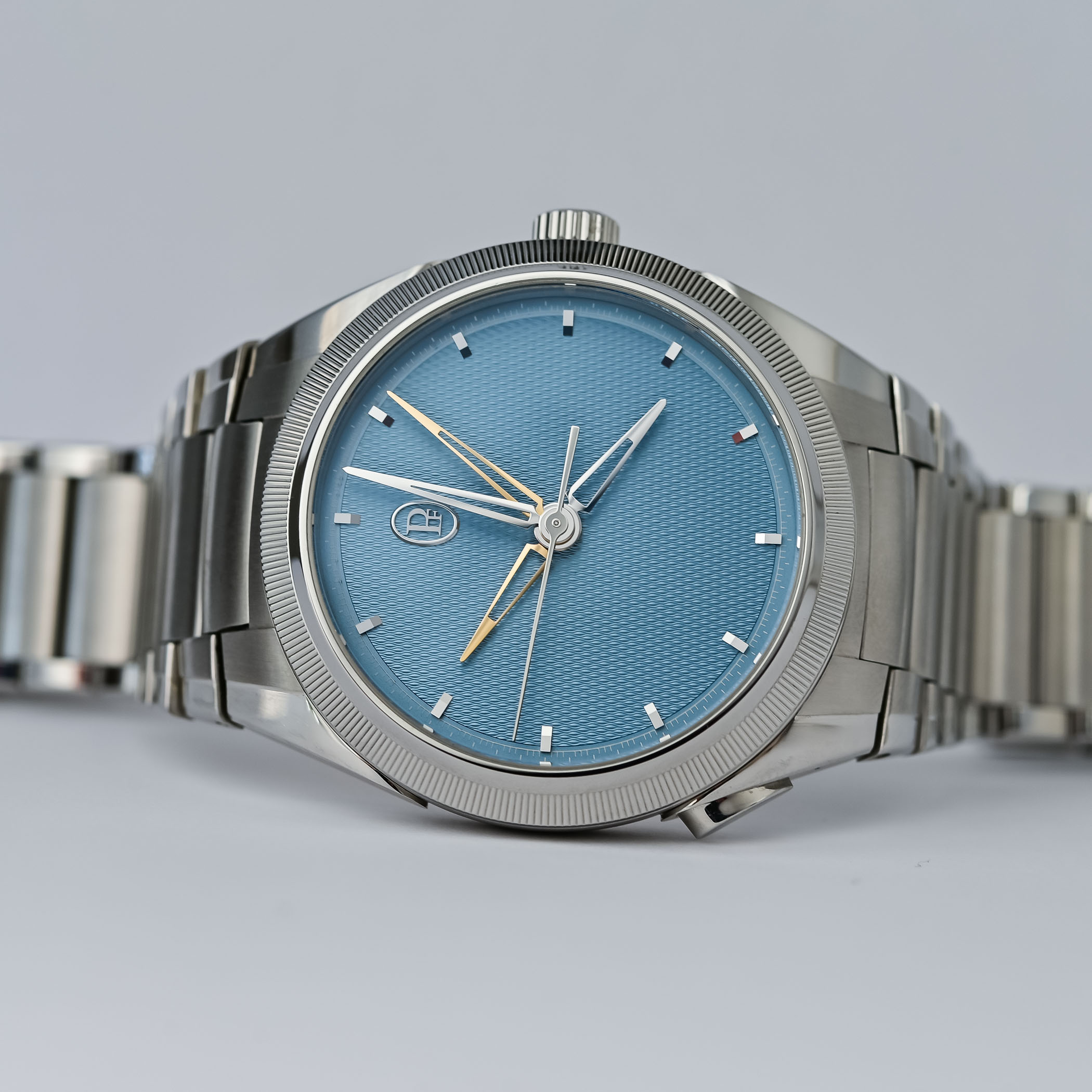 Housed in a 40mm stainless steel case with a platinum knurled bezel, a thickness of 13mm, and the hallmark traits of the Tonda PF family, the watch, at first glance, looks like a three-hand Tonda with a refined, uncluttered Mineral Blue grain d’orge guilloché dial, applied gold indices and openworked gold delta hands. The only giveaway that there might be something else going on is the presence of a polished teardrop-shaped pusher at 7:30 on the left side of the case. And this is where the magic begins.