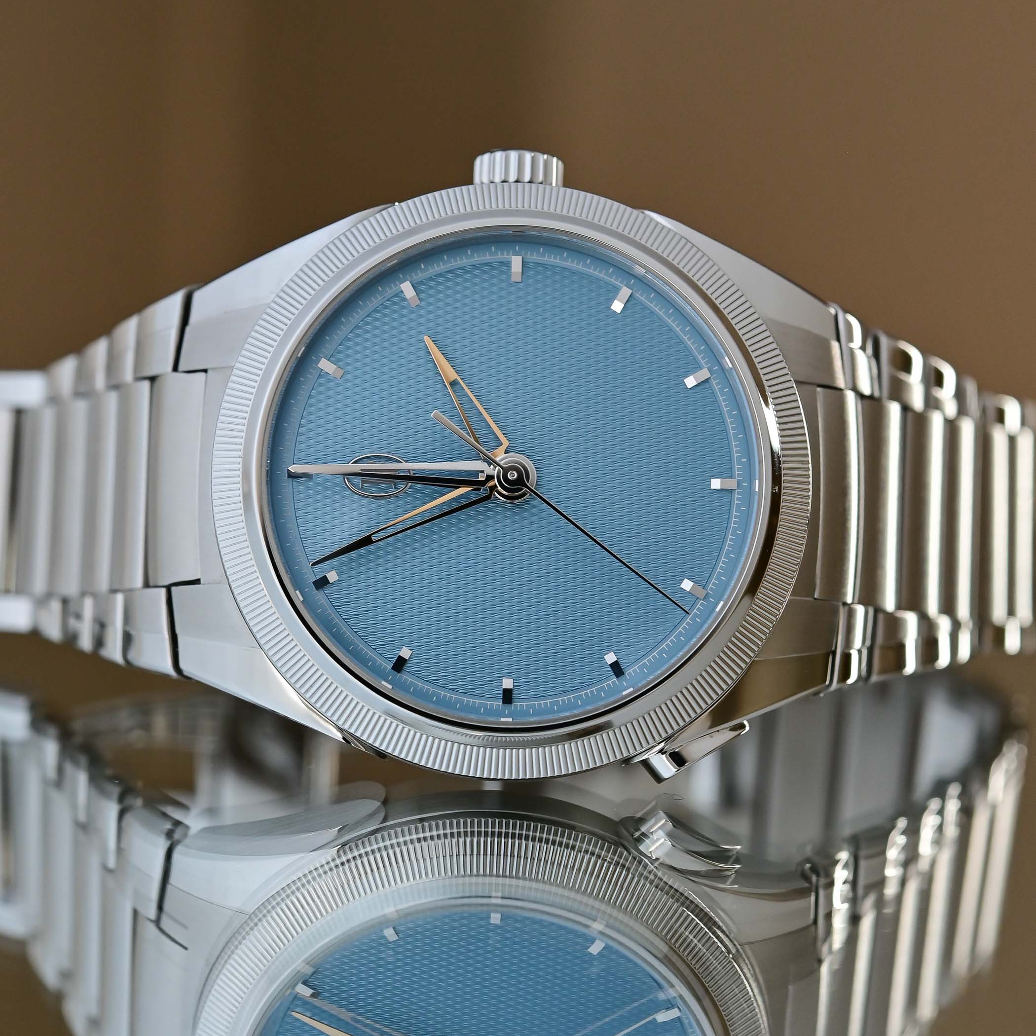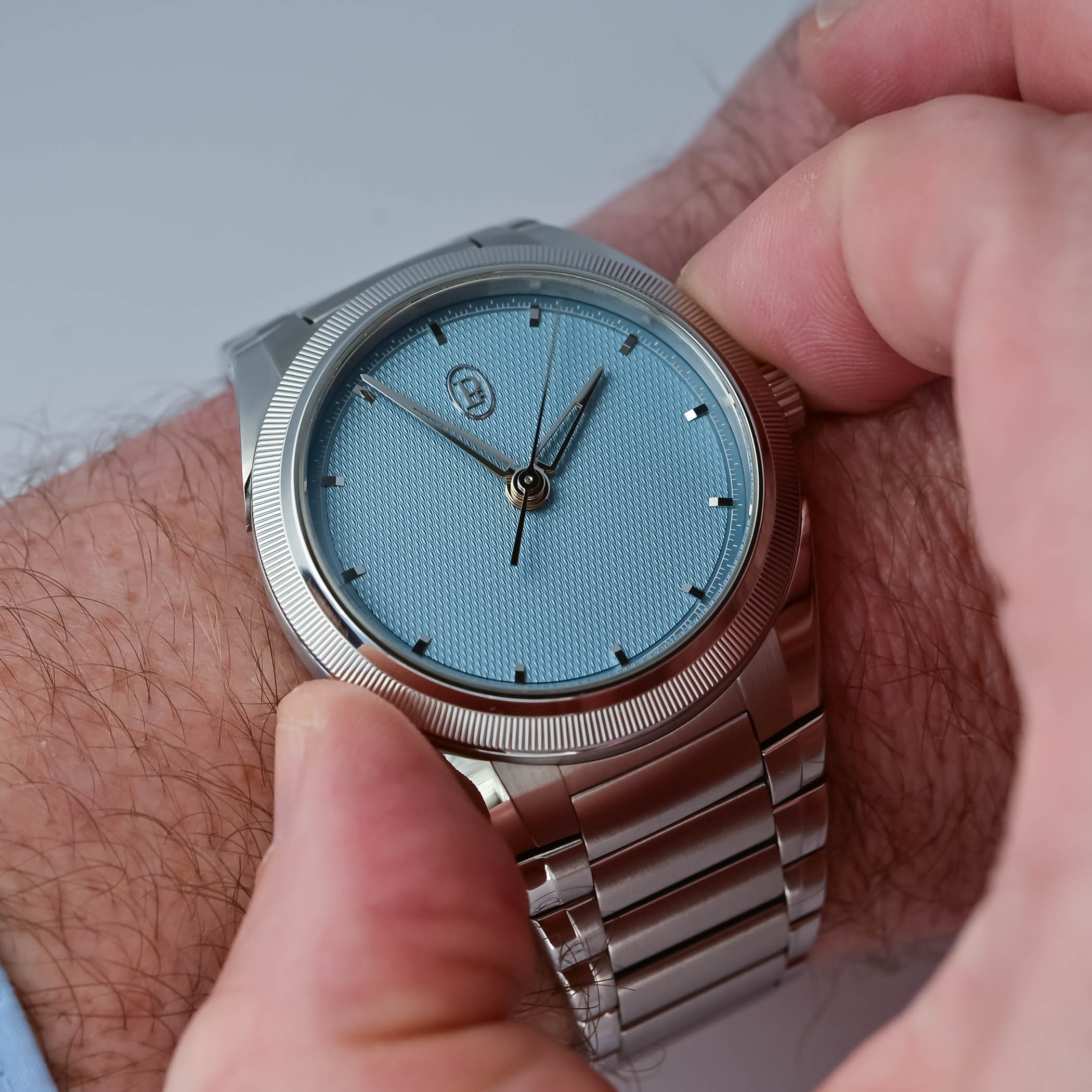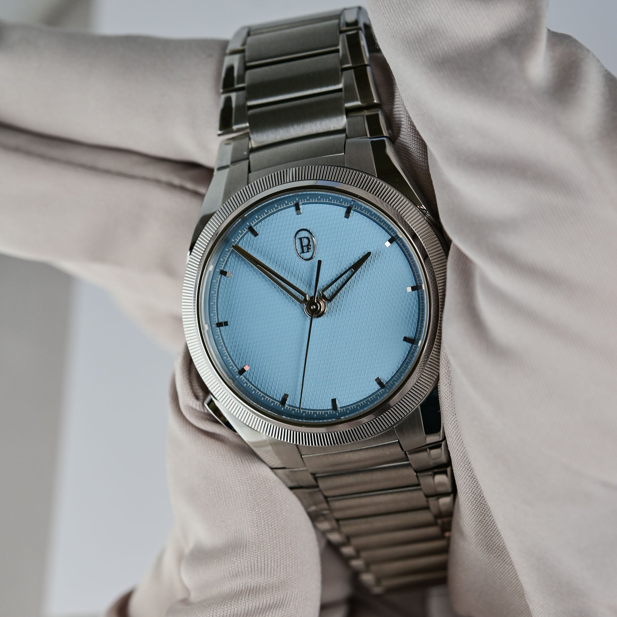 Housed in a 40mm stainless steel case with a platinum knurled bezel, a thickness of 13mm, and the hallmark traits of the Tonda PF family, the watch, at first glance, looks like a three-hand Tonda with a refined, uncluttered Mineral Blue grain d’orge guilloché dial, applied gold indices and openworked gold delta hands. The only giveaway that there might be something else going on is the presence of a polished teardrop-shaped pusher at 7:30 on the left side of the case. And this is where the magic begins.