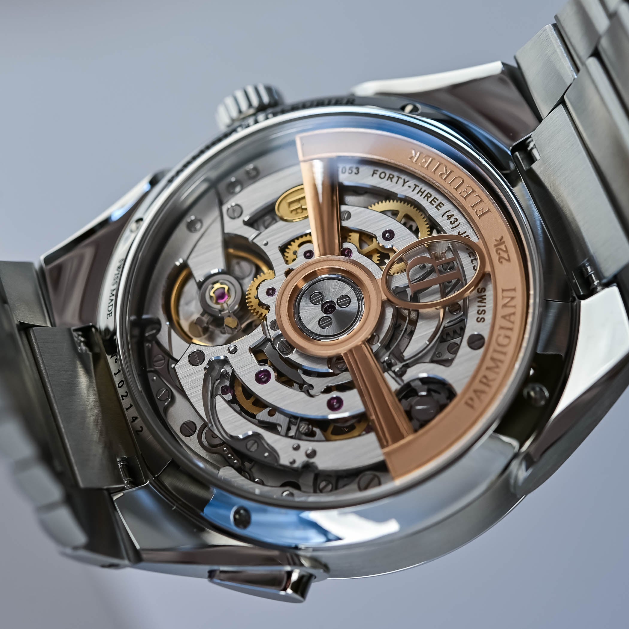 As any watchmaker will confess, an integrated chronograph is one of the most demanding constructions to pull off. The PF053 calibre was conceived to perform a disappearing act, enabling the chronograph indications to vanish at rest and awakening them on demand. This incredible kinematic feature, activated by a single pusher, required an unprecedented architectural approach to ensure energy management and smooth mechanical transitions. Comprised of 362 components, some of which can be admired on the caseback, the integrated column-wheel chronograph movement measures 32.4 x 6.8mm, beats at 28,800vph and delivers a robust 60-hour power reserve. Decorated to Parmigiani’s high standards, the 22k rose gold rotor displays sandblasted and polished surfaces, and the openworked bridges reveal satin-finished surfaces and hand-bevelled angles.