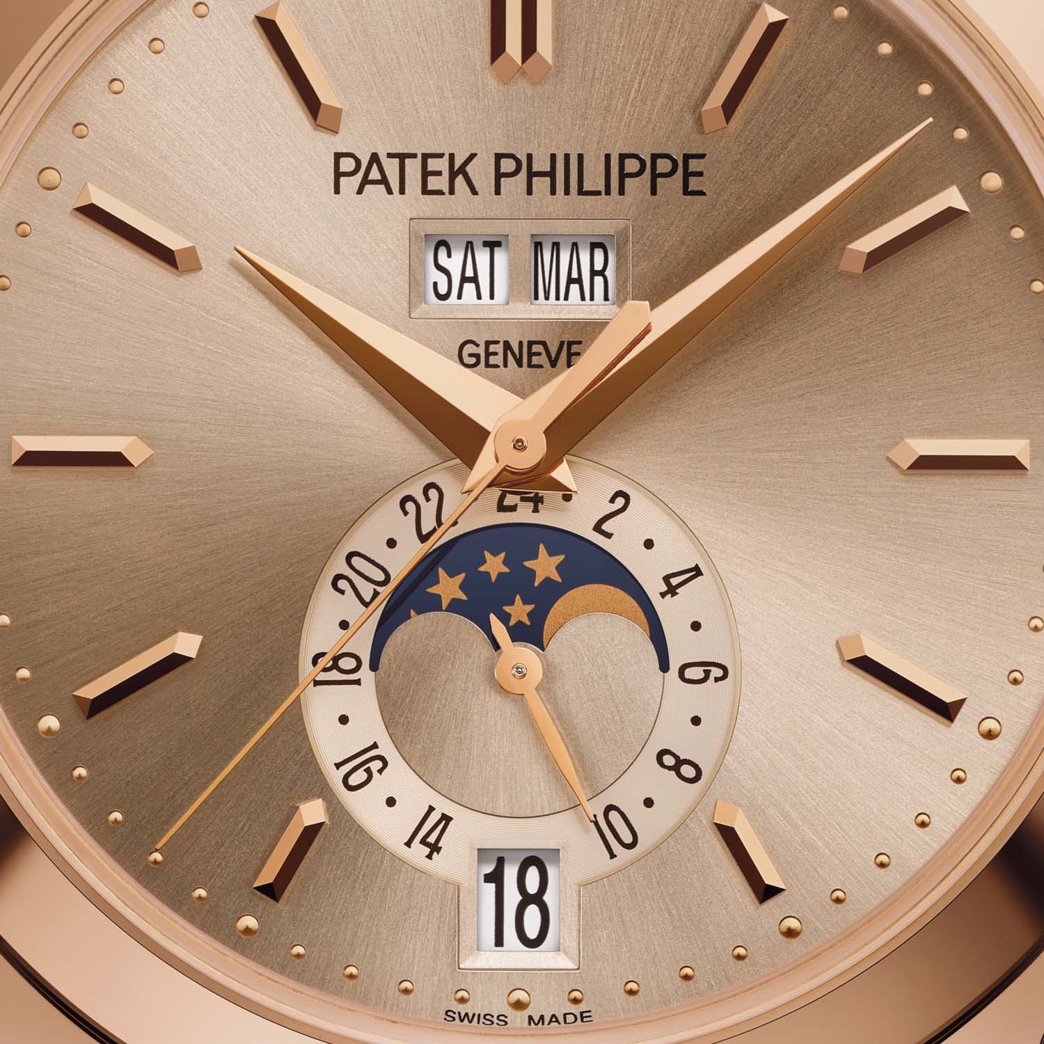The new reference is defined by its sand-beige sunburst dial, with faceted rose gold applied obus-style markers and faceted dauphine hands, along with a slender central seconds hand. At 6 o’clock, the snailed subdial for the 24-hour display and moon phases introduces a subtle texture to enhance legibility.