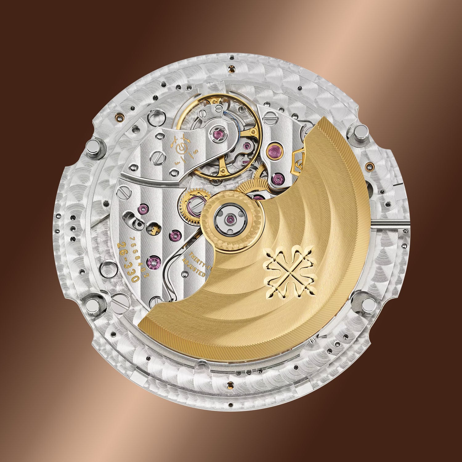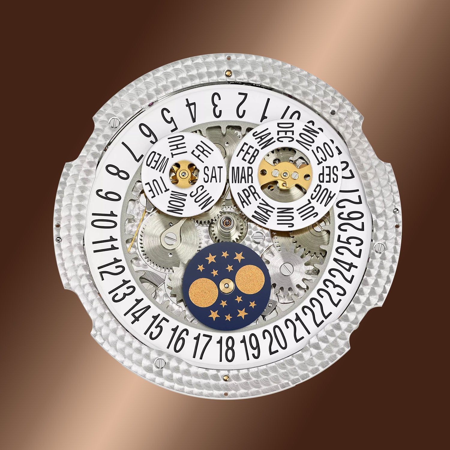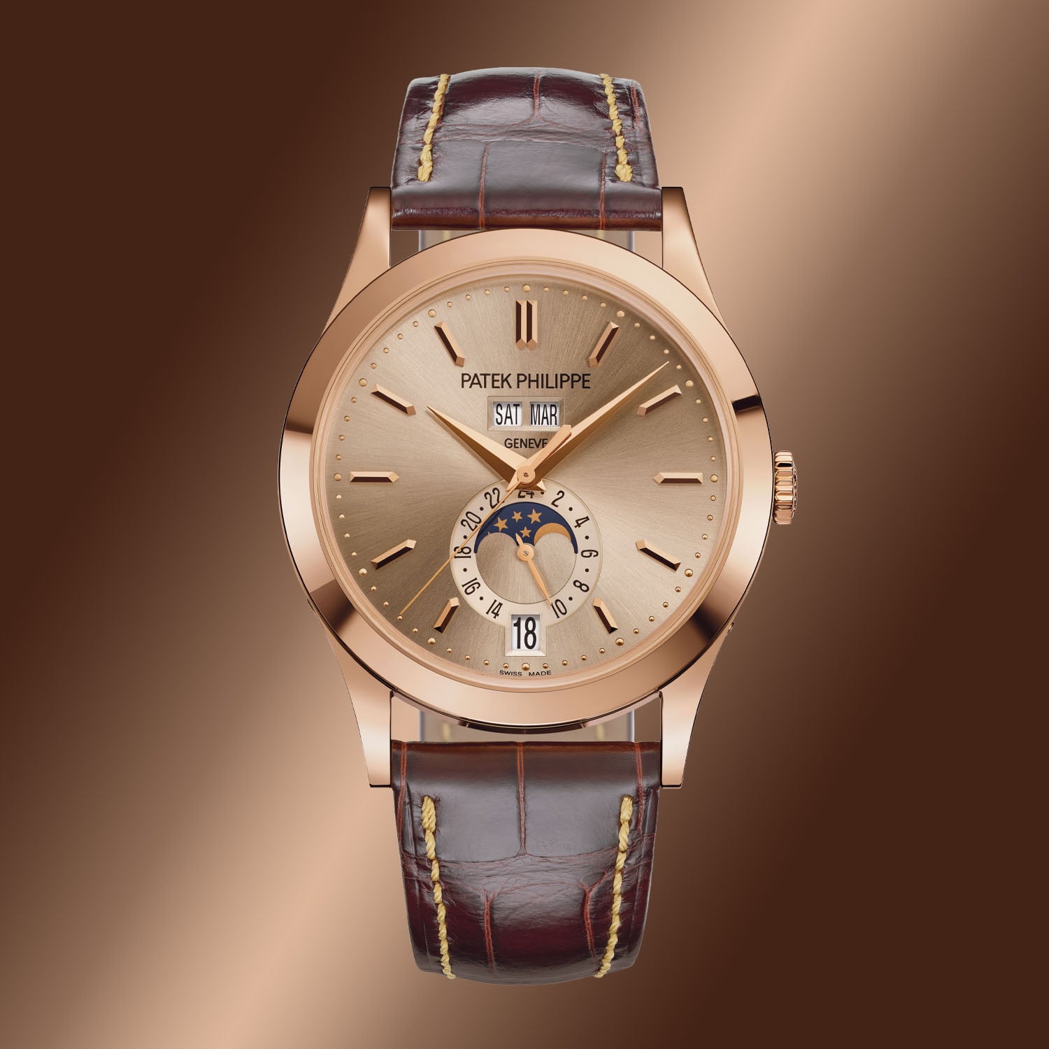 The watch remains faithful to the restrained proportions that have defined the model for nearly two decades. The 38.5mm by 11.25mm rose gold case, fully polished, follows the shape of the historic Patek Philippe Calatrava Reference 96, with smooth flanks and a slim bezel framing the dial. Small corrector pushers at 2, 4, 8 and 10 o’clock, integrated into the case flanks, allow adjustment of the calendar indications and moon phase; the sapphire caseback reveals the movement. Water-resistance is 30m.
