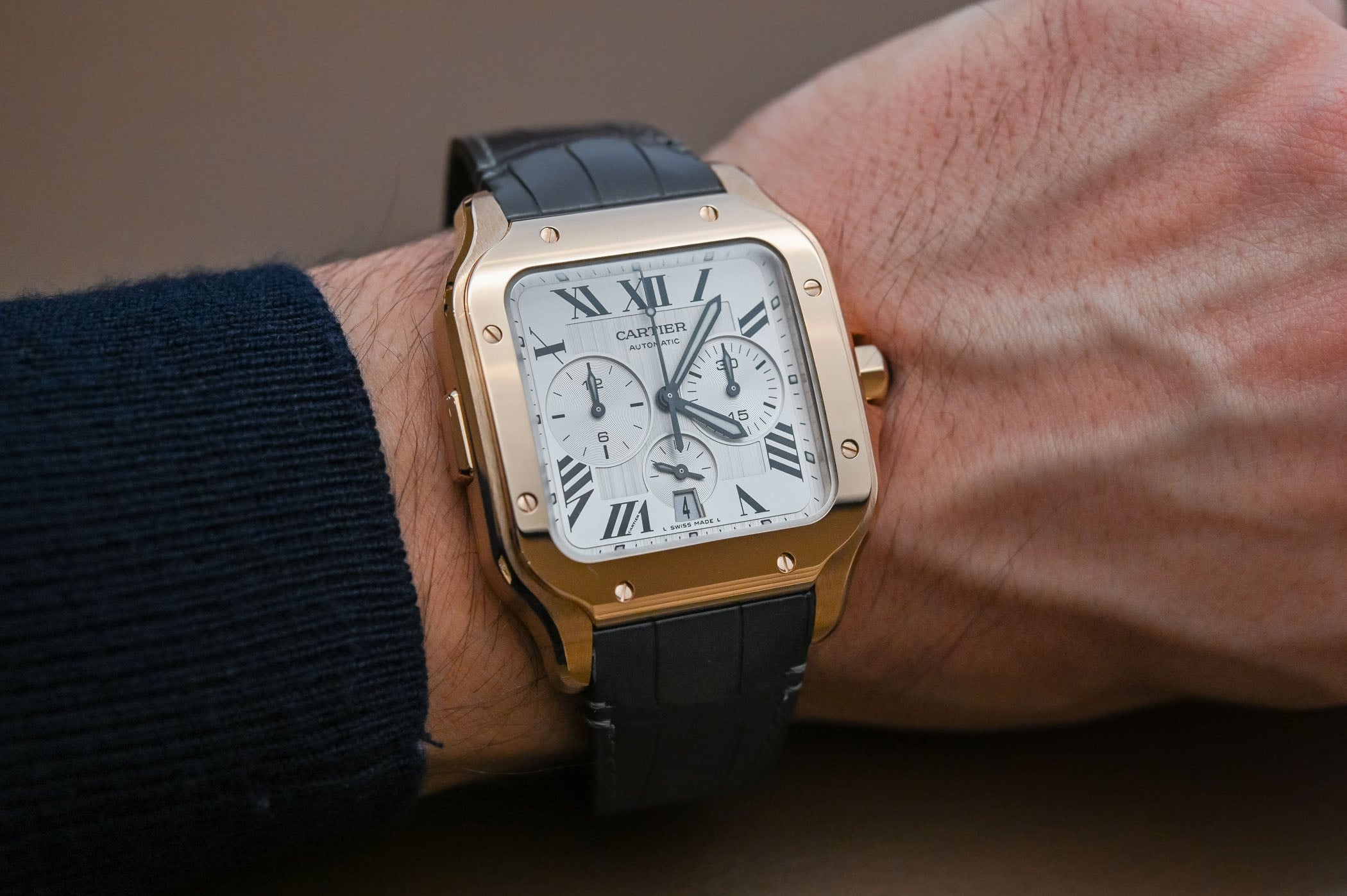 This size reduction isn’t the only update for the 2026 Santos de Cartier chronograph. One of the distinctive elements of the older version, the unusual position of the pushers, is gone. The updated model comes back to a traditional 2-pusher layout, with chronograph buttons placed at 2 and 4 o’clock and operating like most stopwatches on the market (start-stop at 2 o’clock, reset at 4 o’clock). The rest is classic Santos, with a satin-finished middle case with large polished lateral bevels, a polished bezel with functional screws and a gentle curve from top to bottom, making the watch fairly ergonomic on the wrist. As a sports watch, it is water-resistant to 100m.