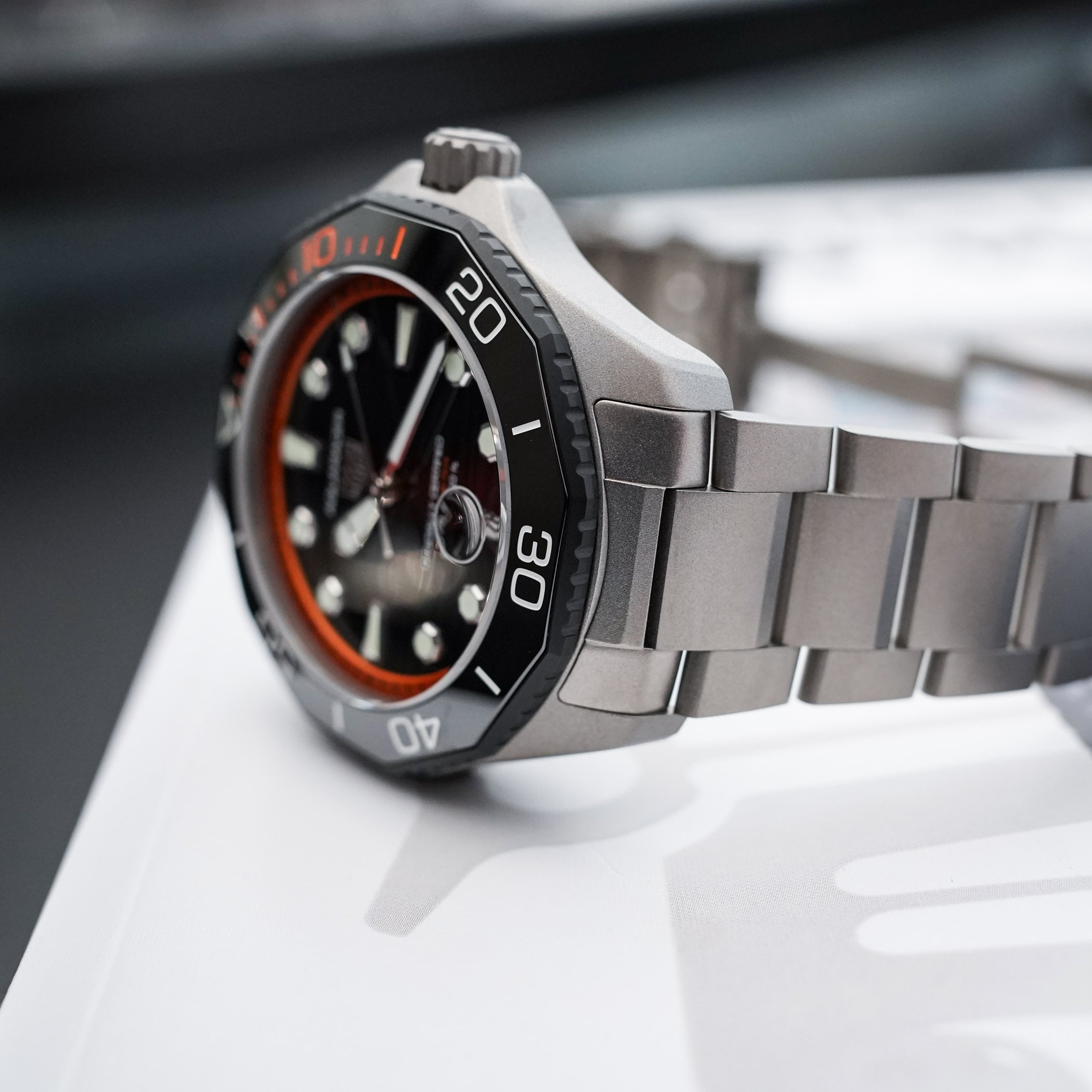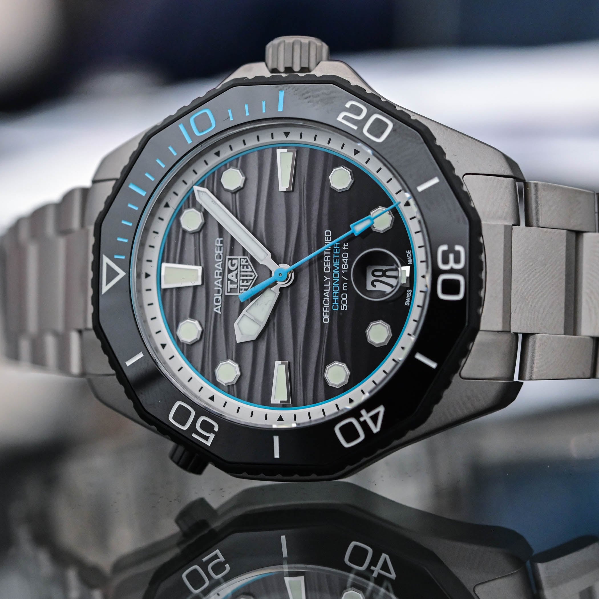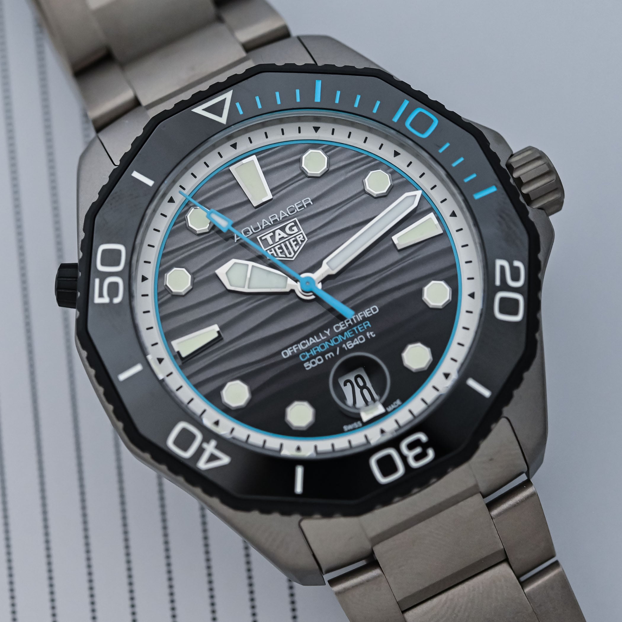 Unlike the bulky Superdiver, a watch with very serious diving credentials (as tested by our resident diver Derek), the Aquaracer Professional 500 Date retains a versatile 42mm case with a manageable profile. But it remains, nonetheless, a solid tool for aquatic activities. Crafted from grade 2 titanium, the case and bracelet emphasise lightness and durability. At just 120 grams, the watch feels noticeably lighter than its steel counterparts. The construction remains faithful to the modern Aquaracer design language, with a dodecagonal unidirectional bezel, strong angular lines and a mix of sandblasted finishes.
