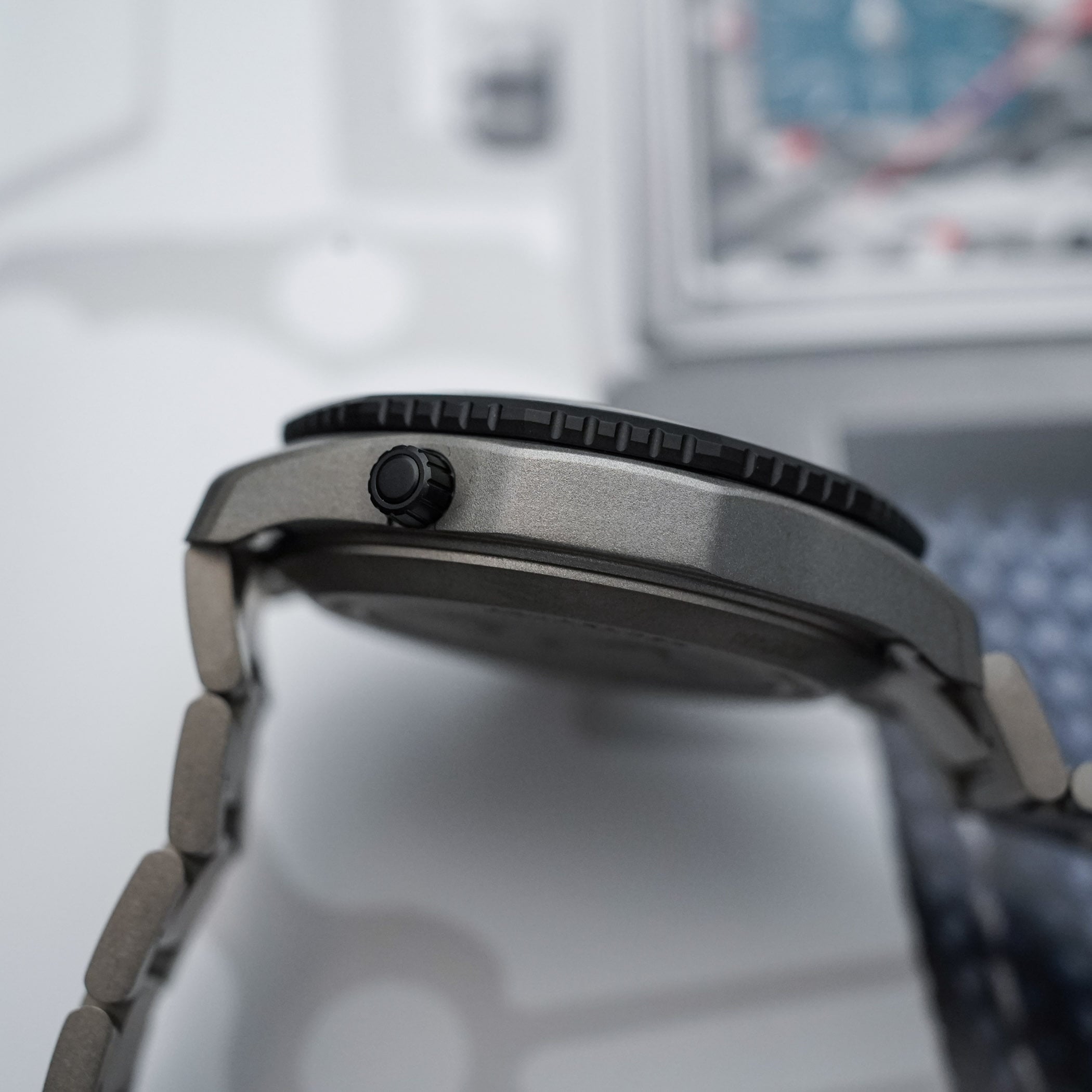 The watch is delivered on a matching titanium bracelet closed with a folding clasp with double safety push-buttons and featuring a micro-adjustment system, ensuring secure wear over a wetsuit and comfort on a daily basis.