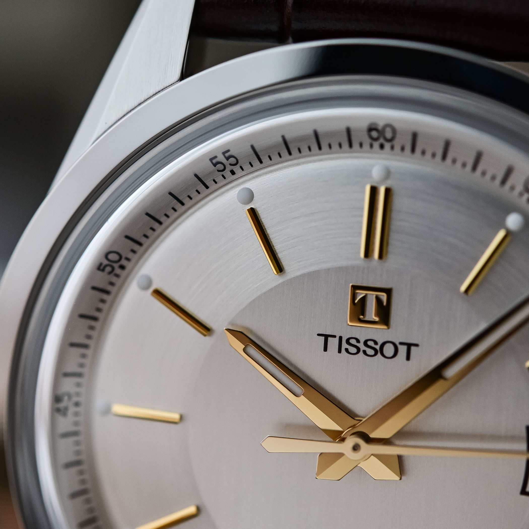 Moving on to the dial, and before talking about colours, the Visodate changes everything here too. From a dial that was previously flat and rather simple, Tissot now moves to something with far more depth and detail. Contrasting with the taut lines of the case, the dial plays on curves, a feeling that’s enhanced by the box-shaped sapphire crystal and the domed profile of the dial. The latter combines two types of finishing, with an interplay of circular and vertical brushing that plays nicely with the ambient light. The dial is framed by an angled inner flange with minutes and seconds track. At 3 o’clock, the trapezoidal date window is emphasised by a framing line, making it stand out (expected considering the original vocation of the watch).