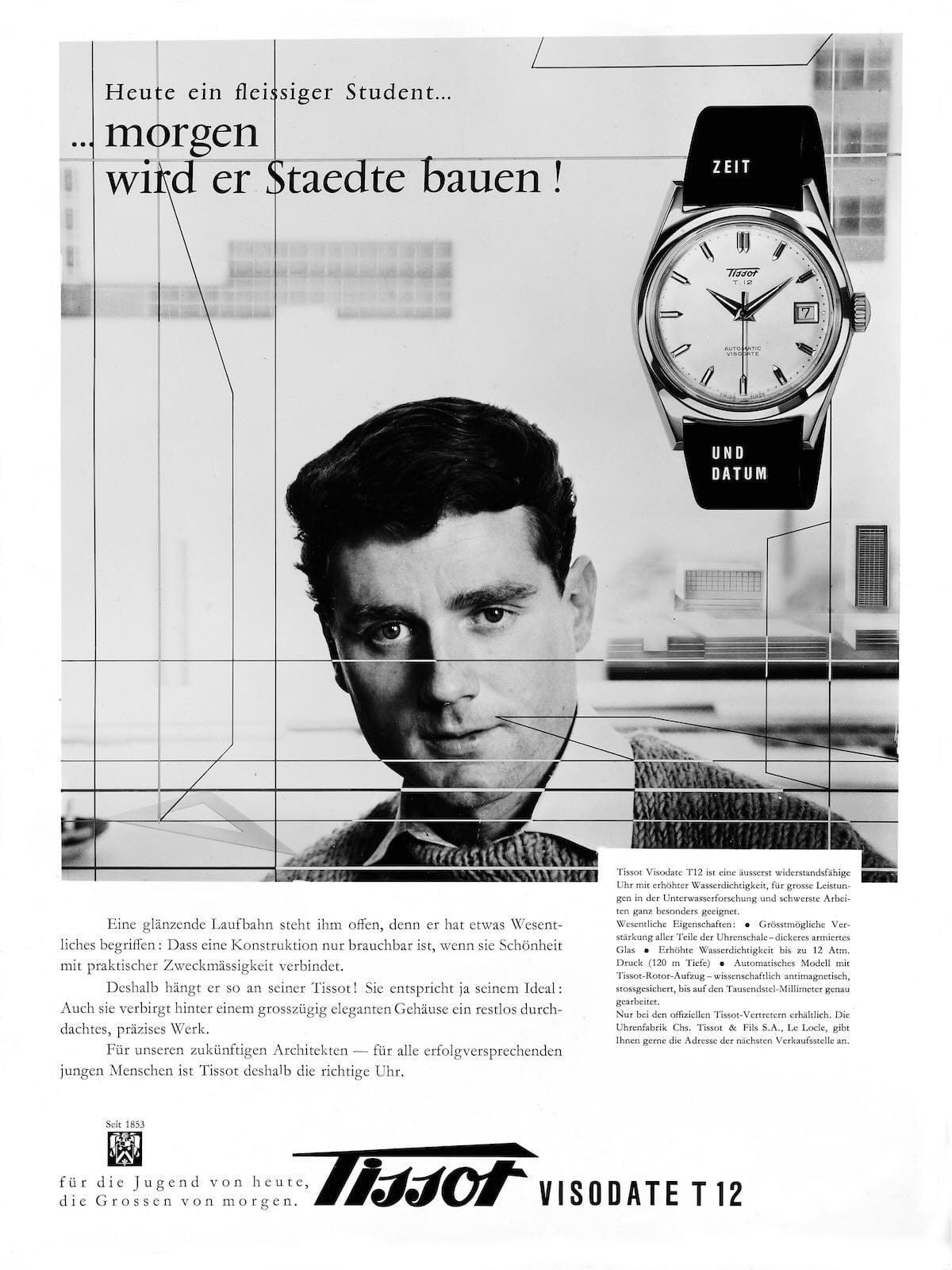 So, why does the Tissot Visodate matter? In 1953, Tissot was celebrating its 100th anniversary and released the Centenary model, a watch with a sleek date window at 3 o’clock, and also the first automatic watch to feature a date window that instantaneously changed at midnight. This model paved the way for the Visodate released a year later. The concept proved popular and later spread across multiple models, such as the Visodate Camping, the Visodate Seastar Automatic or the Visodate Seastar Seven.