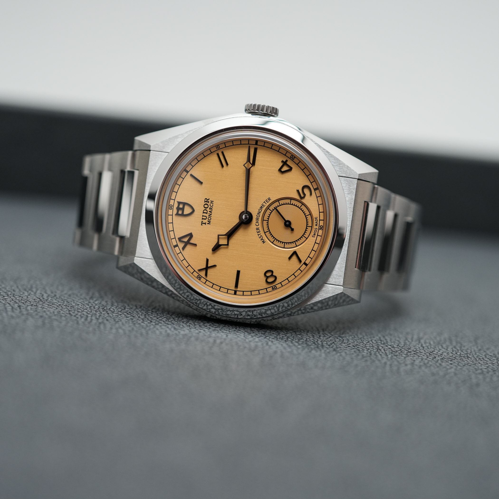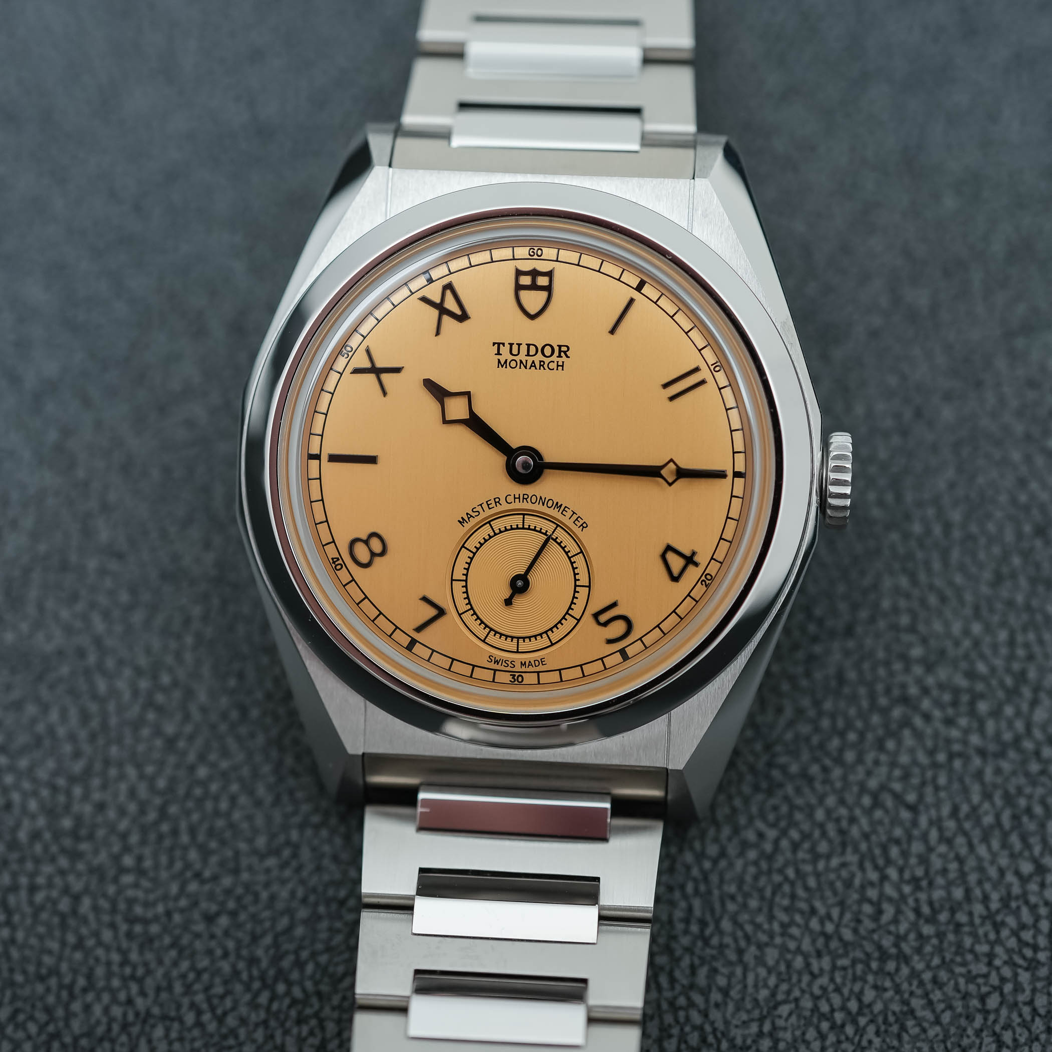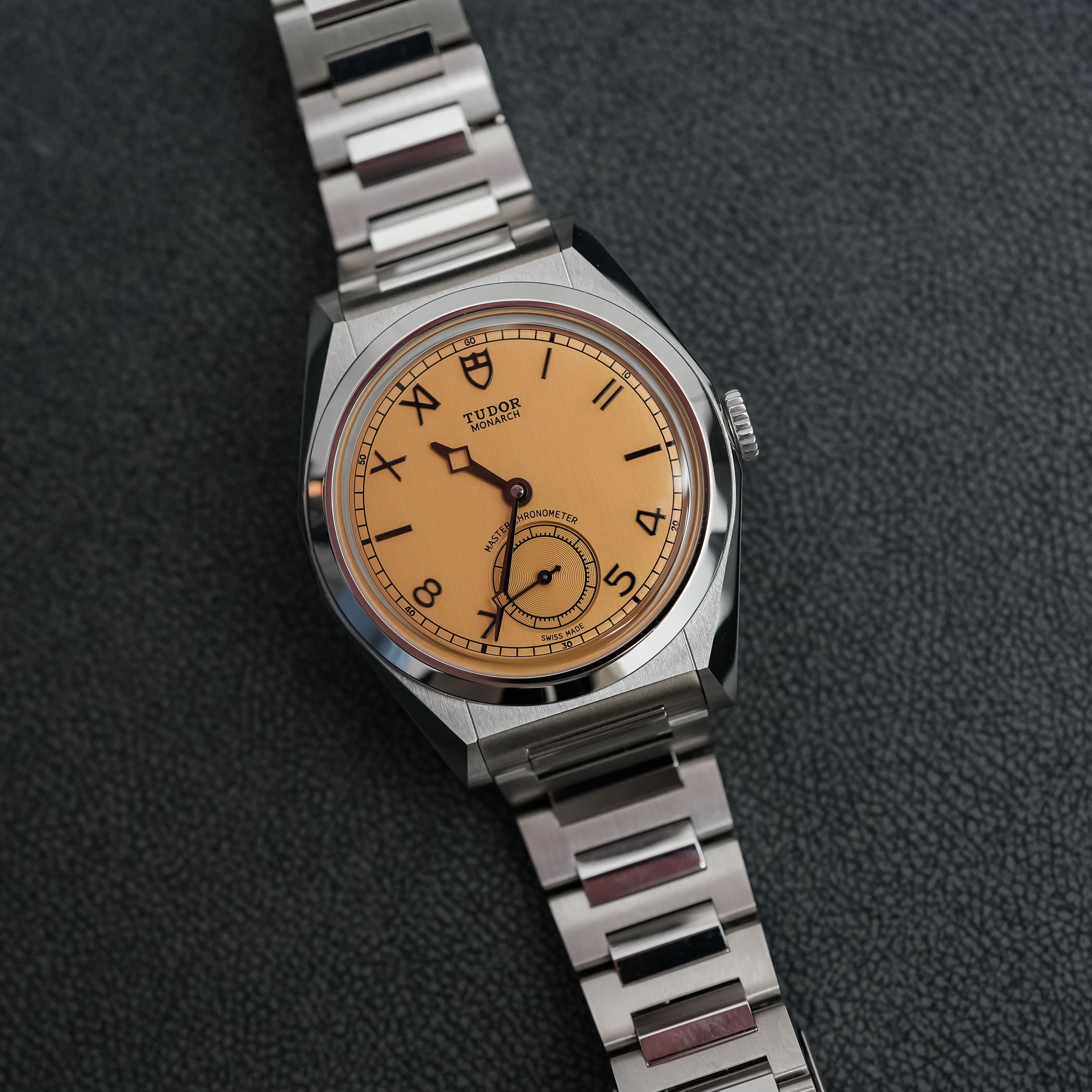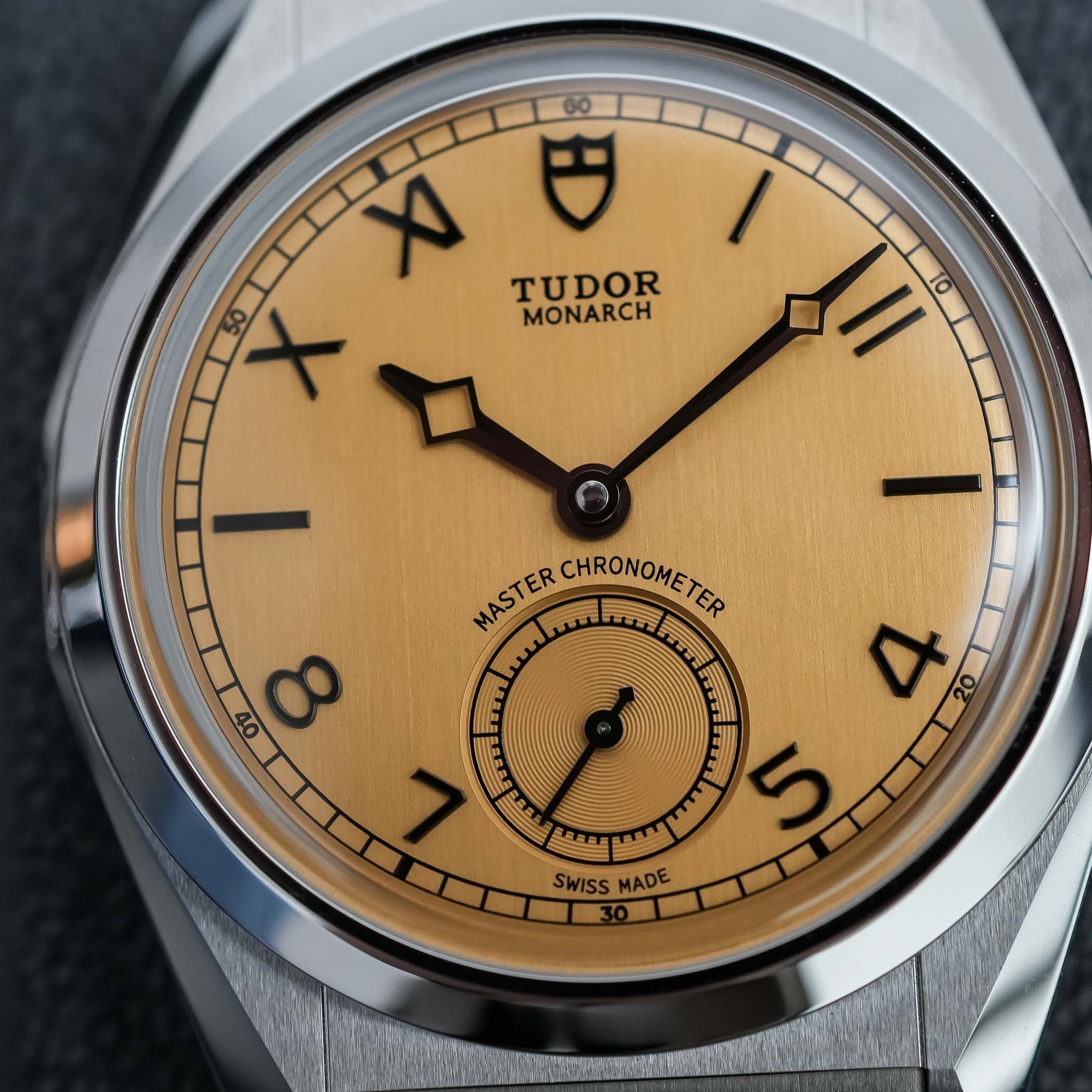 The dial of the Tudor Monarch was quite a surprise, in all fairness. I can imagine that it isn’t to everyone’s liking, but credit where due, it has a certain audacity while maintaining a reassuringly classic feel – and even a bit of the indie vibe we see in a much higher category. The colour of this dial is defined by Tudor as dark champagne, and it is paired with a vertically-brushed finish that gives it an old-school “papyrus” touch. It is quite a bold choice for the launch of this new collection, but the result is distinctive and particularly attractive – at least, within the MONOCHROME team, it got an almost unanimous positive reaction. There’s something unexpectedly traditional and horological in this colour, which isn’t what Tudor used to do in the past 15 years.