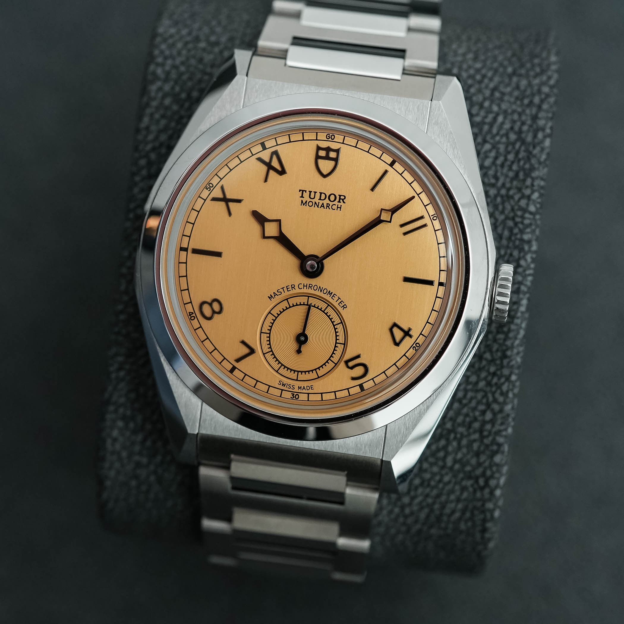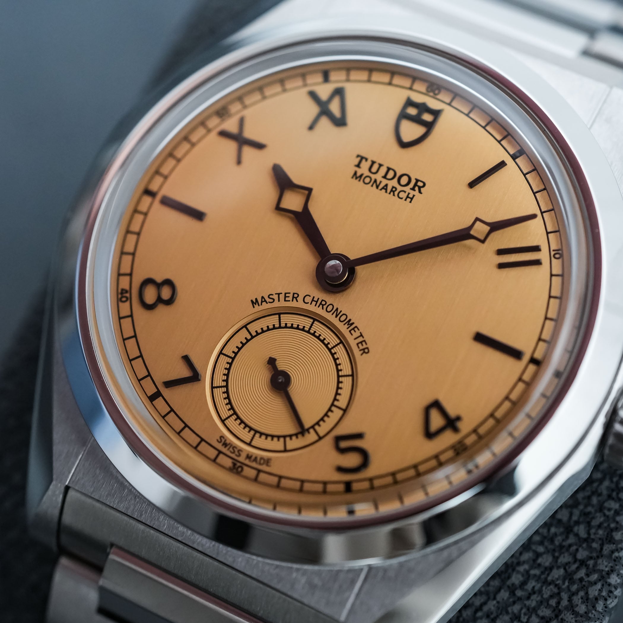 Another distinctive element of the Monarch’s dial: its applied markers. For this launch model, Tudor chose a classic layout that might be more Rolex-related than classic Tudor, but nevertheless reassuringly familiar, a so-called “error-proof” or “California” dial. Framed by a railroad minute track, the dial relies on a combination of Roman numerals from 10 to 2 and Arabic numerals from 4 to 8, with the applied Shield at 12 and baton markers at 3 and 9 o’clock. These markers are applied, thin and blackened, adding great depth to the dial. Another element that surprised was the hands, which feel like dressed-up, old-school versions of the classic Tudor snowflake mixed with Breguet hands. Last, reinforcing the traditional appeal of the Monarch, it features a small seconds counter at 6 o’clock, and comes without a date window.