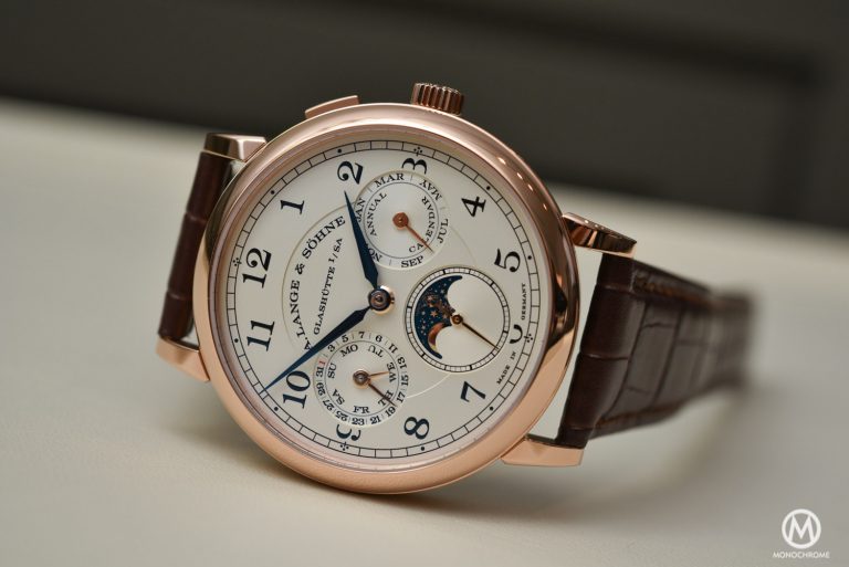 Quick facts: 40.00 mm gold case – hand-wound in-house L051.3 movement with hours, minutes, small seconds, annual calendar and moon phase indication. Alligator strap with pin buckle – EUR 37,500. For more information, visit www.alange-soehne.com.