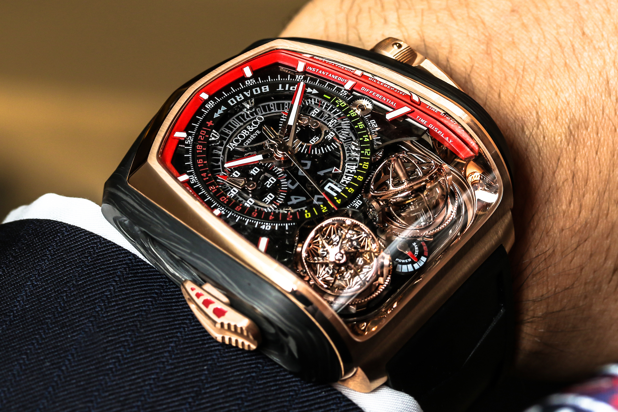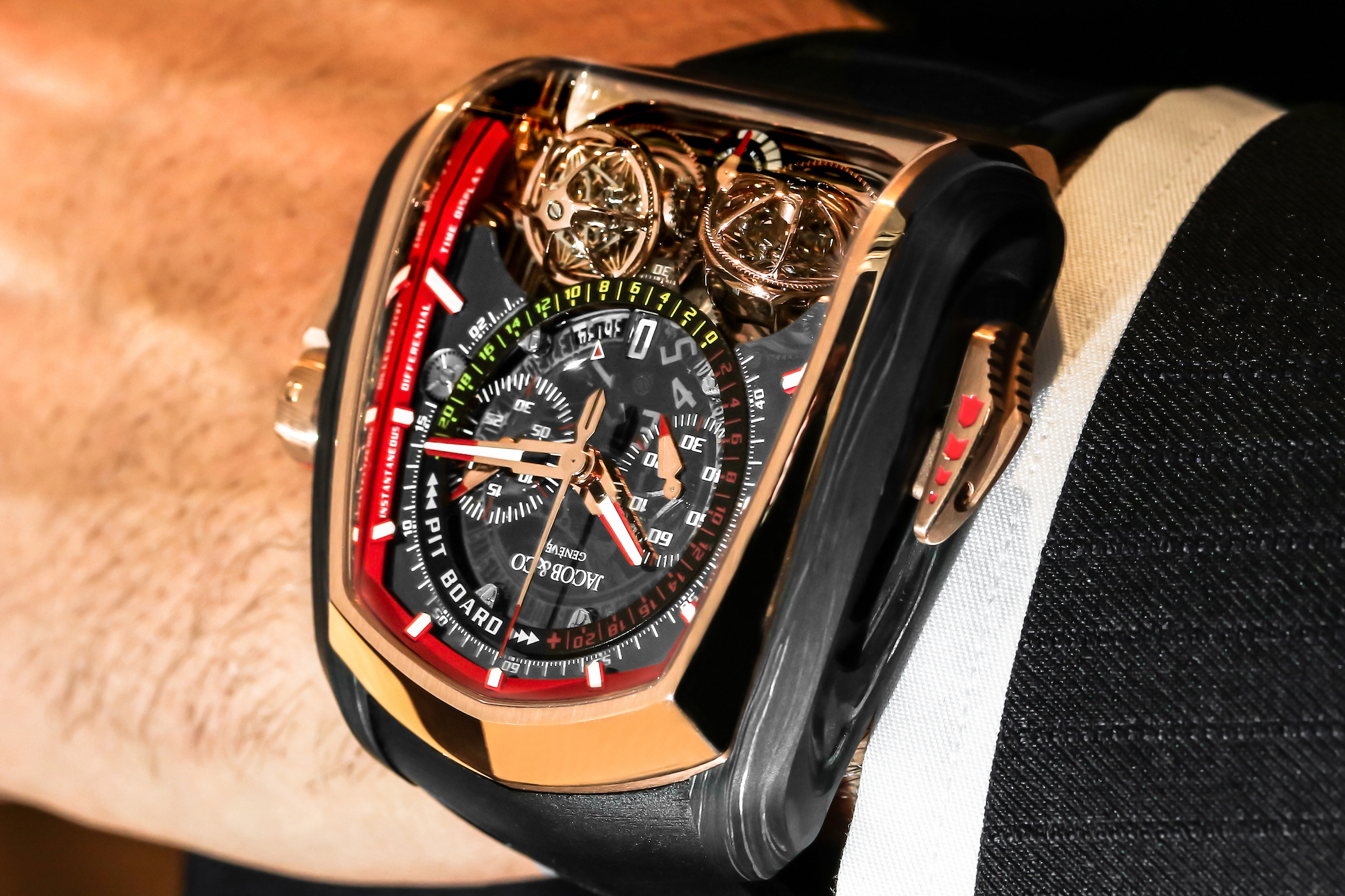 Yes, this watch is flamboyant, exuberant, large and provocative and was designed to be precisely that. Yet, the Jacob & Co. Twin-Turbo Furious is a true mechanical marvel, with its movement comprising no less than 832 parts and 75 jewels. What do you get with this watch? The unique combination of a double triple-axis tourbillon, a decimal minute repeater, a chronograph with ‘reference time indication’ and the time (yes, this can be useful too…)