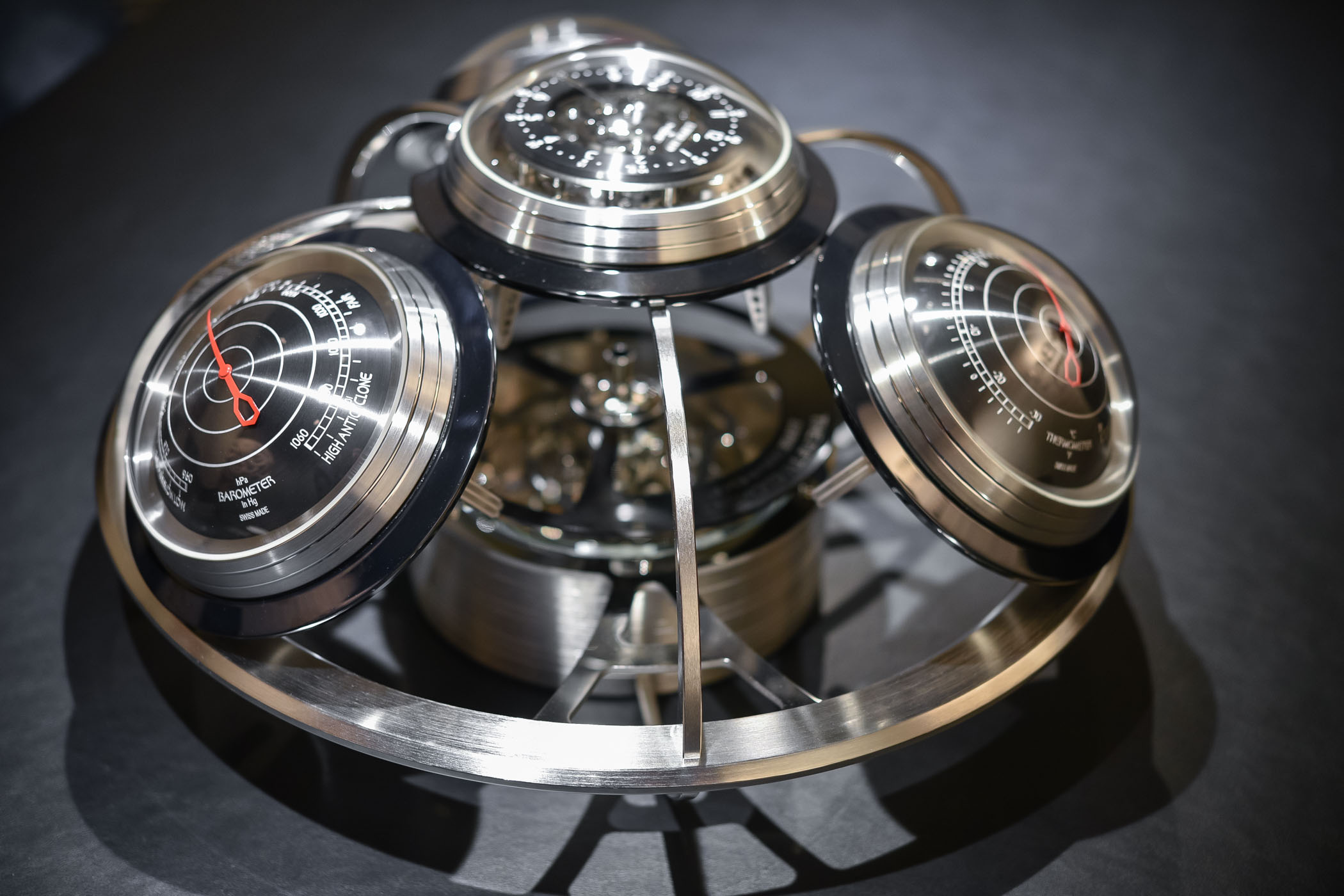 This entirely mechanical piece of creativity, which comprises four separate elements (a clock, a barometer, a hygrometer and a thermometer), is far from old school and could be qualified as an “intergalactic horological weather station”. Again, a nonsensical yet essential object with no other function than pleasure.